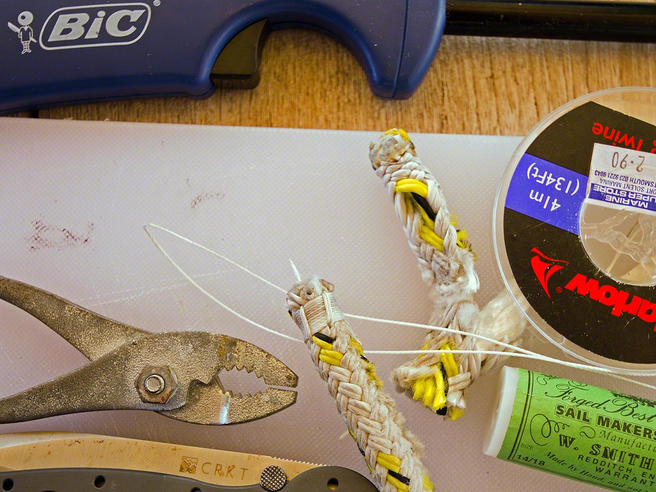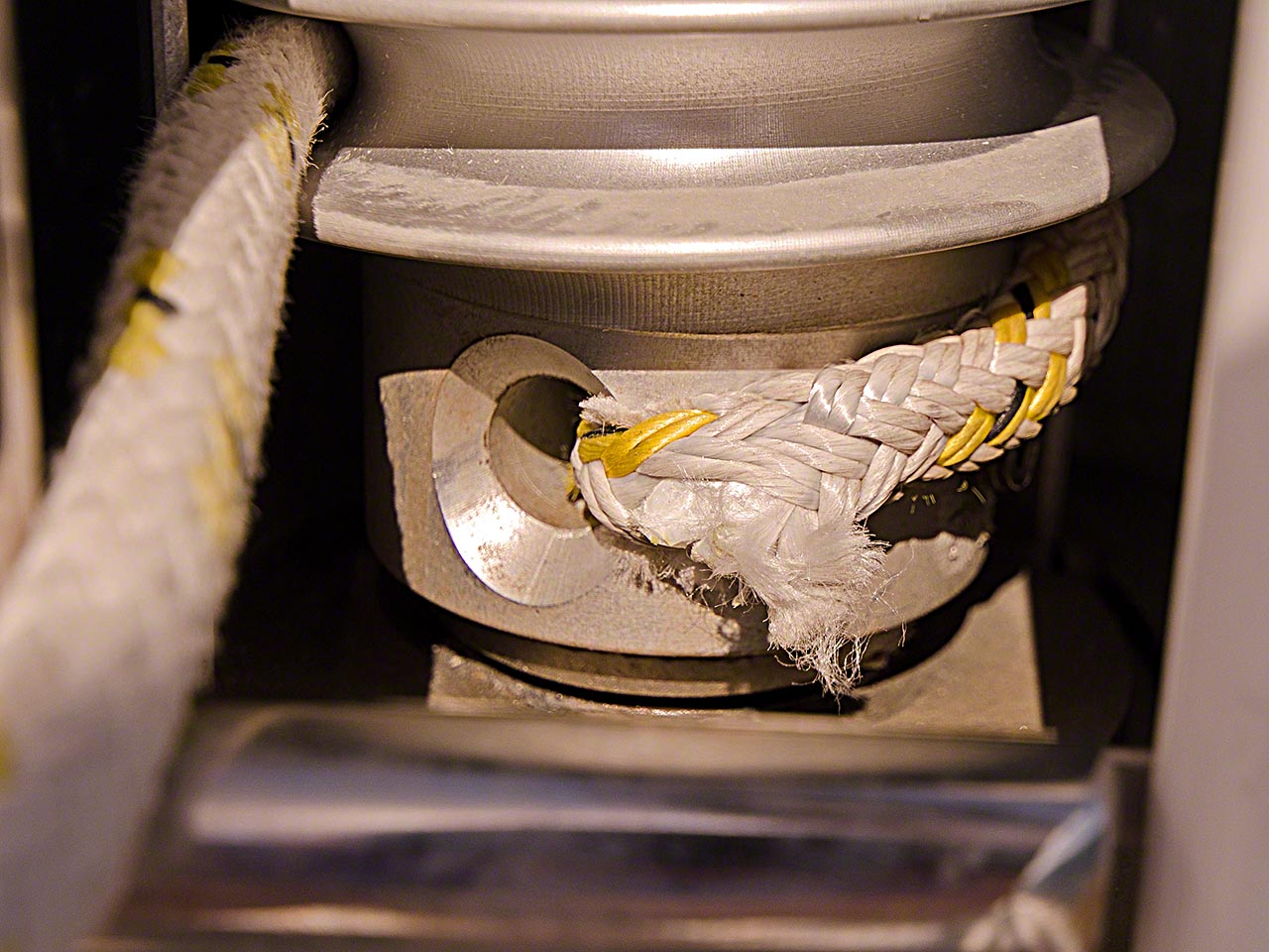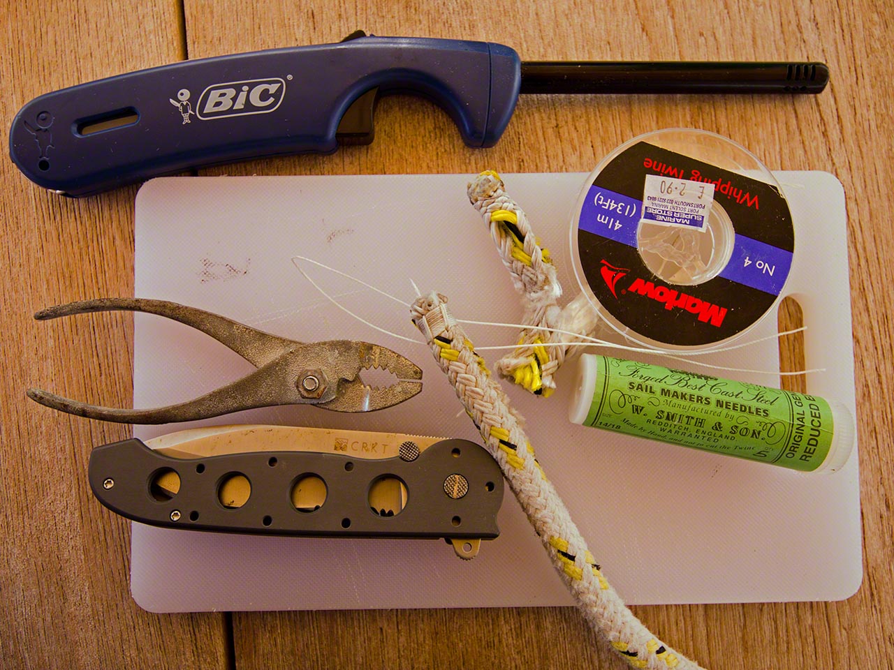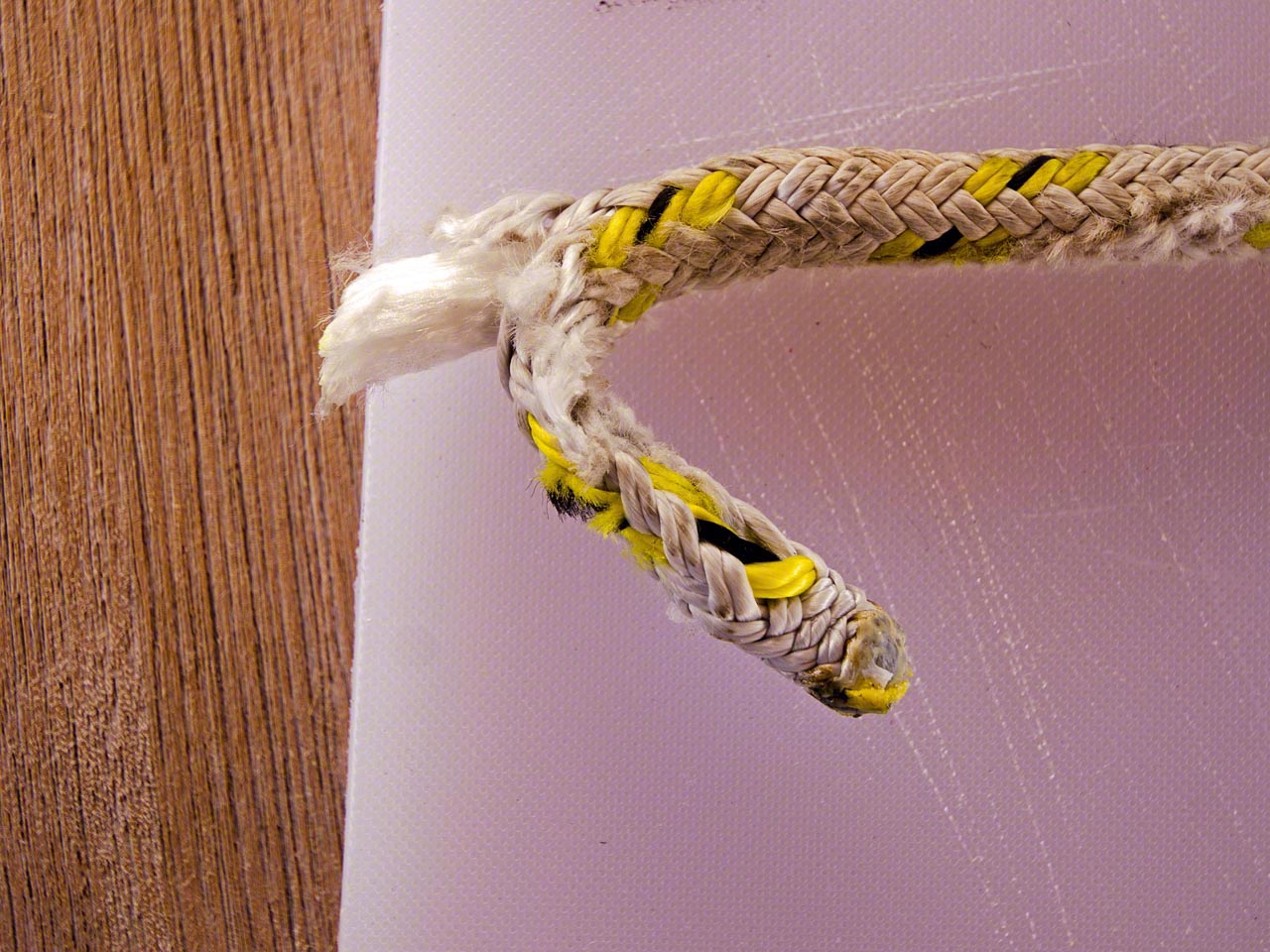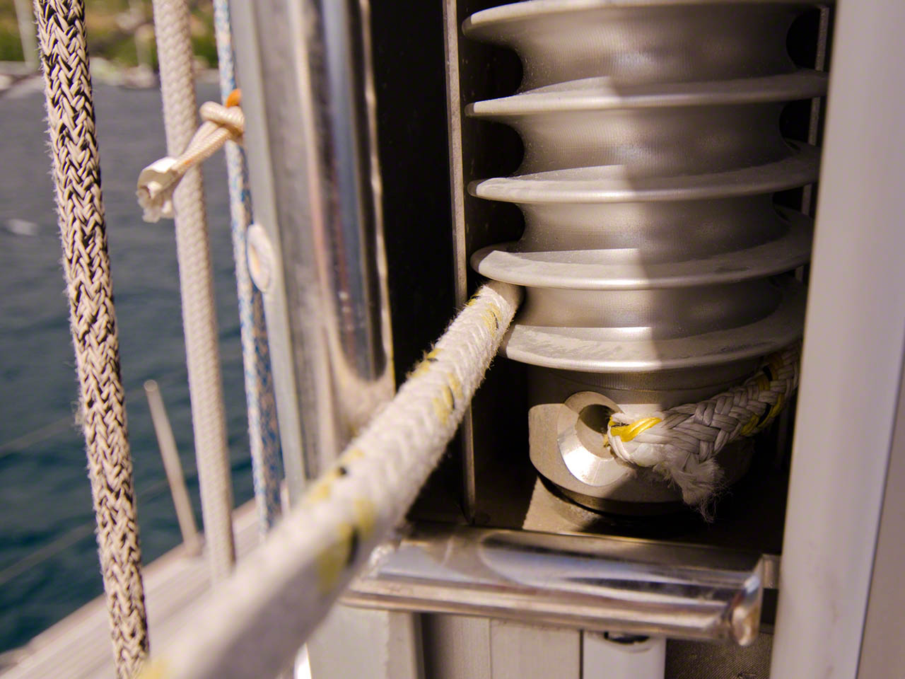 Back aboard I attacked the project of fixing the mainsail furling line, which had chafed dangerously far and which was discovered by Bjorn of “Susanne af Stockholm” – I don’t think I would have noticed that until the line decided to part! After I removed the line I could see that the inner core of the double-braided line wasn’t even attached and that the whole assembly only used the outer mantle and had at best a tenuous attachment to the furling system; it was in fact dangerously close to parting. I cut the bad section out, did a quick whipping to ensure that inner core and outer mantle were securely attached to each other, and re-assembled it with one extra turn on the furling mechanism. This extra turn will allow the whole sail to furled and reduce further stress on that chafe point.