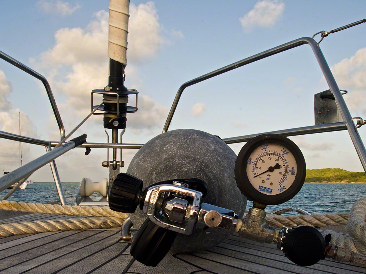 The hull was filthy. Lots of moss/green stuff and juvenile barnacles and little wormy things had made the underside of my boat their home and my mission for the day was to evict them. The first pass was with a scraper to get rid of the razor-sharp growth and shave off the main layer of grunge, then pass 2 was with a green Scotch kitchen pad to lightly get the rest off the hull and hopefully expose a layer of the (woefully inadequate) ablative bottom paint. I managed to exert myself for over an hour and when I came up from the second dive the tank was completely empty, so empty that when I opened the valve to blow air into the regulator cover in order to dry it all I got was a weak wheezing sound!