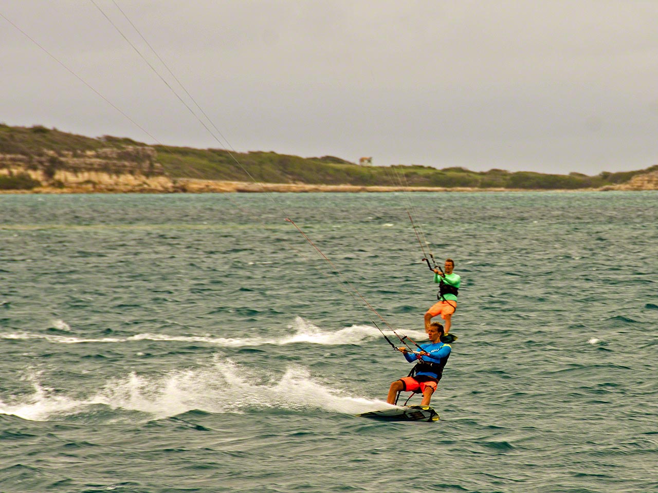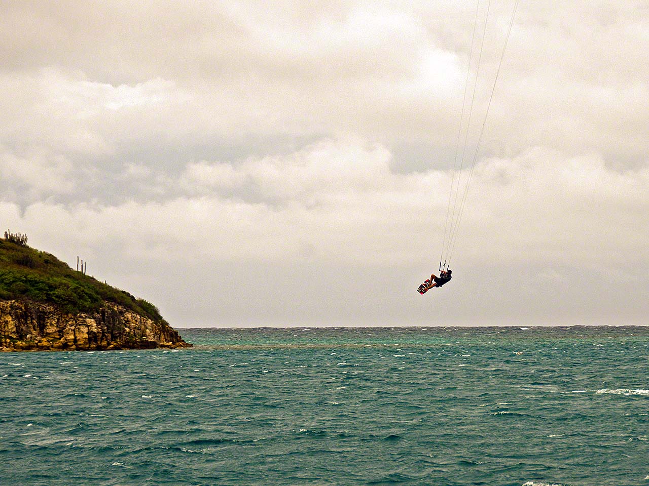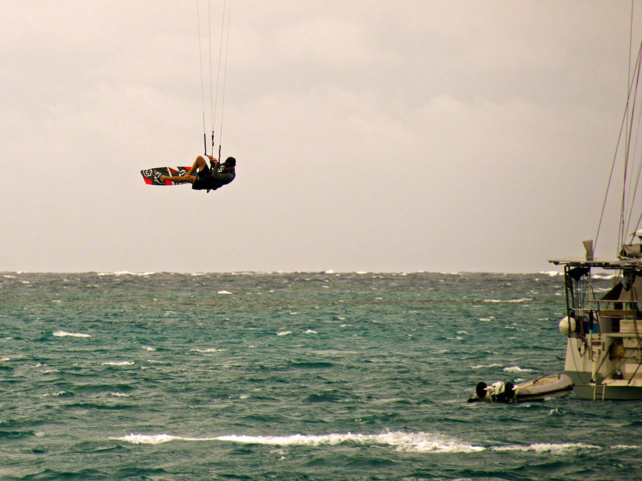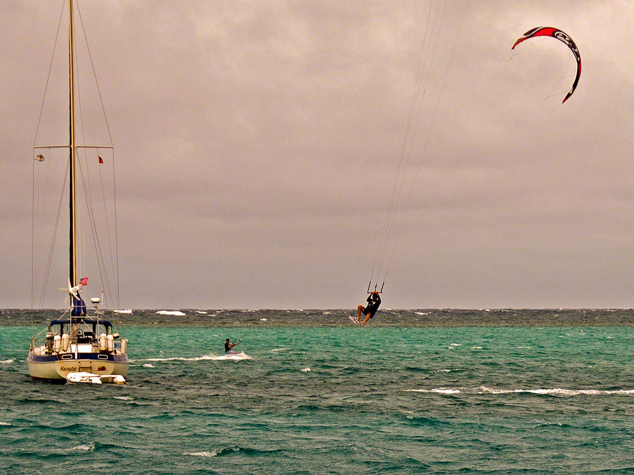 The trade winds set in with a vengeance today. Perhaps the strong winds of over 20 knots all day were there in order to make up for the benign and calm conditions of the previous week, but in any case even the little fetch of the waters inside the reef was enough to make whitecaps. I put my camera in a plastic bag then put that inside my backpack which, in turn, was protected by a large garbage bag. I got into the dinghy and wanted to get some close-up shots of the kite surfers who were making the best of the conditions but even before I released the dinghy painter I was soaked from the waves bashing against it, so I opted to take my pictures from the bow of the boat with my longer lens but most of the good action shots were so blurred as to be useless.