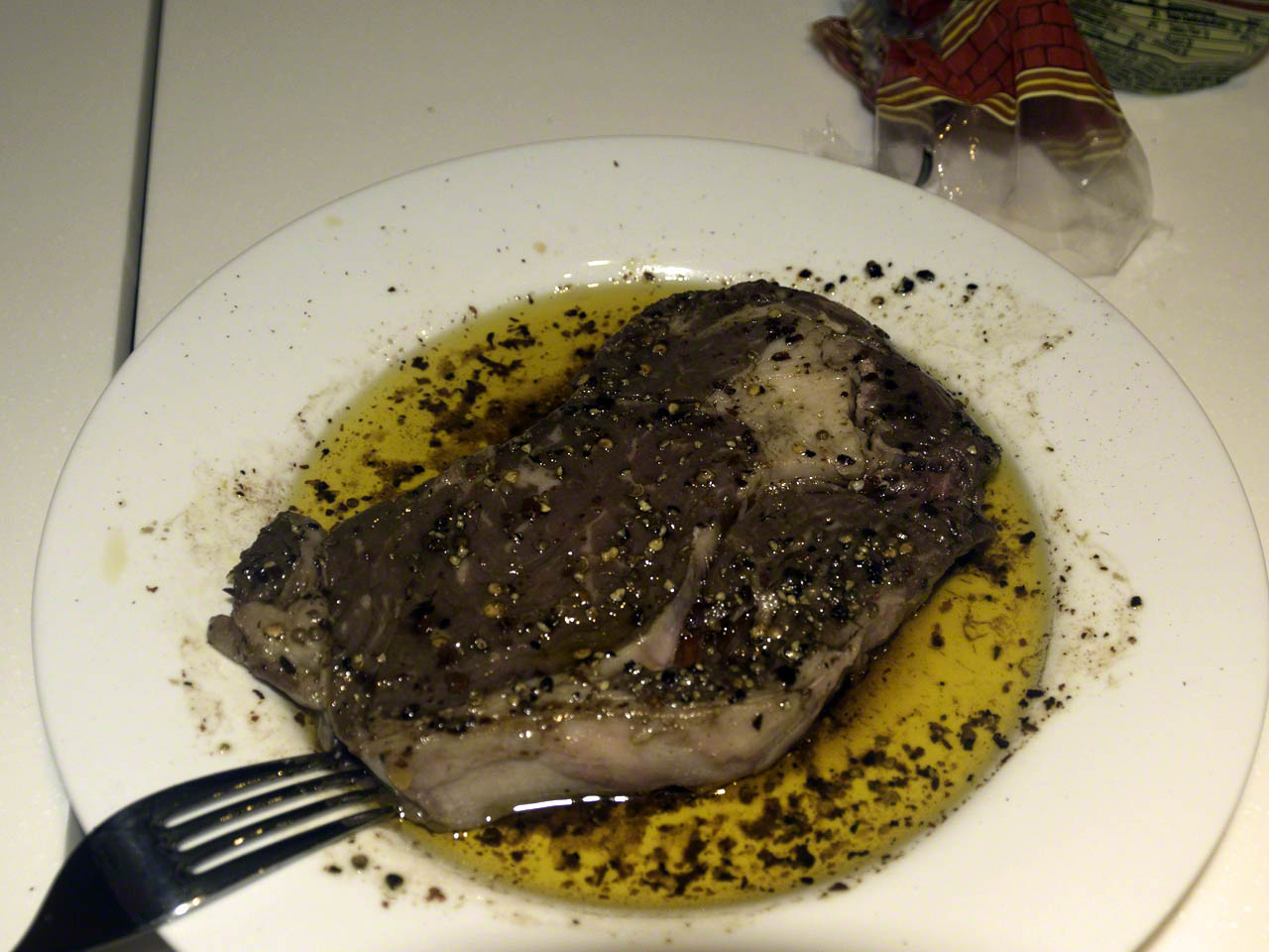 (after dinner) The steak was yummy indeed, just the right amount of fat to make for a juicy BBQ and what is left after grilling can be cut away. I’ve started letting the meat sit about 5 minutes under an aluminum foil cover and have to admit that it makes the steak a lot better than when eating it straight off the grill.
