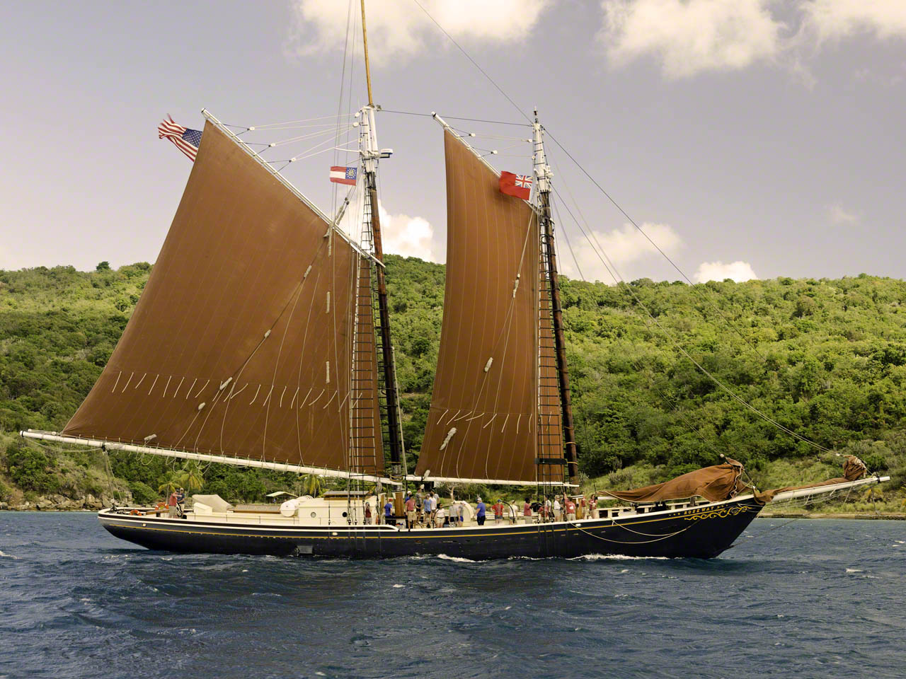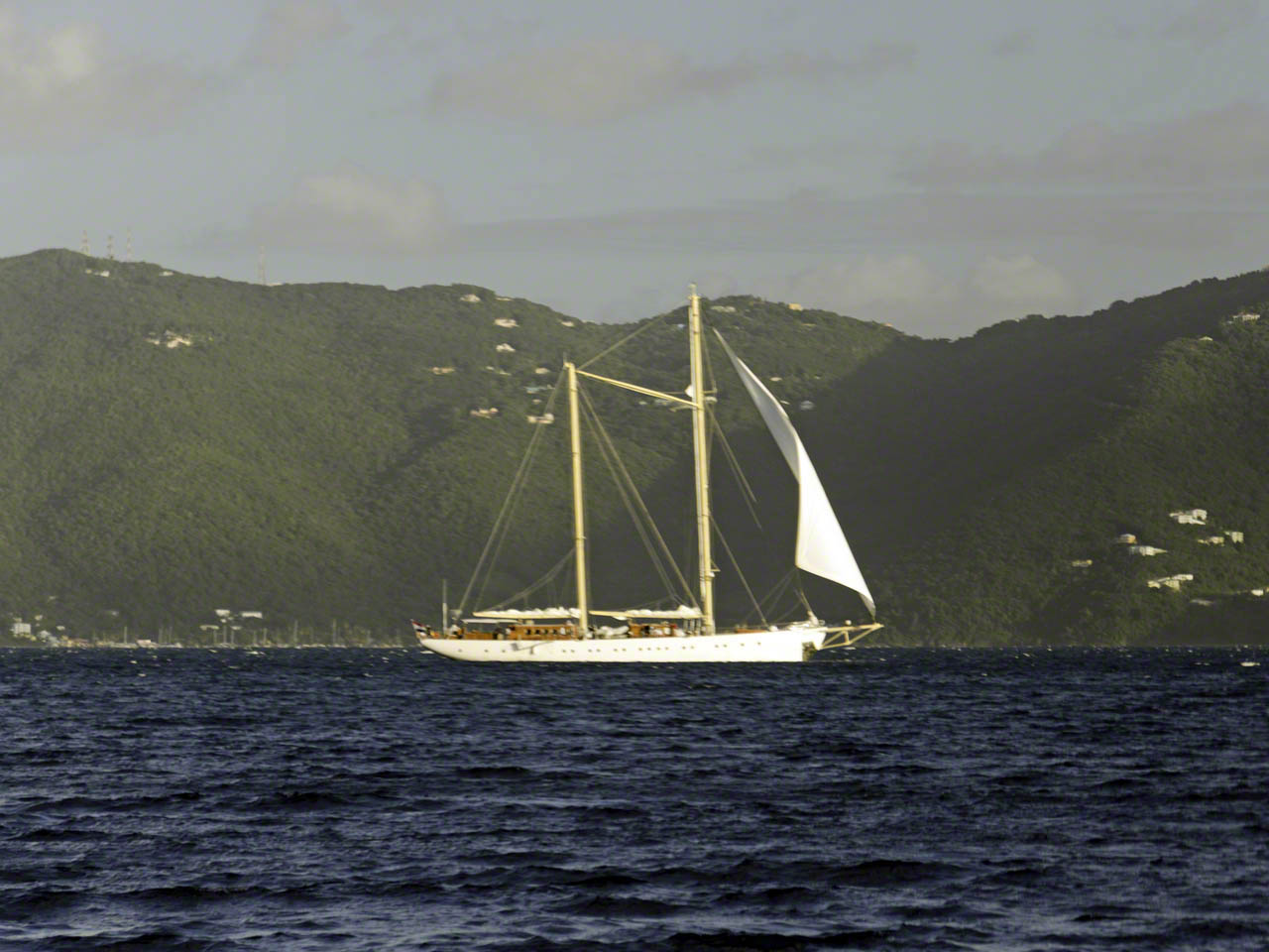 I got going just as the schooner Roseway did and once her sails are up, despite it being a very lengthy and arduous process, she does have a turn of speed and I had been motoring past her with the intent of turning upwind to raise my sails but rather than cross her bow I did a 360° turn to get behind her in order to turn myself from a powerboat into a sailboat. I only put up small sails for the short run across the wind to Great Harbour on Jost van Dyke. Once there, I proceeded to anchor – a process that took a very long time today. The first time I found an area of only 20 feet depth behind another anchored boat way outside and, despite having 80 feet out, could feel the anchor bouncing and scratching merrily along the bottom with nary a chance of catching hold. I raised anchor and tried again in another shallow spot with the same marked lack of success. The third go I decided that the top of a dead read wasn’t going to work for me and dropped anchor in 30-40 feet and at first I thought I’d have to to try again as the anchor dragged but then it held and in the end I put out 200 feet of chain just to be on the safe side, since dragging would put me on the rocks on the western edge of Great Harbour