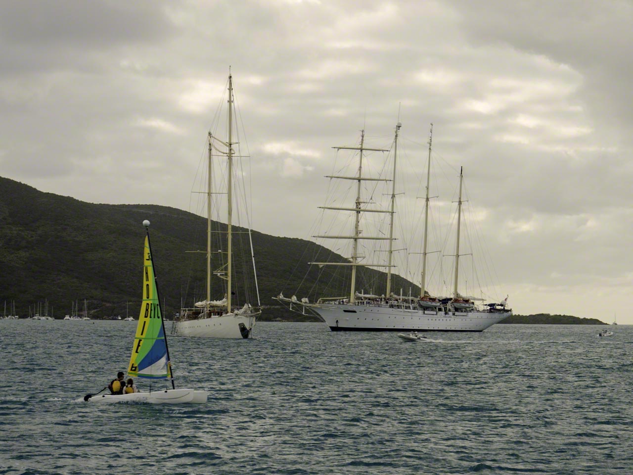 In the North Sound I anchored in my favorite location off Prickly Pear. The strong current makes the boat point straight into the wind and there is hardly any “sailing” at anchor as there is elsewhere and, apart from the occasional wake from the Saba Rock Ferry or other fast-moving work boats, it is a very solid anchorage and sometimes one can imagine being on terra firma rather than on water.