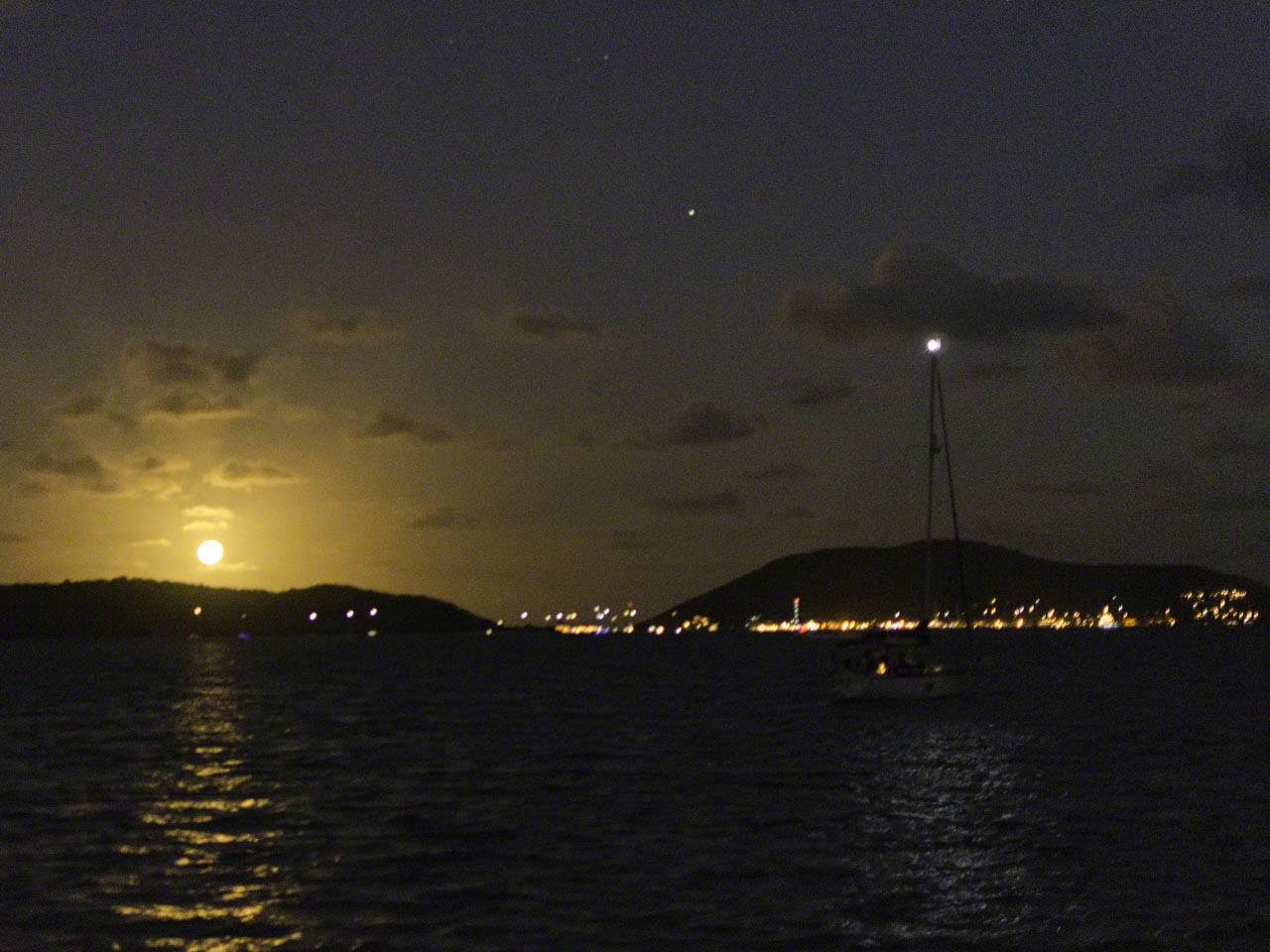 I finished watching the movie on my notebook and then sat and watched the moon slowly traverse up the night sky before repairing to bed at a respectable hour for a boatie – 22:30.