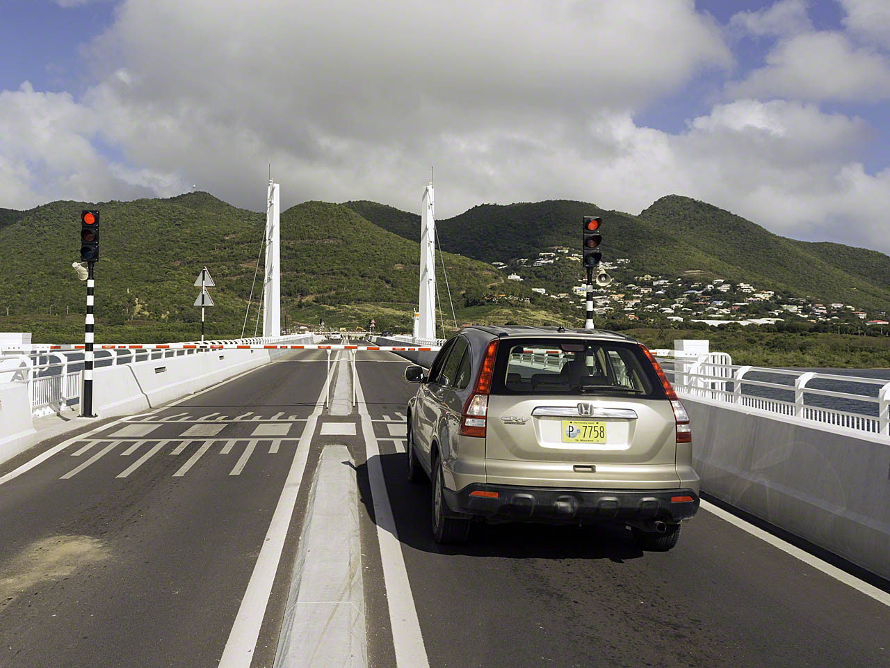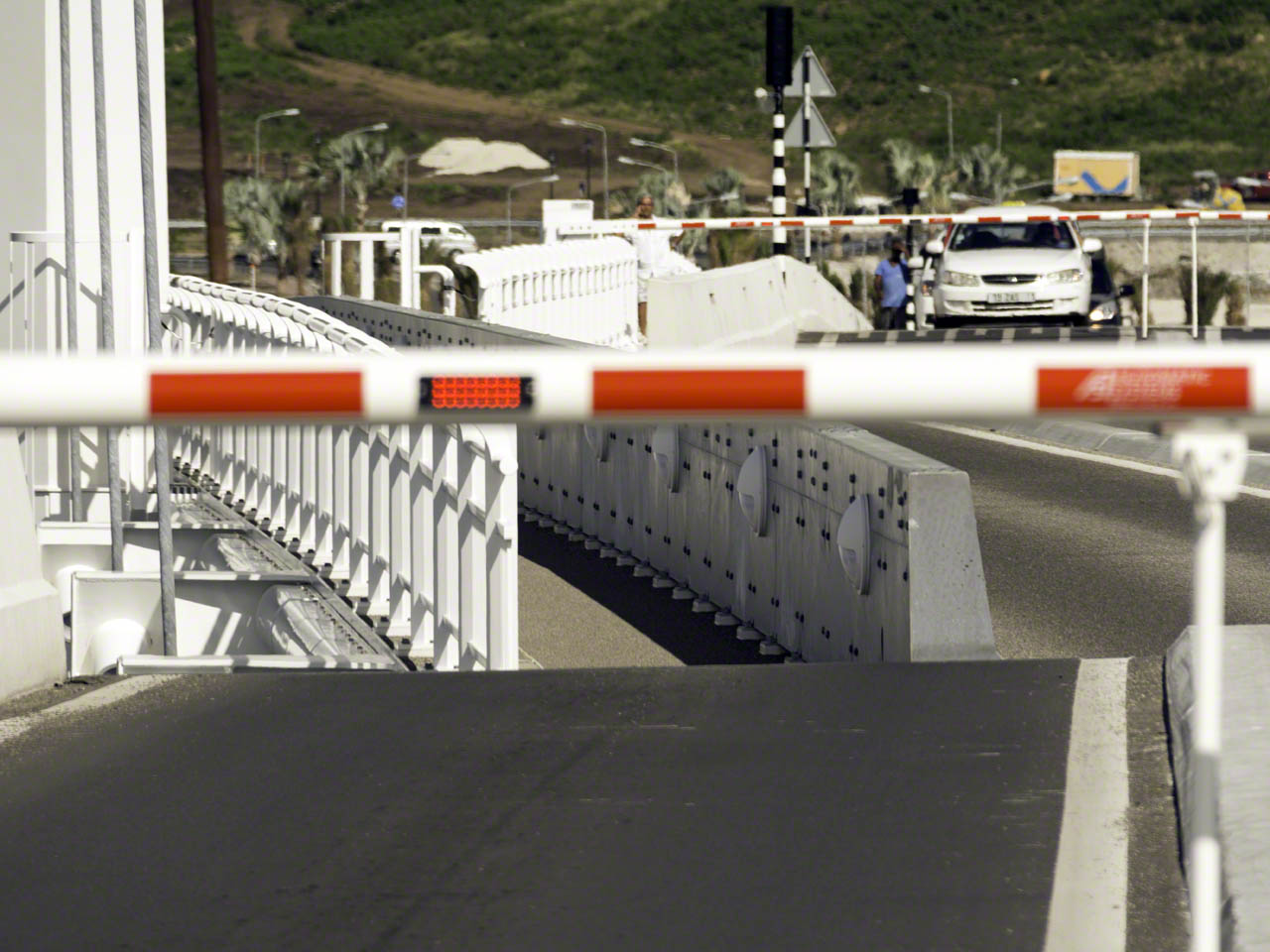 I then drove over the causeway bridge to the airport side and called Carmen on Bernd on the VHF to confirm our dinner arrangement that evening and the returned across the bridge. I was, I though, in luck – I ended up being the second car in line at the barrier and whipped out my camera to get an “action shot” of the process and the lone cruising boat waiting to pass. The bridge turned, the boat went through, the bridge turned shut again and the barriers…. remained down. 2 minutes. 5 minutes. 10 minutes. I got out to see what was happening and soon realized that the two bridge tenders had done the same and were moving around in a concentrated manner that told me that things weren’t going well. I noticed that the bridge wasn’t quite closed and that there were a good 20 centimetres separation along the center line between the mobile and stationary portions of the bridge. Not good. After a length wait the two gents ended up climbing down a ladder (access to which they had to unlock) and at this time I opted to do a U-turn and go the long way around. This choice was a wise one, as the bridge was still closed to traffic at 19:30.