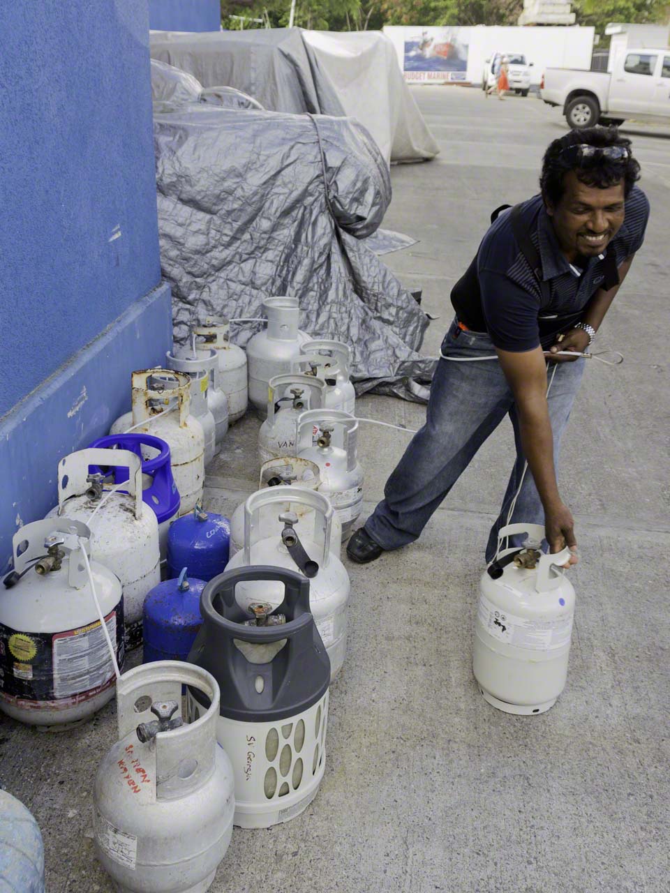 Today was a bit more varied than the previous ones and involved elements of action, suspense and excitement. It began with the morning radio network, as usual; but then I realized that I needed to get to Budget Marine by 09:00AM in order to drop off my empty propane tank for refilling and the network ended just before 08:00. I got ready and into the dinghy by eight and then had the long walk to the remote parking location by the airport which I did in double time and found my car, unscathed, but all alone along the roadway. I got going and chose to go around the long way in order to avoid the congestions around Marigot and was soon stuck behind a convoy of slowly moving cars behind a truck which seemed to have only 2nd gear and was crawling around the curves and up the inclines. Due to oncoming traffic and the size of the truck I knew that we weren’t going to pass this behemoth of the streets and I had that sinking sensation of knowing that I probably wasn’t going to make. Then our convoy turned a corner and caught up to a much shorter convoy behind a construction site backhoe and my fear of arriving too late turned into certainty. As there’s only one road there was no hope of finding a shortcut or other route so I gave up on refilling propane and turned up the radio and relaxed. But soon thereafter the truck turned off and just a few meters further the backhoe driver had mercy on traffic and pulled aside to let us pass and soon I was making sufficient progress to have a faint glimmer of hope. Traffic around the Cost-U-Less store is always congested but I’d already planned that in and I finally made it to Budget Marine at 09:05AM and they graciously let me pay and put my tank amongst the others waiting for pickup.