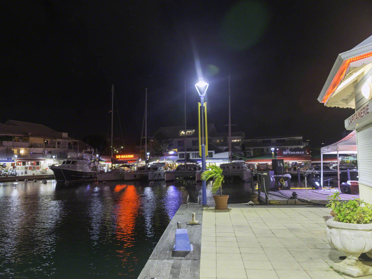 While the weather didn’t calm appreciably after sunset I went ashore and walked around the waterfront for a bit, then opted to eat at Le Spinnaker inside Port Royal and was surprised to see a small floating dock attached to the Capitainerie with some musicians playing music for the folks at the various restaurants there. The saxophonist was excellent, as was the food.