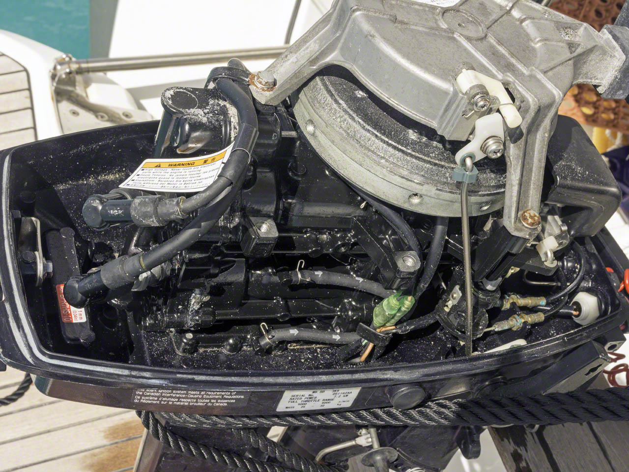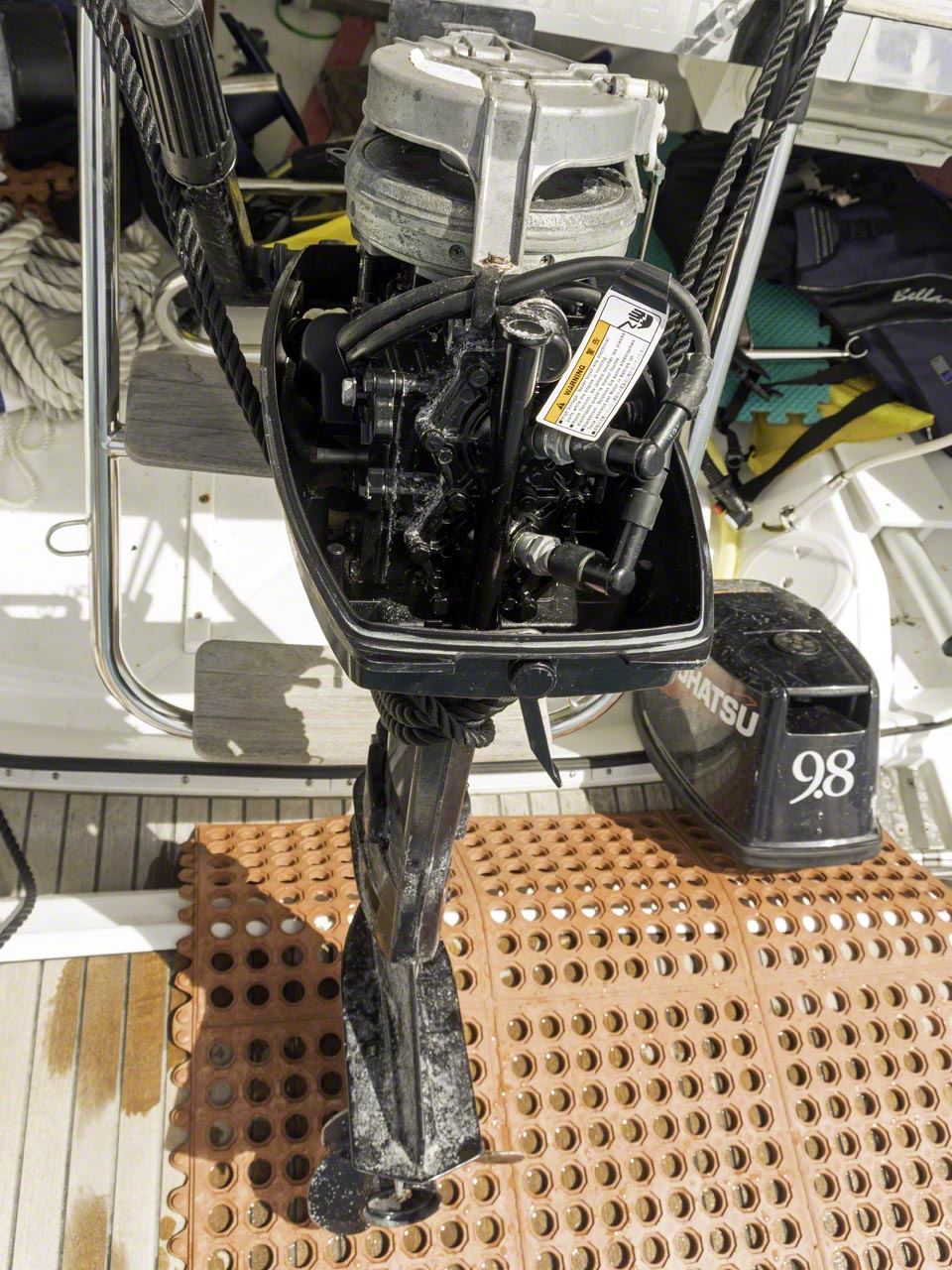 Back aboard the boat I decided I really needed to get those stabilizing fins onto the outboard and got to work. The outboard had to be taken off the dinghy and I had some mats laid out on the transom. Despite the rolling around of both dinghy and boat I got the engine up on the transom and then immobilized it with some line. While it was drying out I cleaned the engine exterior a bit and gave it another dose of WD-40 and then put together my complicated Dremel gear. It starts with a 220V extension cord to a massive 220V/50Hz to 110V/60Hz convert and from there a 110V cord goes to the Dremel. Of course, after I got everything readied I realized that my bolts are 5/16″ and the biggest Dremel drill I have is a mere 1/8″. I finally got the 4 holes drilled into the dinghy’s aluminium housing and then used the Dremel router to expand the hole size. I found out while drilling the 3rd and 4th holes that my drill bit was for wood, not metal since it no longer did much except make noise. The next size down drill bit had to see some use and is probably now shot as well. But the 4 holes were now drilled and the bolts fit into them so the project was complete, except for the lengthy cleanup process which I am effectively procrastinating by writing this blog entry.