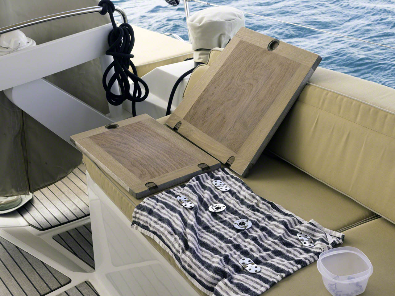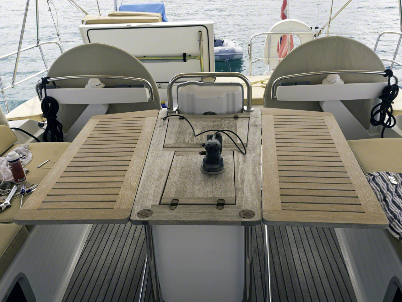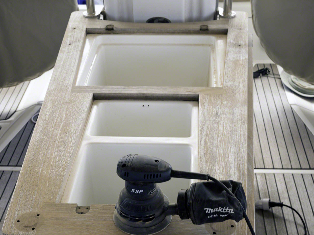 I felt energetic enough today to start and finish one of the projects on the list and since climbing the mast was out of the question I opted to go for the cockpit table project. I had stored Zanshin the first season without a cover on the teak cockpit table and the heavy rains and sunshine had combined forces to pit the table and I’d also left my aloe vera plant on the table at that time so there was a ring of unpitted, but blackened, teak to deal with as well. I had purchased a small orbital sander at the French hardware store weeks before with some sanding pads and planning giving that a whirl.