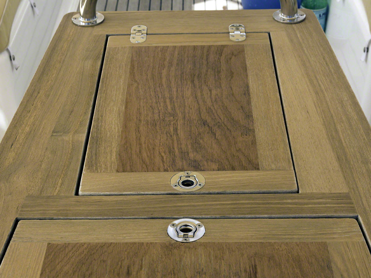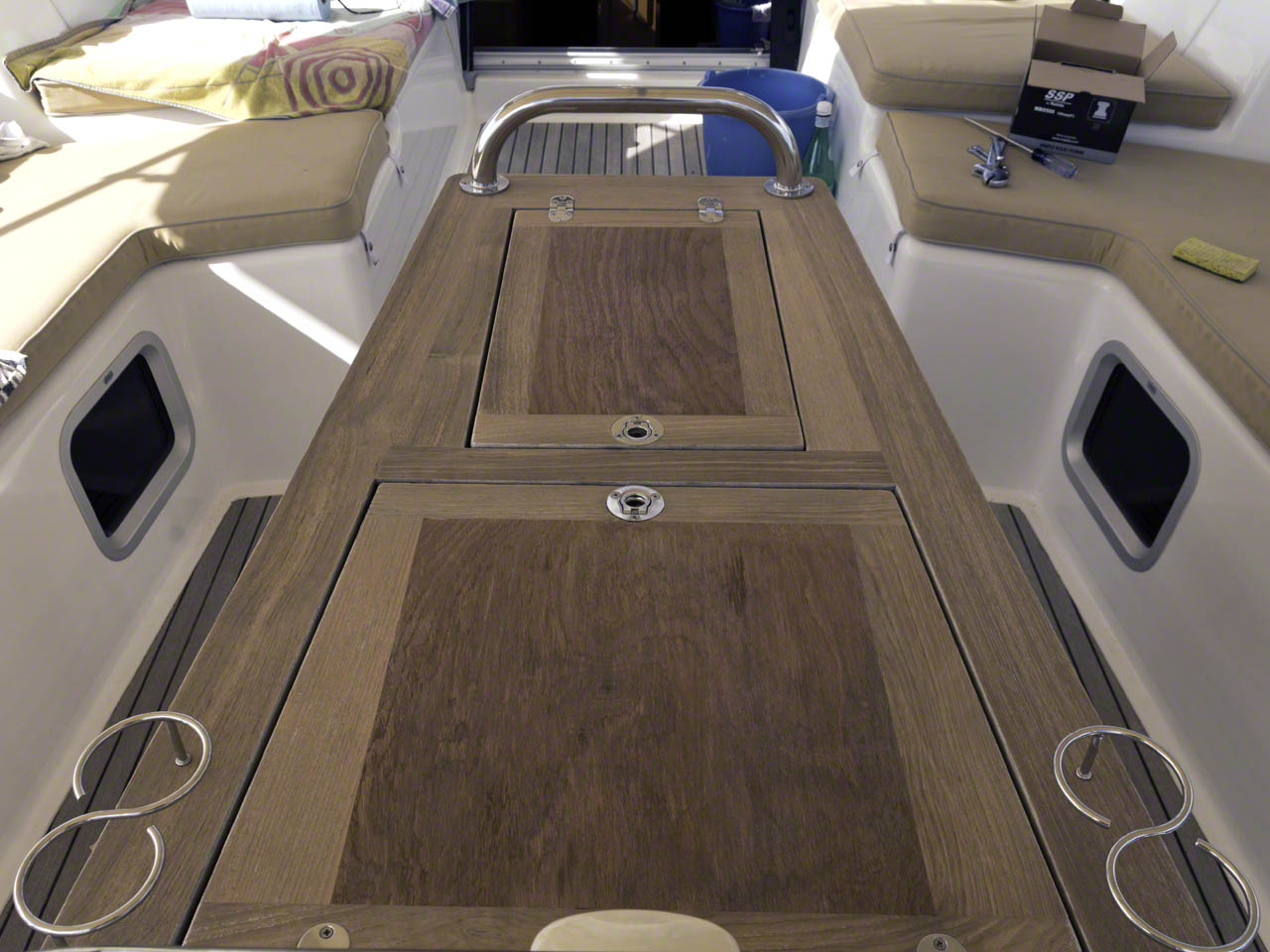 Putting the hinges and latches back on was a simple task (I polished and lubricated them and had kept their positions marked so they would fit again) but the large metal grab-bar held down with 3 bolts on each side proved a different matter, since these bolted to the 2 supports on the cockpit floor and those were made of big-diameter stainless and had to be twisted/pulled into place so that the bolts would fit. The first side was OK, but getting the second side to match up had me worked into a sweat before I got some help from some spare line and Mr. Winch.