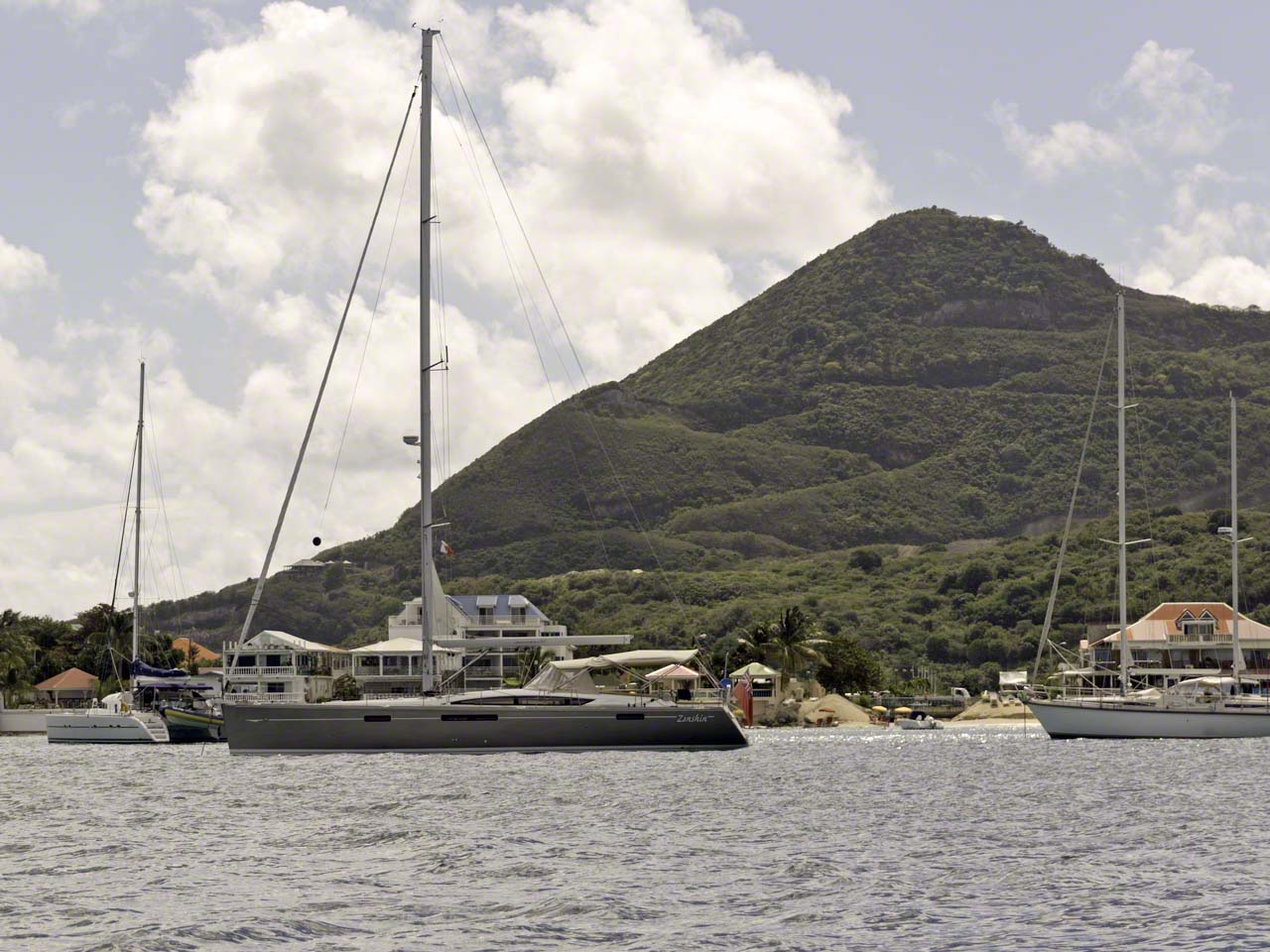 I took him back to his boat, a Hylas 54 whose name didn’t escape me because the boat was newly painted and yet to have a name placed on it. I offered to take him around the shoreline to search, since theft during the day is quite rare in Grand Case (unlike other locations on the island). He said he’d scan the shoreline with binoculars from the boat first and I waited while he scanned and success, there on far shoreline of Grand Case was a dinghy on the beach. We motored over and it was indeed their dinghy! I recalled the time I’d thought my dinghy was stolen at the inside marina in Marigot, when the cause was just my bad knot tying. This was a case of the lock opening and letting the dinghy drift.