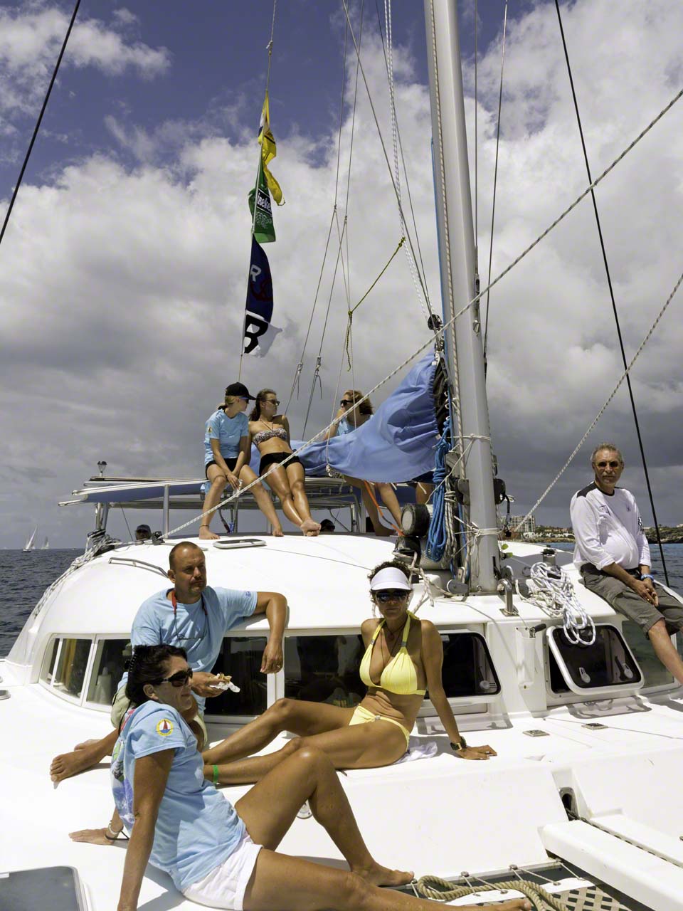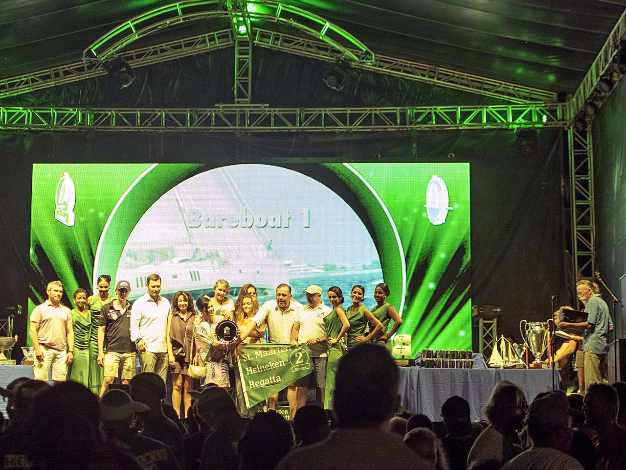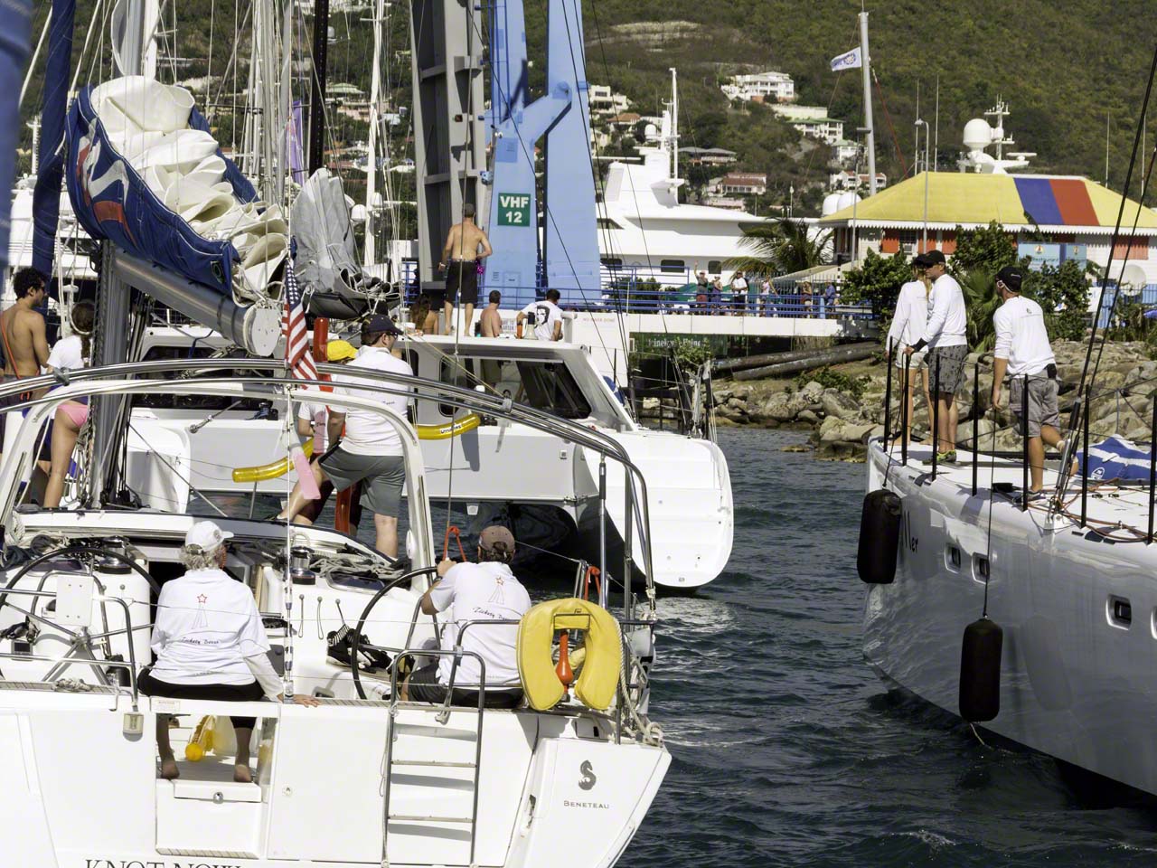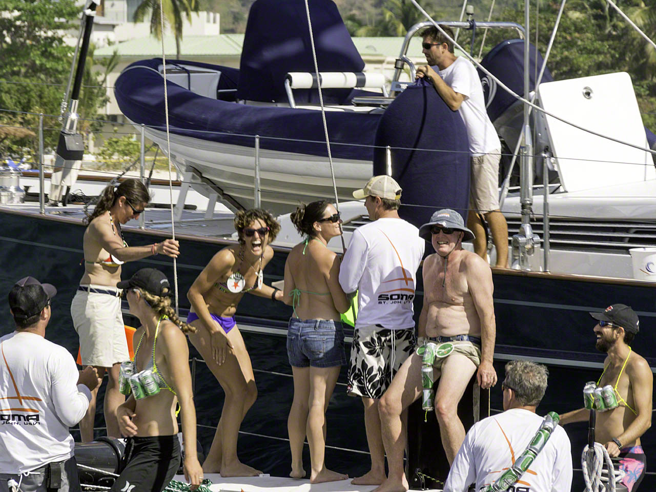 Once the races were over we entered the melee of yachts jockeying for position to enter the lagoon during the special bridge opening and many of them were putting on shows for the “judges” watching from the balcony at the Simpson Bay Yacht Club. We had Elvis hanging from a bosun’s chair on the Gunboat Elvis and some of the boats had impromptu costumes arranged as well. Although we didn’t do anything special except blow our horn (I got some more air-time on the dual horns and pretty much emptied the air from the dive tank) we did have a number of very attractive ladies aboard so I gather that we got a very good score from our Heineken judges upon entry.