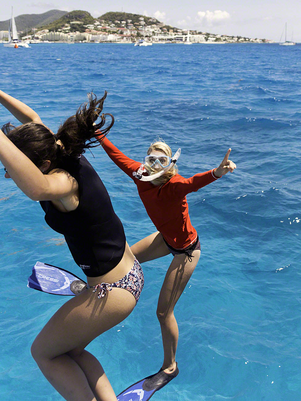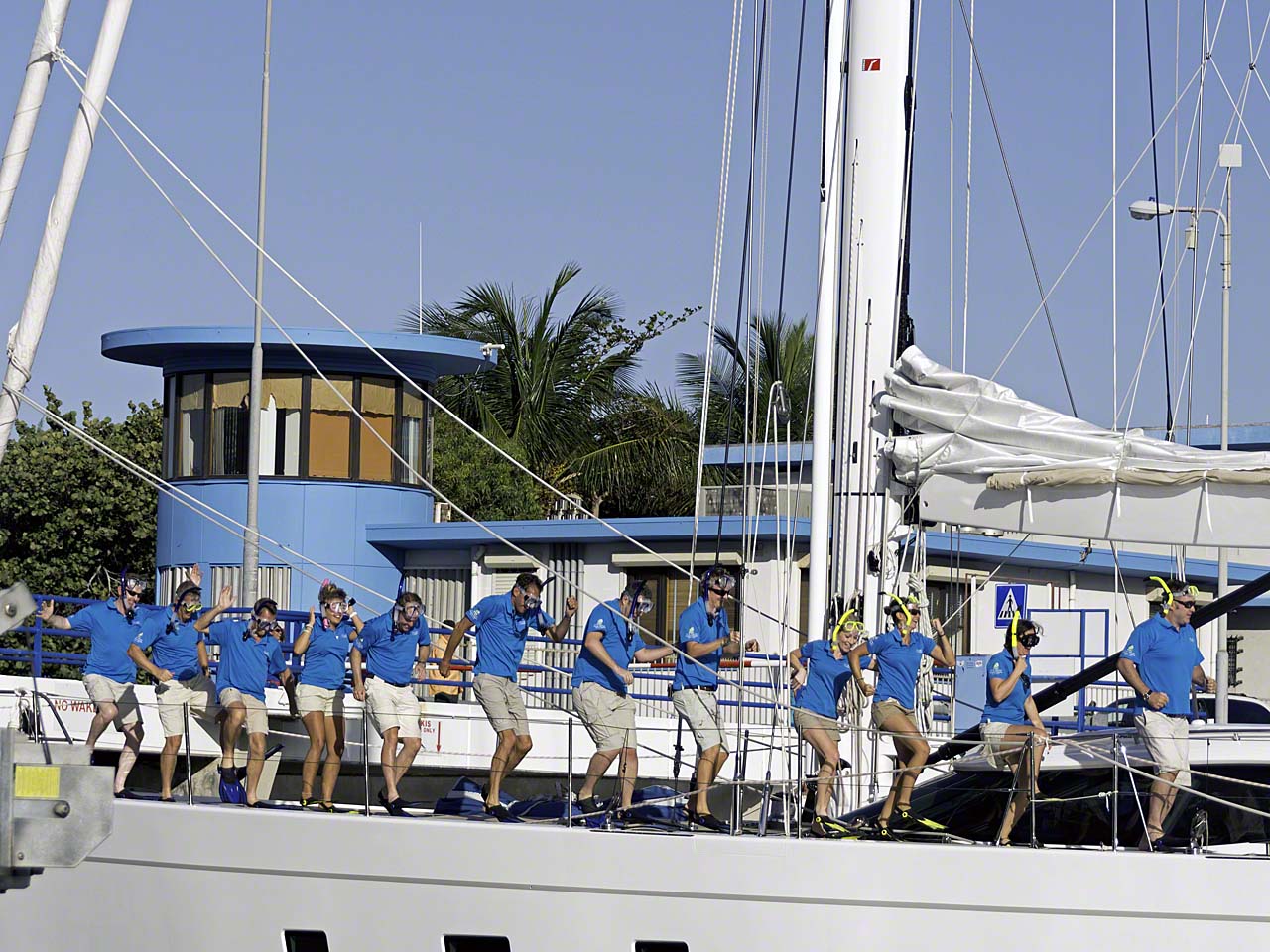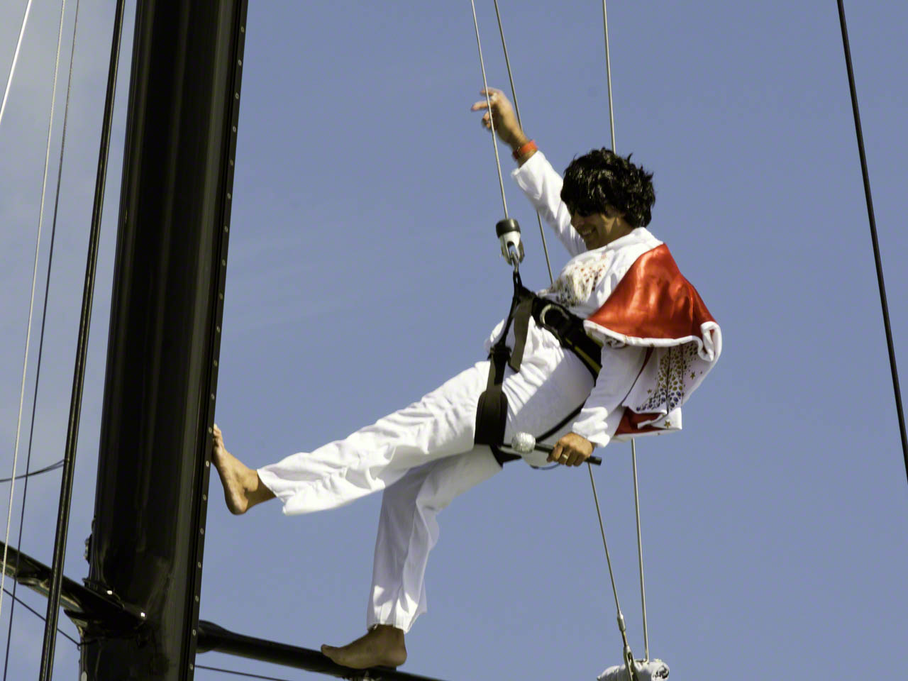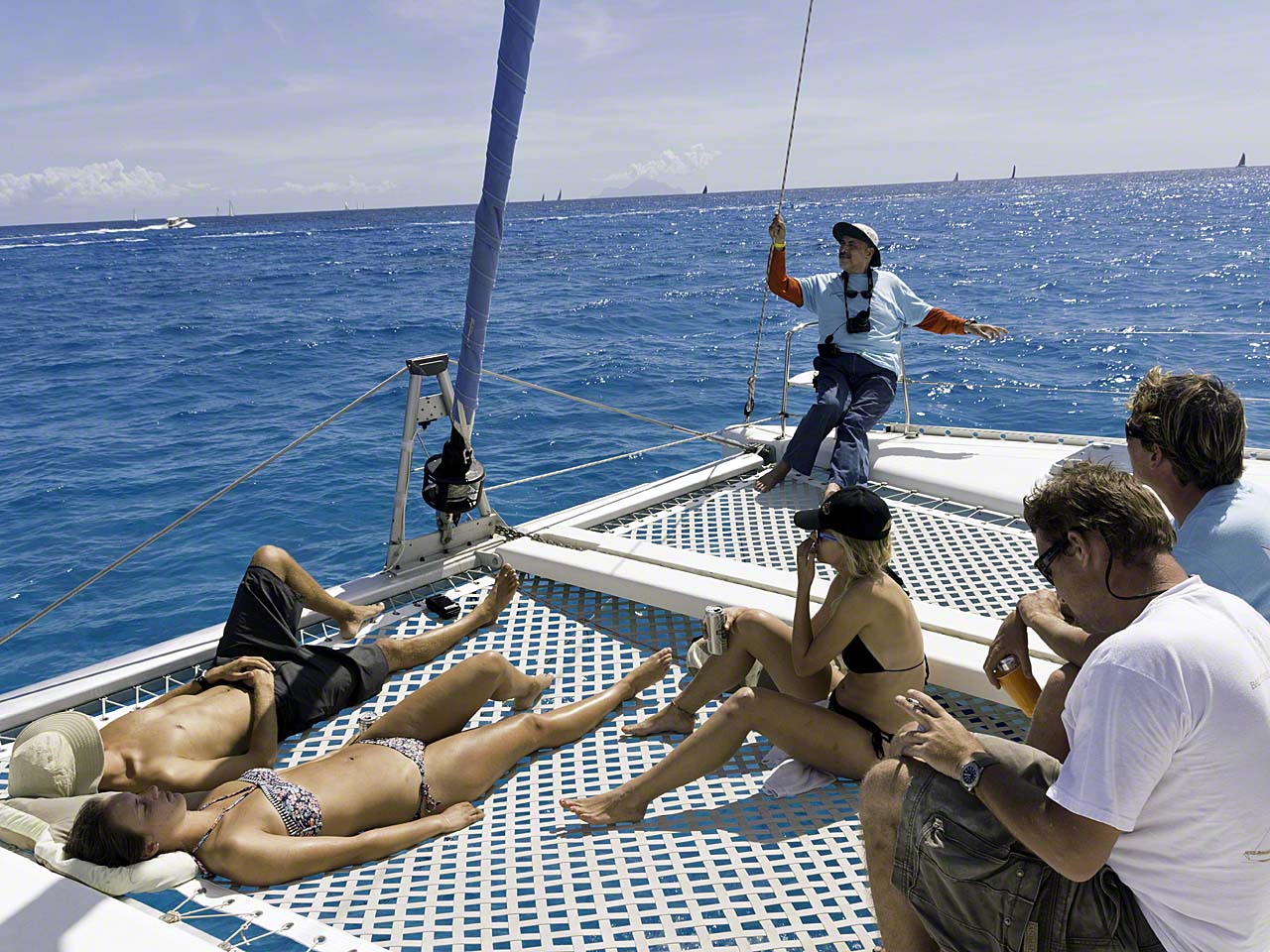 Once the races were over we entered the melee of yachts jockeying for position to enter the lagoon during the special bridge opening and many of them were putting on shows for the “judges” watching from the balcony at the Simpson Bay Yacht Club. We had Elvis hanging from a bosun’s chair on the Gunboat Elvis and some of the boats had impromptu costumes arranged as well. Although we didn’t do anything special except blow our horn (I got some more air-time on the dual horns and pretty much emptied the air from the dive tank) we did have a number of very attractive ladies aboard so I gather that we got a very good score from our Heineken judges upon entry.