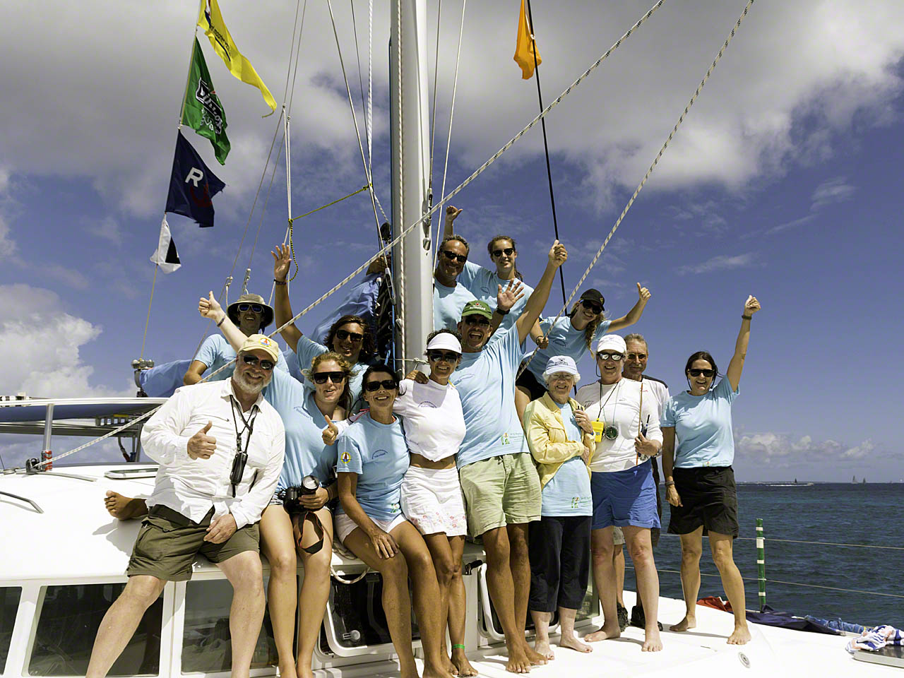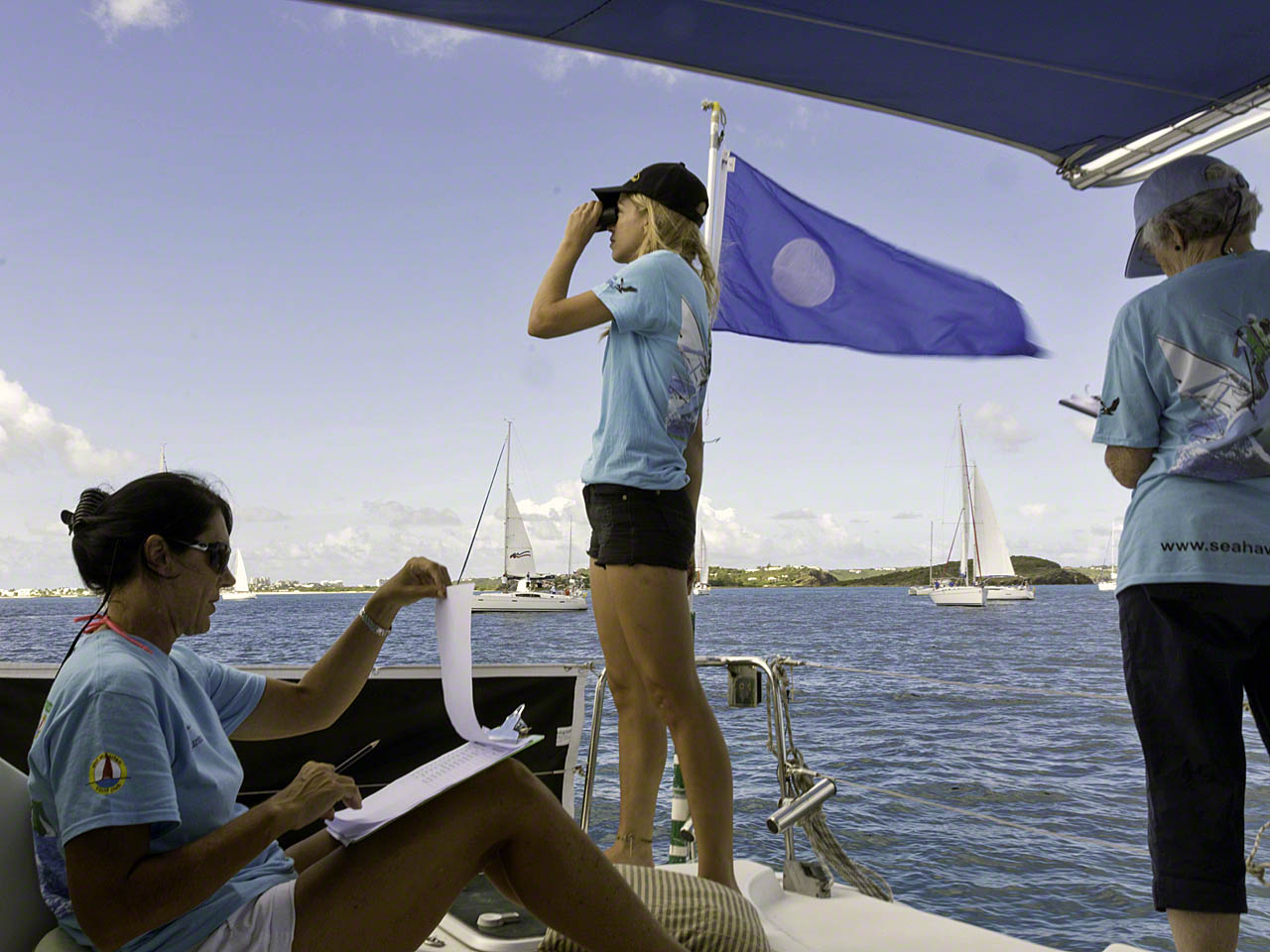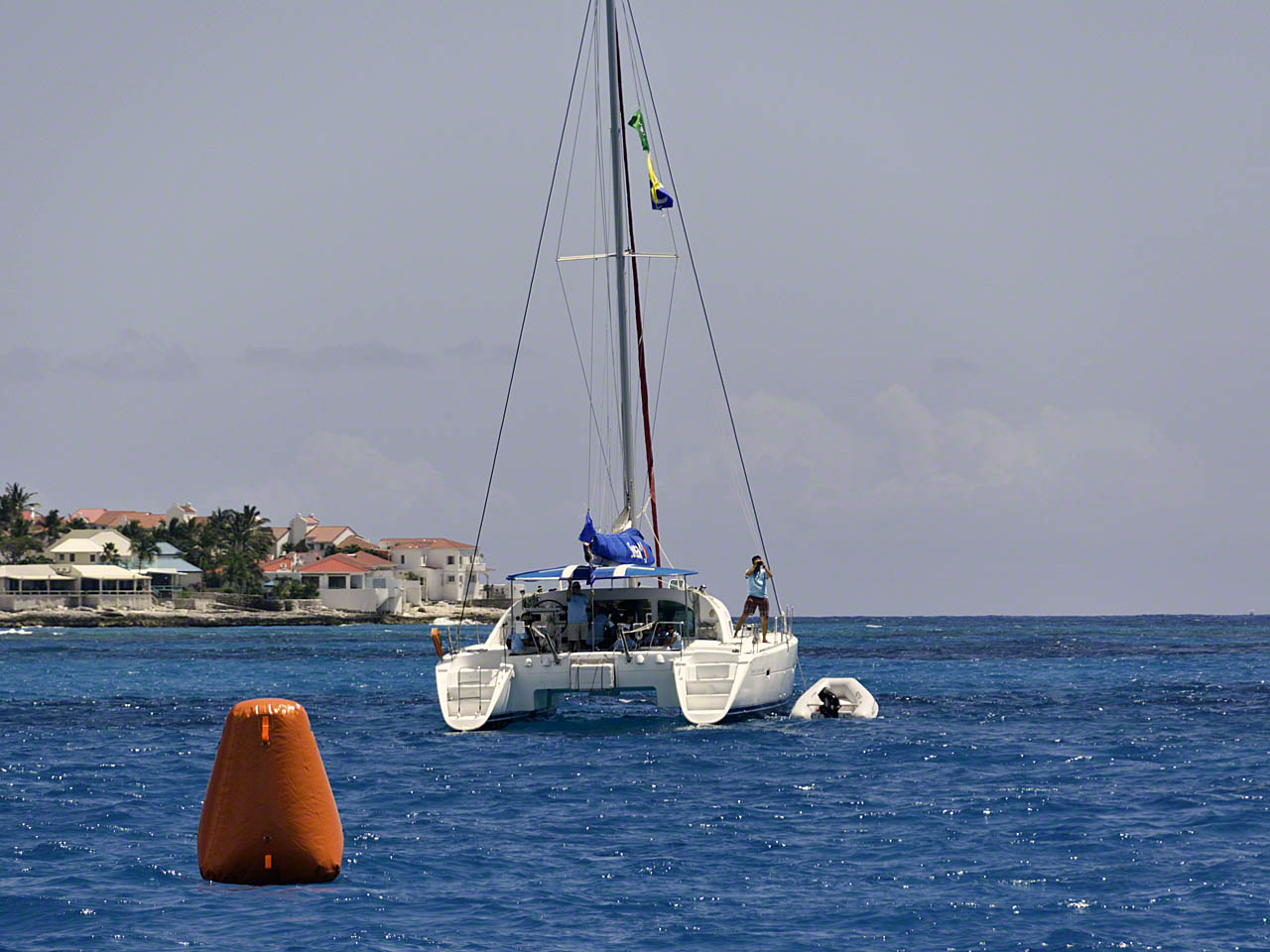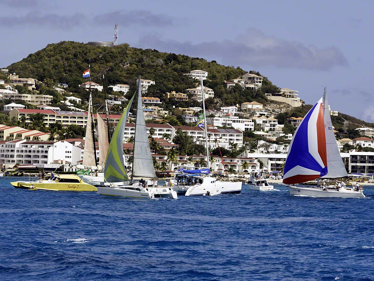 Today was the final day of the 2014 Heineken Regatta and the winds had died overnight, making for a comfortable anchorage but not necessarily conducive to a fast and exciting regatta. The weather report wasn’t overly optimistic about the winds picking up and even the convective clouds forming over the hills of St. Martin were lacking their normal energy and vertical development. We set up the start line in winds of around 10 knots at most and the towards the end of the set of starts we had to postpone one start at the last minute for about 10-15 minutes during a period of exceptionally low winds. With few problems the classes all got started off on their (slow) way around the shortened race course and since we only had one set of races we quickly weighed Katzenellenbogen‘s anchor and headed for the finish line, located back on the Dutch Simpson Bay. We soon arrived in position and dropped anchor so that we could celebrate aboard and also watch the contestants cross the line. I had my first beer in 10 days, and it did taste very good!