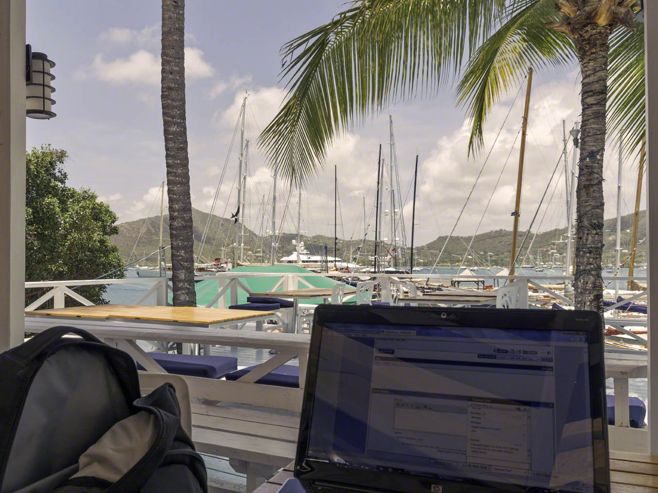 I worked aboard the boat in the morning and then headed to shore shortly before lunchtime, the AYC (Antigua Yacht Club) has changed a bit, the old office area is now a restaurant with added porch and the new offices look very nice and spacey with their large shaded porch area. There’s still just the one stairway for access, but I’m sure that things will sort themselves out and that there won’t be too much congestion during the sign-up process. I met Kathy and said hello to her before letting her continue on to her preparatory work, then met even more people that I knew from sailing and from last year’s race; it is akin to a family get-together.