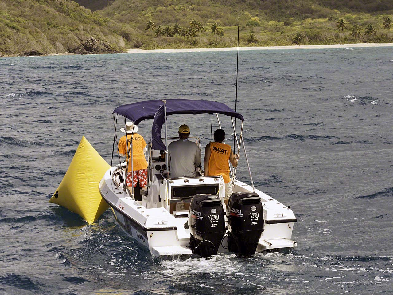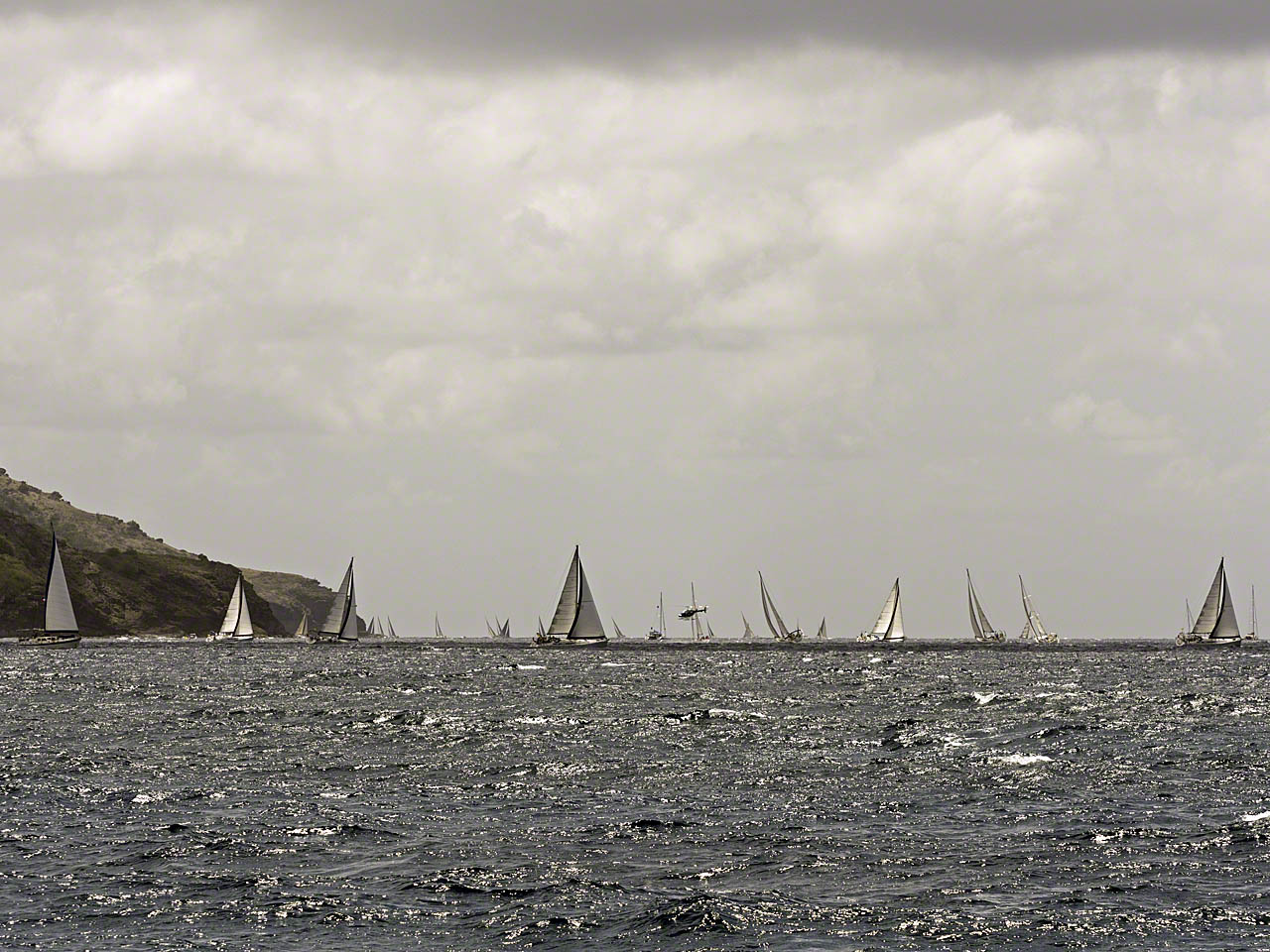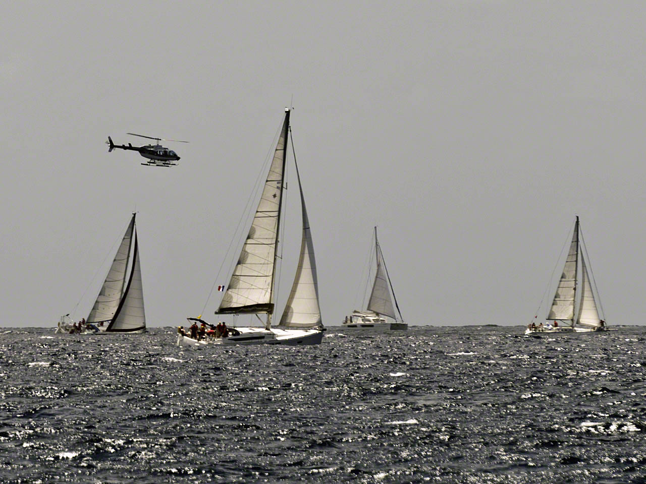 Day 1 of the Antigua Sailing Week began for our Committee Boat B with roll call at 08:00 at the boat. I’d put my long lens, binoculars, hand bearing compass, handheld VHF and assorted smaller items into my backpack and dinghied over to our catamaran so that I arrived exactly on time. Most of the others on our boat were already there and we had quite a bit of time to wait before departing, as the other committee boat (Katzenellenbogen) had to leave before us, since the space at the dock was quite narrow.