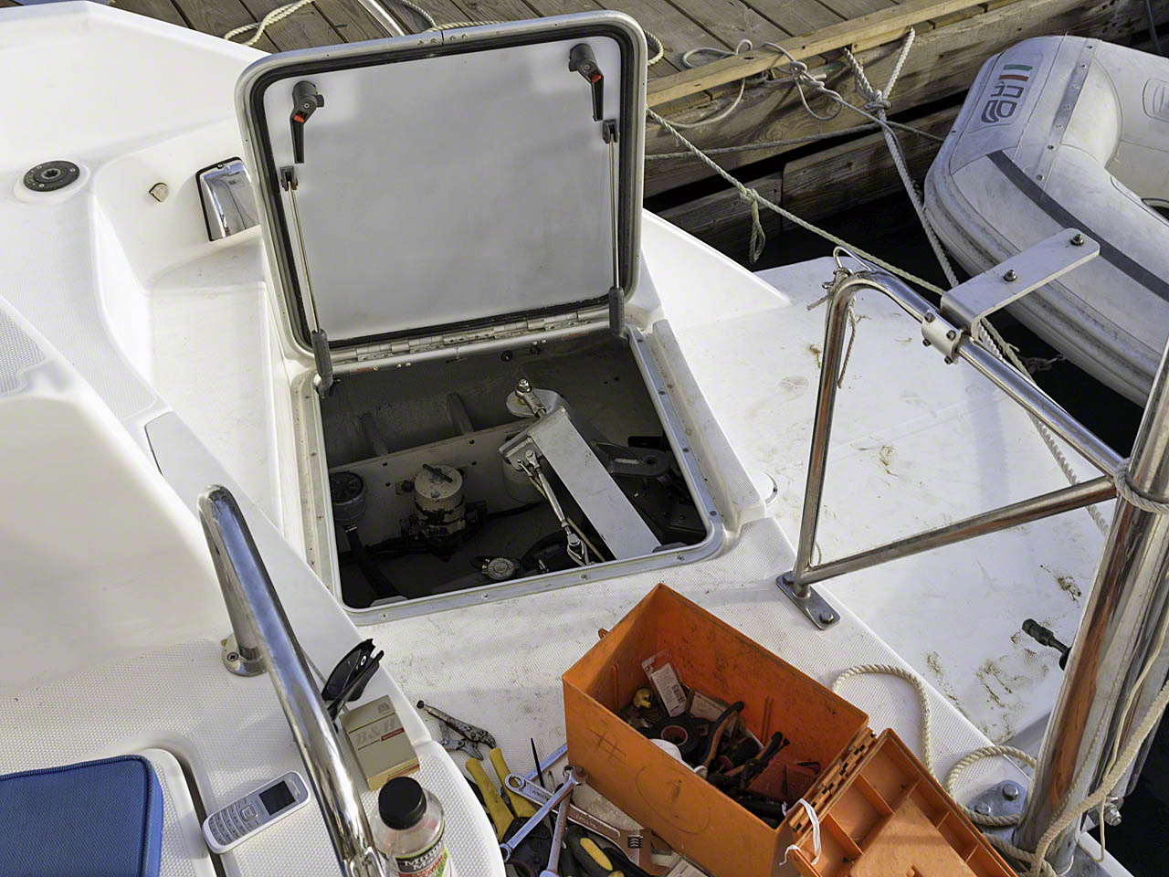 During the wait between the starts and finishes we heard odd clunking and banging noises but we couldn’t locate the source, I even peered under the hulls to see if something was hitting the boat from the outside. The noises disappeared after a bit and we didn’t give it much thought until after we’d finished timing the racers and wanted to head home. I noticed odd turbulence behind our port hull and saw that the rudder seemed to be at a strange angle. I opened up the engine compartment and saw that the rudder had detached itself from the bar that connected the two sides of the boat together. Upon close inspection, the washer and nut had fallen off and were lying on the bottom of the engine compartment but I wasn’t going down there in the seas, as the rudder stock was banging about and the engine was running (and quite hot). So our skipper decided to motor into Falmouth Harbor with one rudder and two engines and that we’d fix it in the calmer waters of the anchorage. He’d also radioed Sunsail so that their chase boat could come and assist us. The chase boat arrived, but with only a skipper and no hands, so once inside I had to climb into the engine room and do a quick fix. That was quickly accomplished and we were soon back at the dock (except for a fender-overboard episode to lively things up) and Sunsail later spent over an hour fixing our problem, which turned out to be bigger than expected as the steering cables had jumped pulleys and the steering bar had twisted; thankfully I was a spectator sitting in the shade and drinking a post-race beer while watching the Sunsail guys slave away in the bowels of our catamaran.