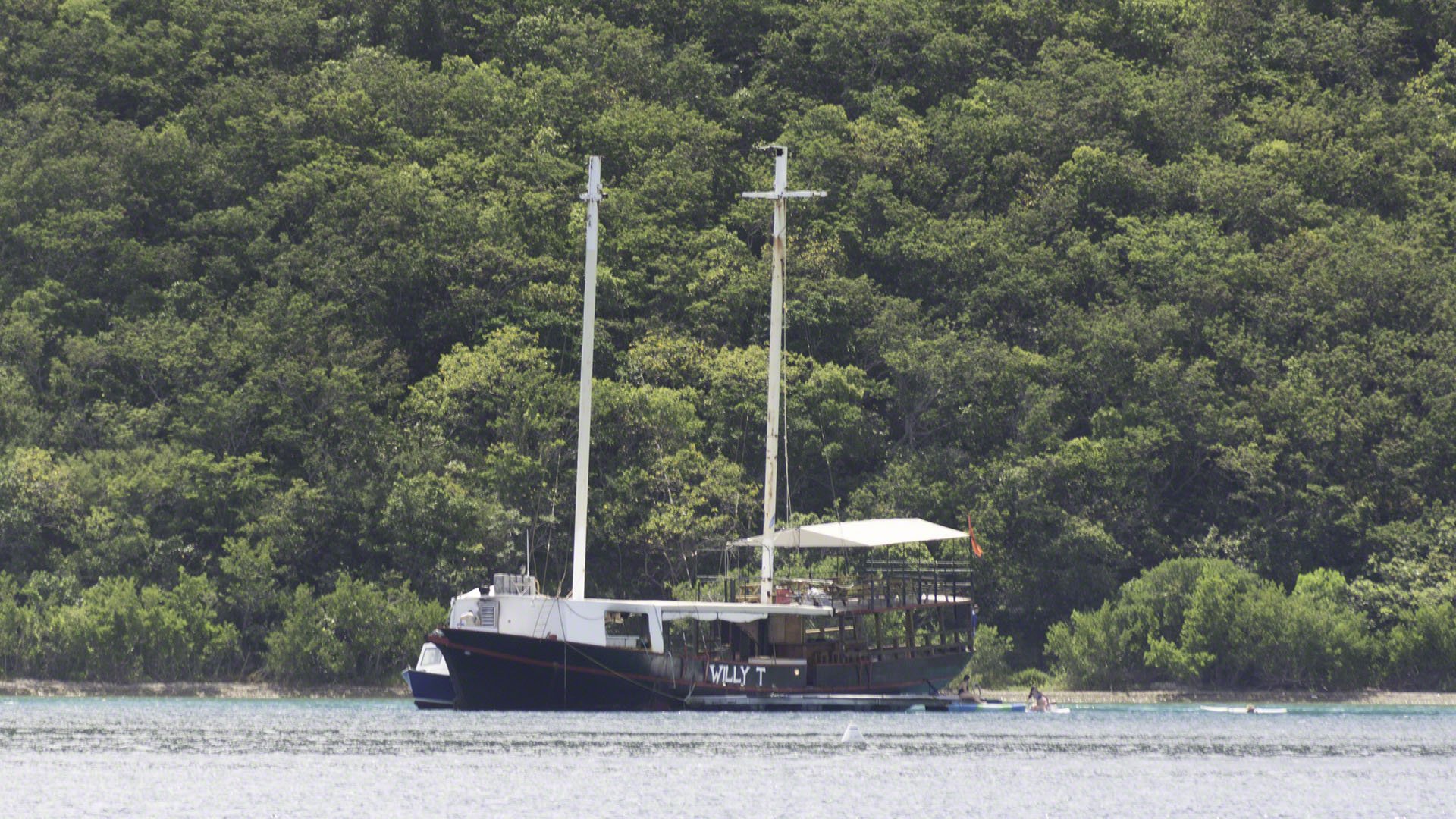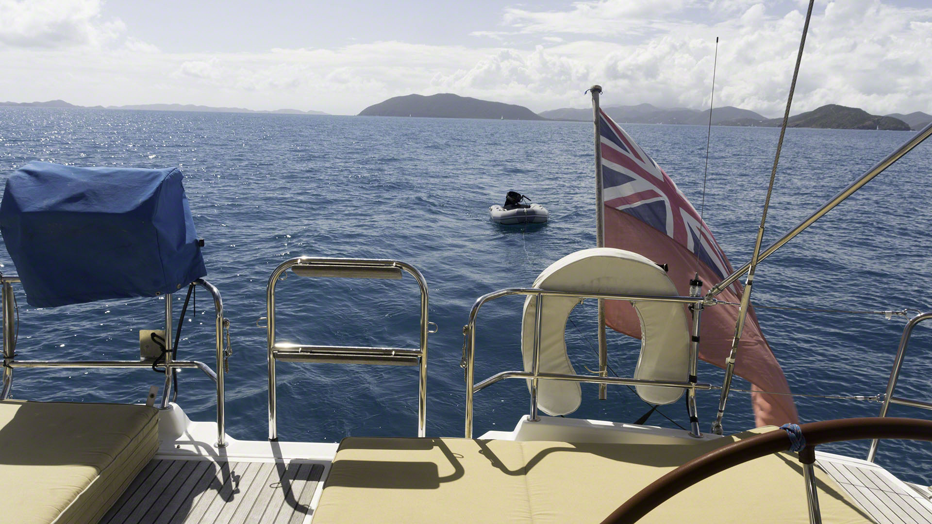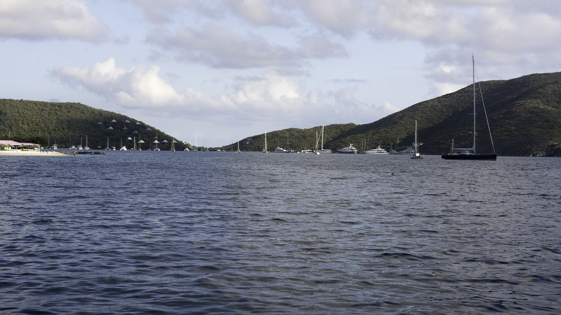 The winds were low in the anchorage, but I did my usual 1 reef in both sails when leaving, since I expected the winds to pick up once outside of the protected Bight on Norman Island. The reefs didn’t last long, since it was even calmer outside. At first there was just a breath to get me to Peter Island and then it picked up for a bit and I was doing 4-6 knots boat speed in less than 10 knots of wind, but despite wonderful looking cumulus clouds above the winds never picked up at all and once my boat speed dropped to under 1.5 knots at the Dog Islands I gave up on sailing and motored the rest of the way to the North Sound. The winds remain odd, I anchored in 15 feet off Prickly Pear Island and within minutes of completing the wind had shifted almost 180° but at 1-2 knots I’m not worried about problems with the anchor re-setting since the weight of the (rusty) chain alone is keeping me in place.