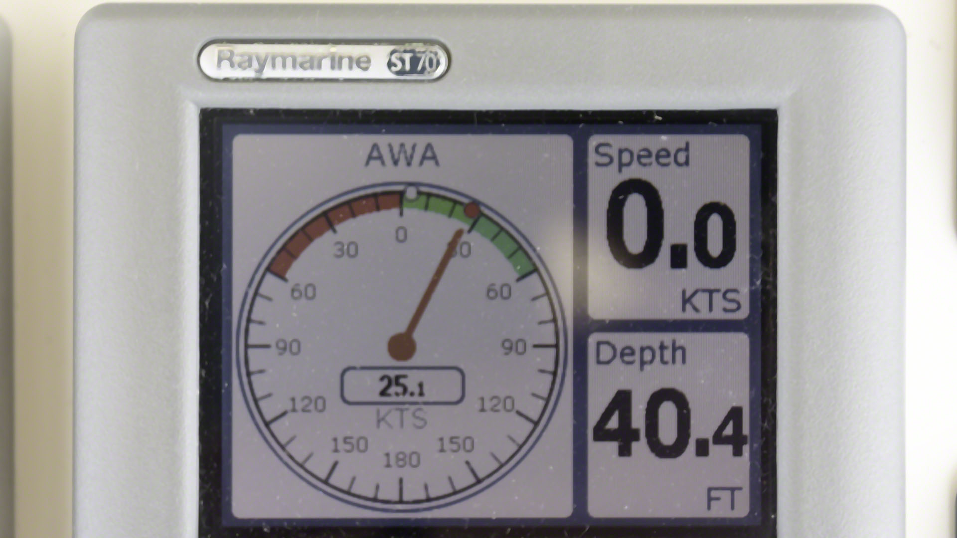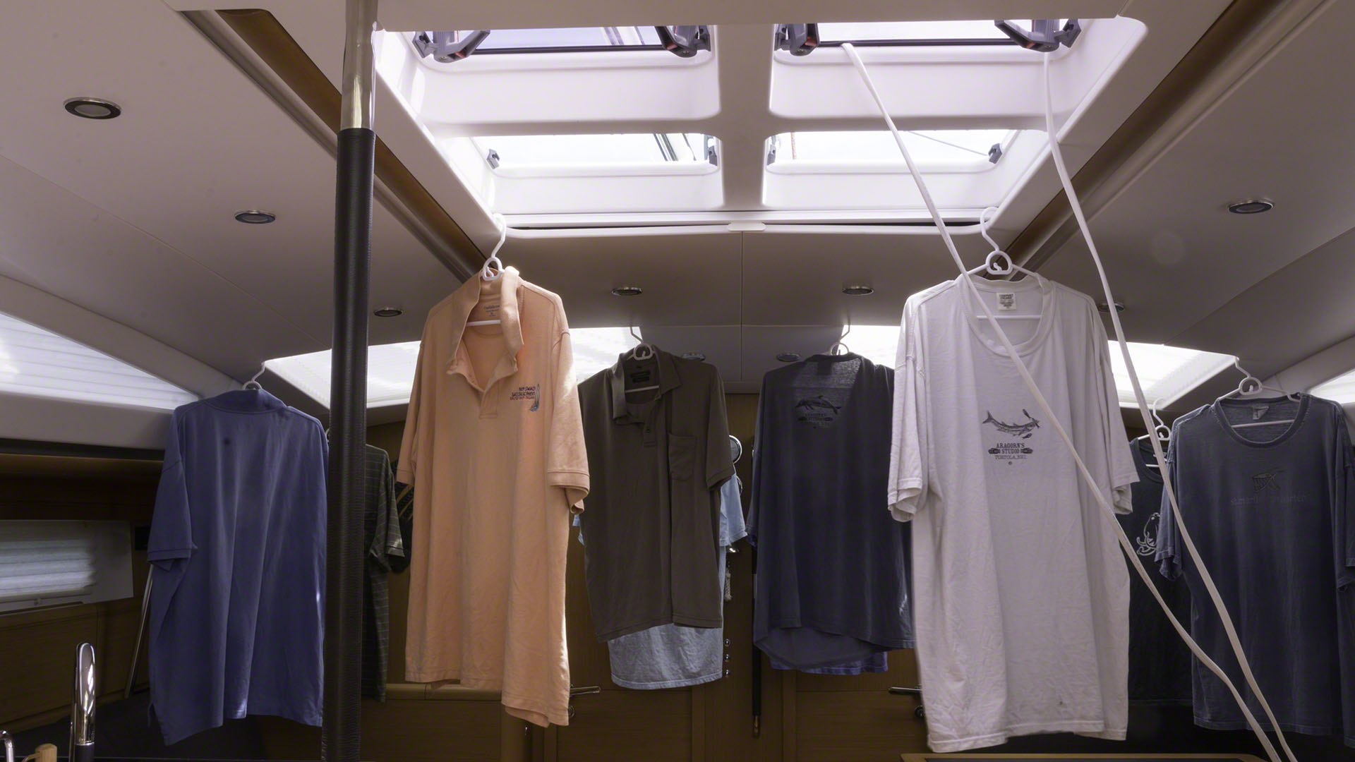 The winds are at 25 knots, gusting to even more. At least with this wind and no more rain everything cools down below decks and I have no excuse not to clean up a bit. Armed with a bucket of water and dilute Pine-Sol and a cloth, I attacked the aft cabin and cleaned all of the surfaces, hopefully removing all traces of any mold spores that might still have been hanging around after Zanshin‘s time in storage on the hard. I had only seen one area with what looked like some sort of growth, and that was the backrest of my seat at the navigation station, and that got a special dose of Pine-Sol to make sure that it was temporarily antiseptic.