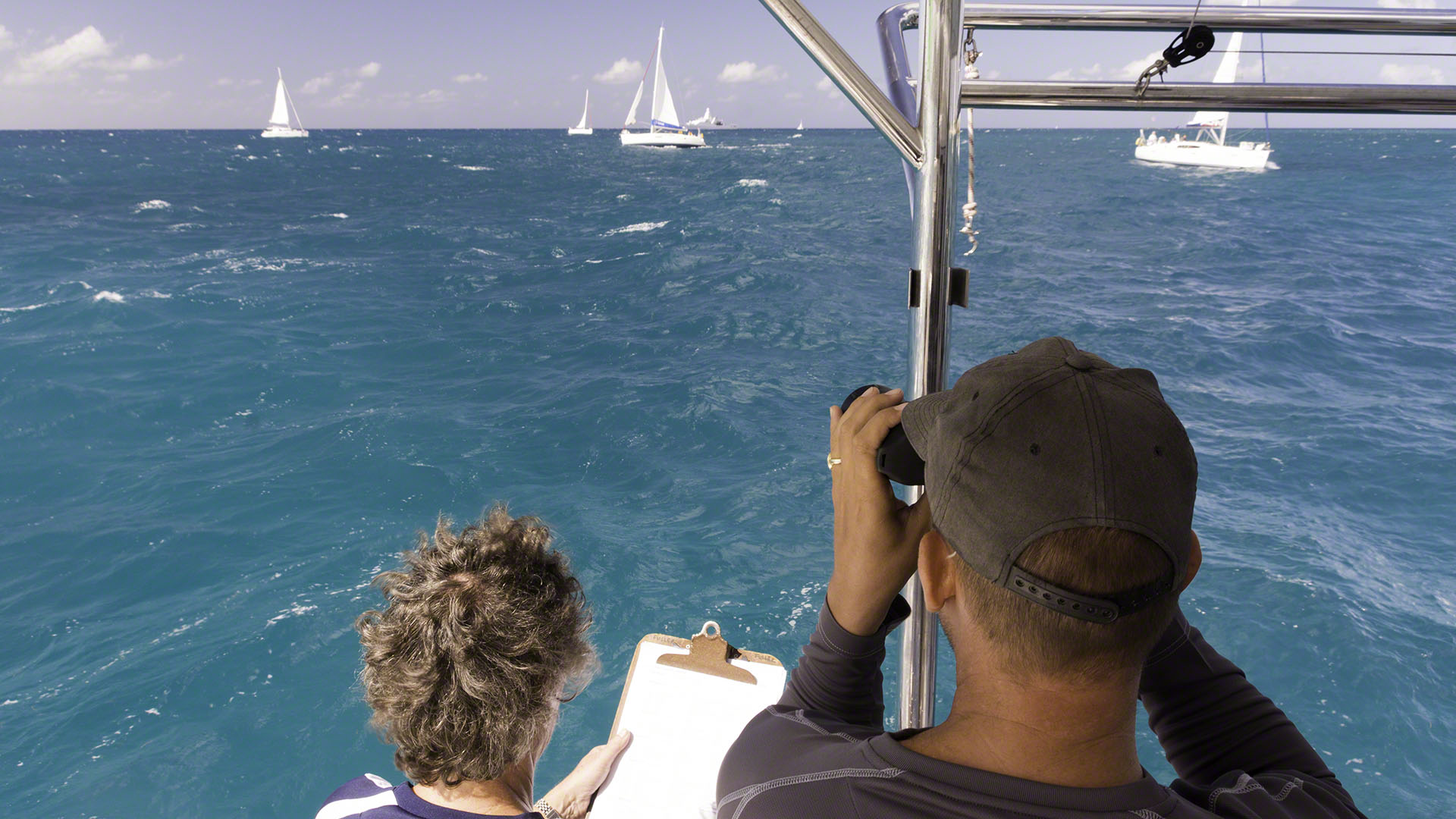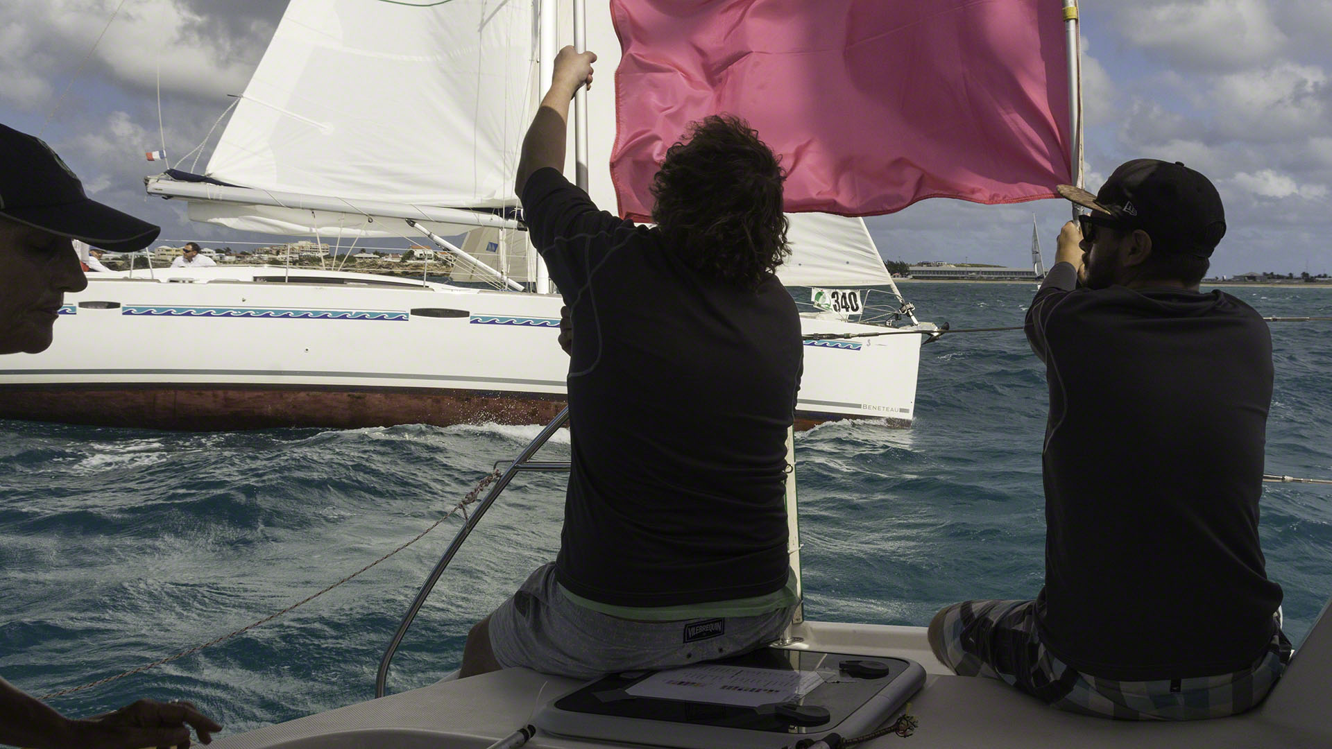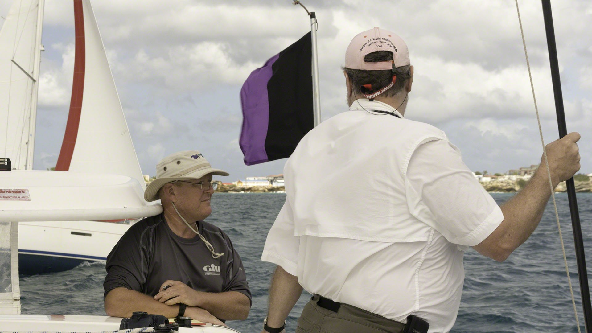 Today’s races began at the 7AM meeting for us, but the actual race for the Gill Commodore’s Cup didn’t start until 10 AM. We motored out in strong winds, at times going over 30 knots constant with gusts going somewhat high. The waves were commensurately high and it was a sloppy and at times uncomfortable boat motion once we anchored in 30 feet of water. We soon had the start line set up and before we knew it the start sequence began with Theo calling out all of the sequence radio traffic. My task for the day was to be official scribe, a choice which they probably regretted once they saw what my handwriting looked like. But I did take copious notes and once someone finds the appropriate Zanshin-Stone to decipher my scrawl they will know what happened. On a positive note, the starts all went quite well with no tense or close situations that might require looking back at the written notes.