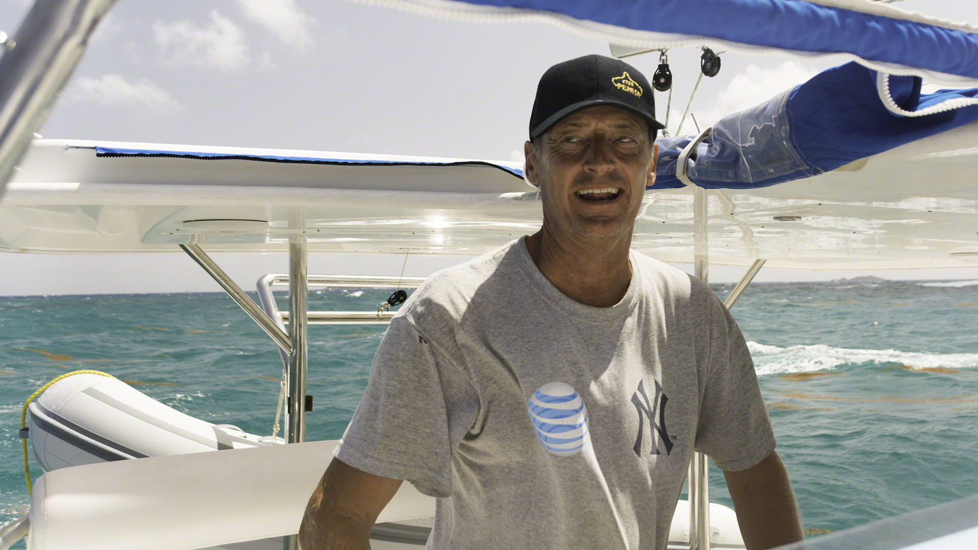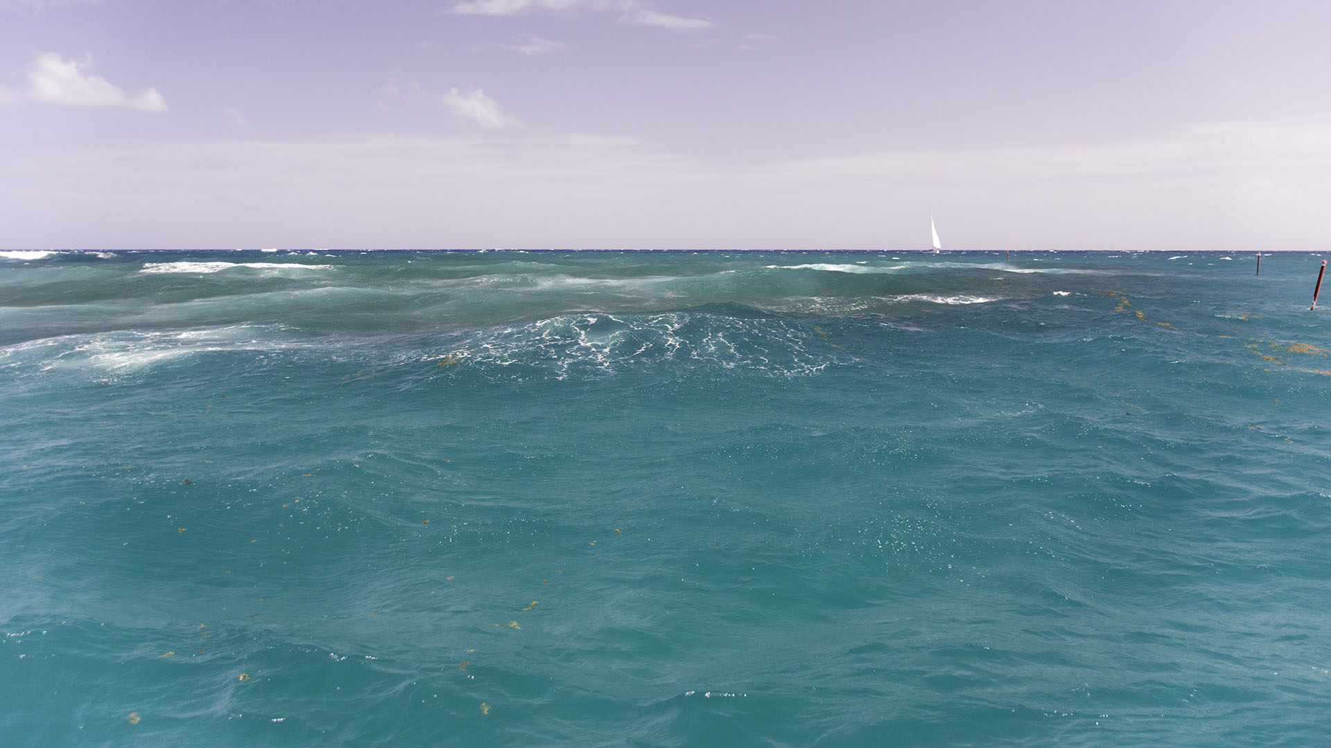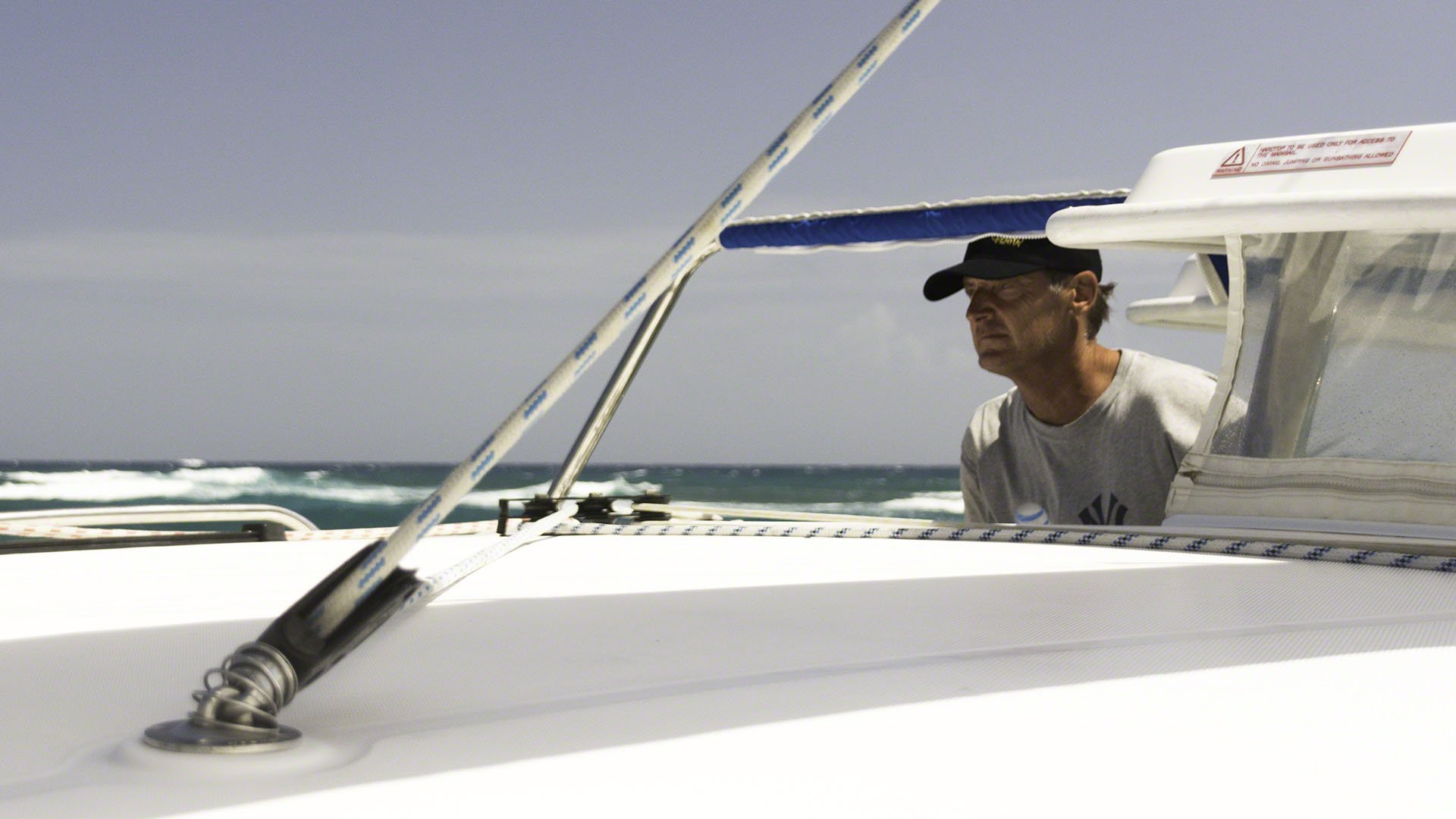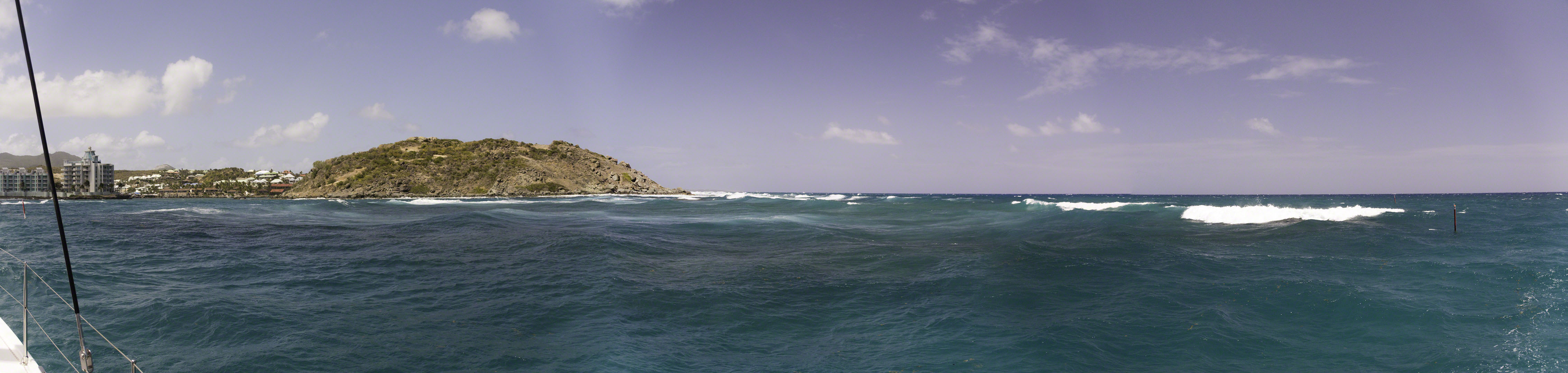 Mark and I ended up taking Yazawa II, our committee “B” boat, back to Oyster Pond today. Mark had already been to the gas station to fill up some Jerry cans to top off the tanks and since we were already a well-oiled team we were off our mooring quickly and motoring around Sint Maarten to Oyster Pond on the windward side. Soon after rounding the corner of Simpson Bay we began bashing our way through the big swell and strong winds and despite running the engines at high revs our speed would vary from 3 knots (after getting a pounding) to 5 knots or so. The motion was surprisingly uncomfortable compared to a monohull sailboat, but part of that might be that the sails on a monohull will keep a given heel angle and the main motion is bobbing on the fore-aft axis, while the catamaran would constantly move about all three axis.