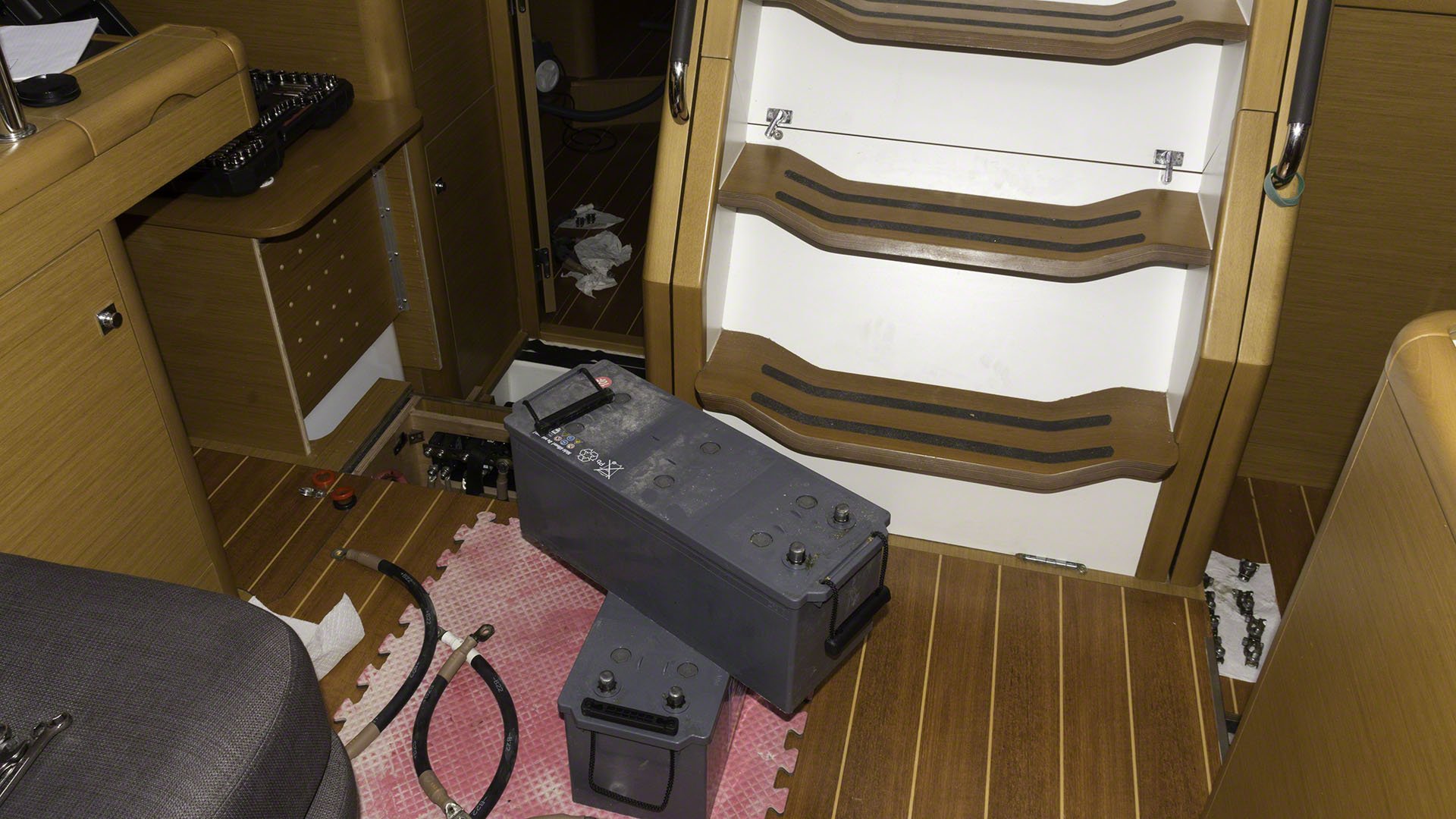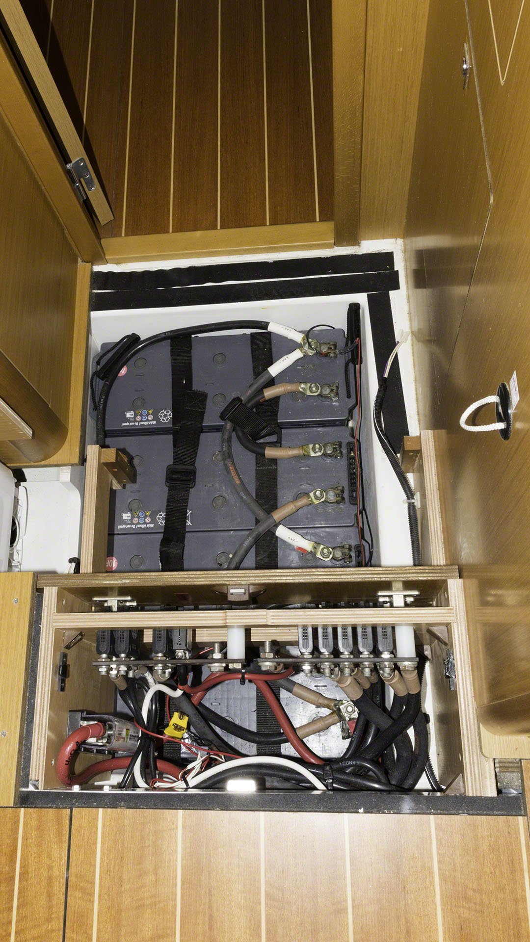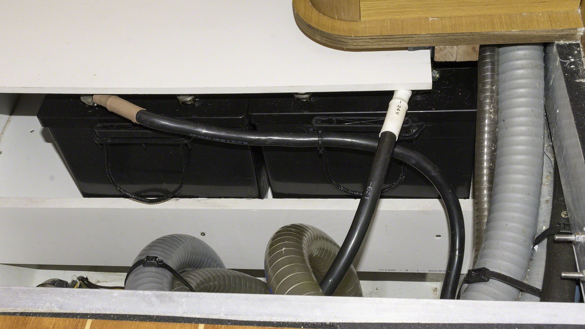 The day is only half over, but I’m absolutely beat. Andy from Five Star Yachting and I did the battery replacement on Zanshin. The dead battery bank consisted of 8 120Ah Exide/Sonnenschein batteries, the killed batteries have been removed and replaced with 4 220Ah Vetus batteries. The old ones were AGM while the new ones are sealed maintenance-free ones (but not AGM ones) but with the solar panels aboard I can sacrifice a bit of charging capacity and end up paying significantly less. We picked up the new batteries at Budget Marine in the morning and then spent some quality time lifting lead around. The 8D type new batteries are very heavy indeed, and the old ones got heavier during the time I had to move them around. Luckily both Andy’s and my backs stayed in place during all this shifting about. The new batteries are now safely installed in the two banks and I am running the generator right now to give them their first charge to 100%. The generator has been running an hour or so and pumping 80A into the 24V bank, the bulk load is now finished and the charge is in absorption mode but still charging with 50A, so I think I still have a bit of generator time left before the bank is fully charged and my Xantrex battery monitor can synchronize. I’ve now started up the washing machine to keep the generator under some load and unfortunately the electric part of the water heater trips the circuit breaker, which means I need to head off to the French side home supply store to get the heating element (which I hope is standardized).