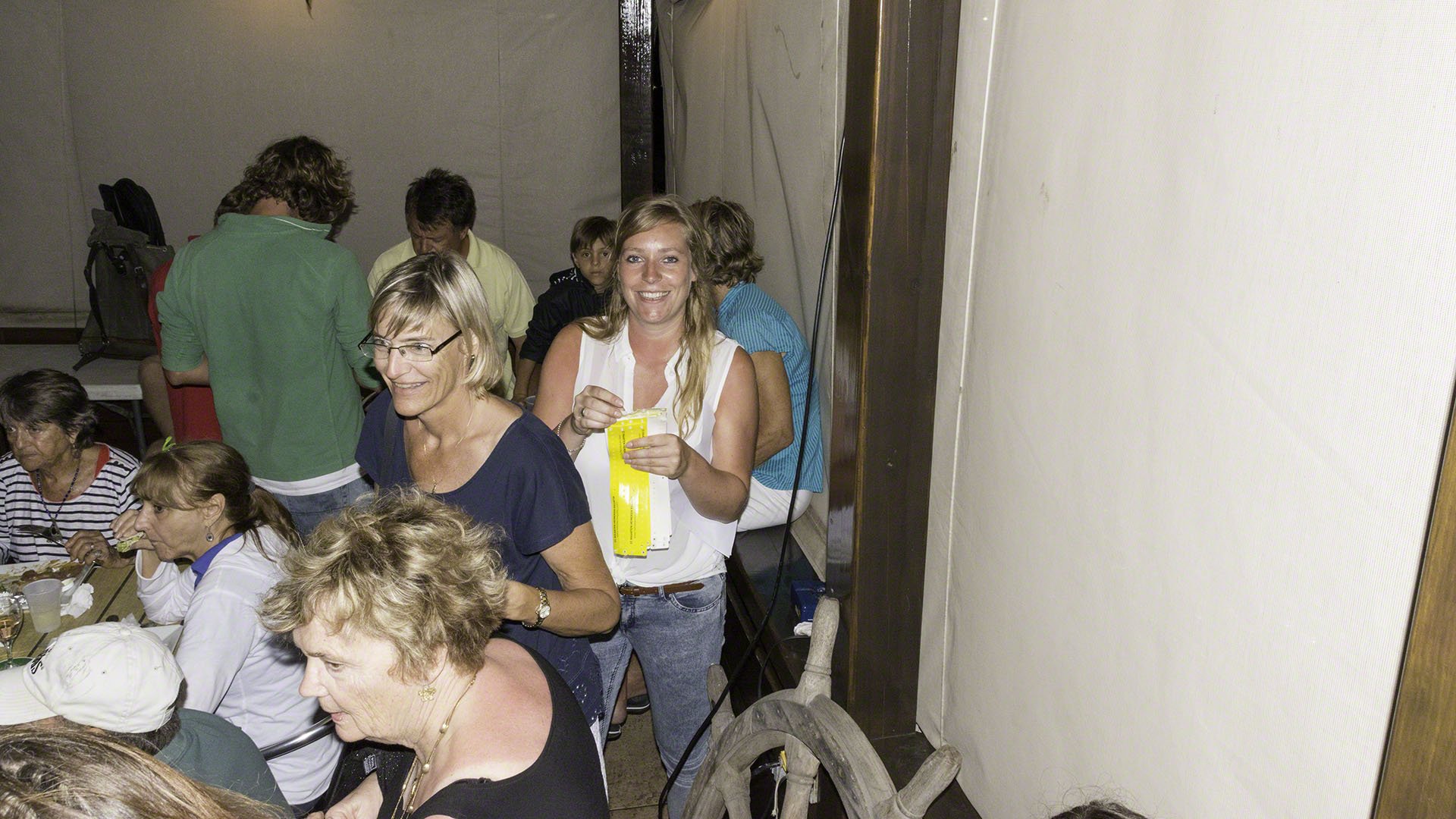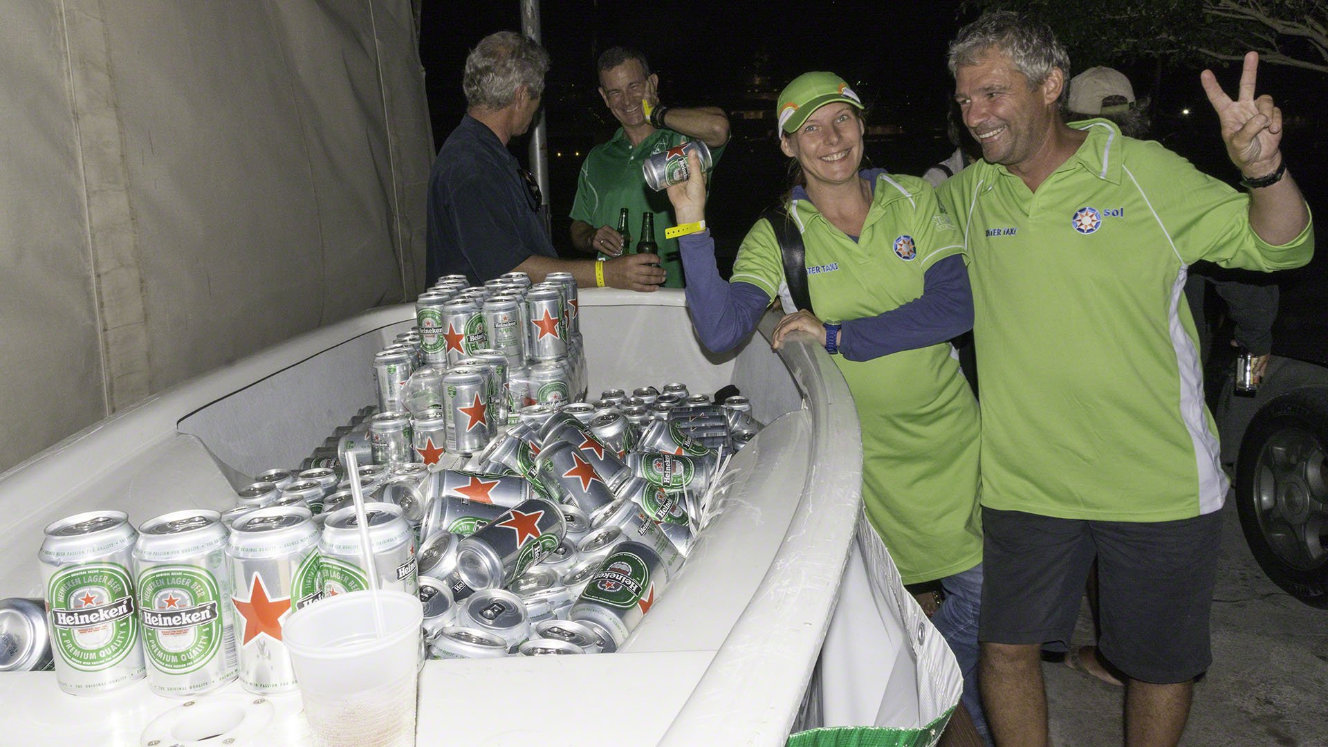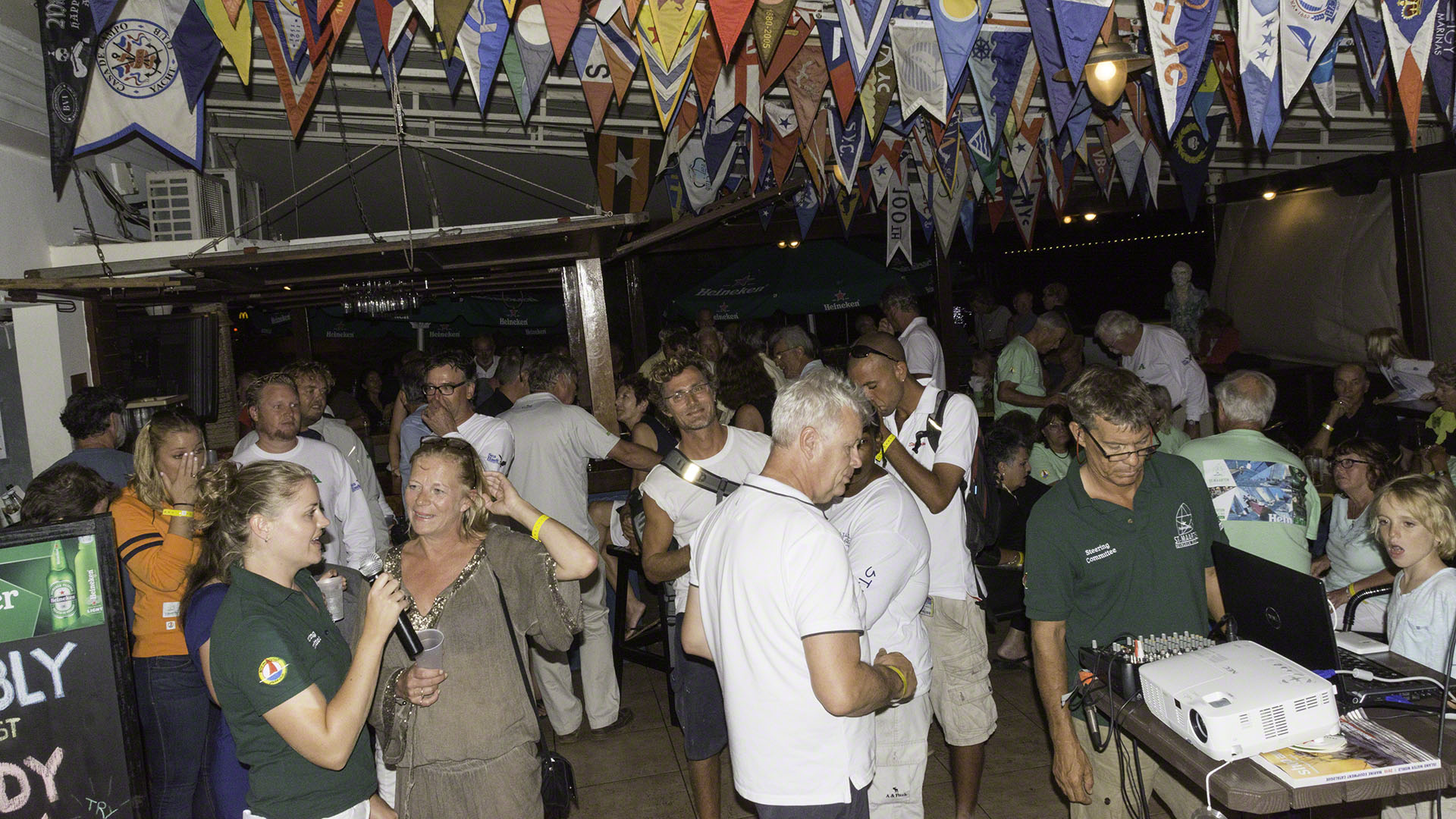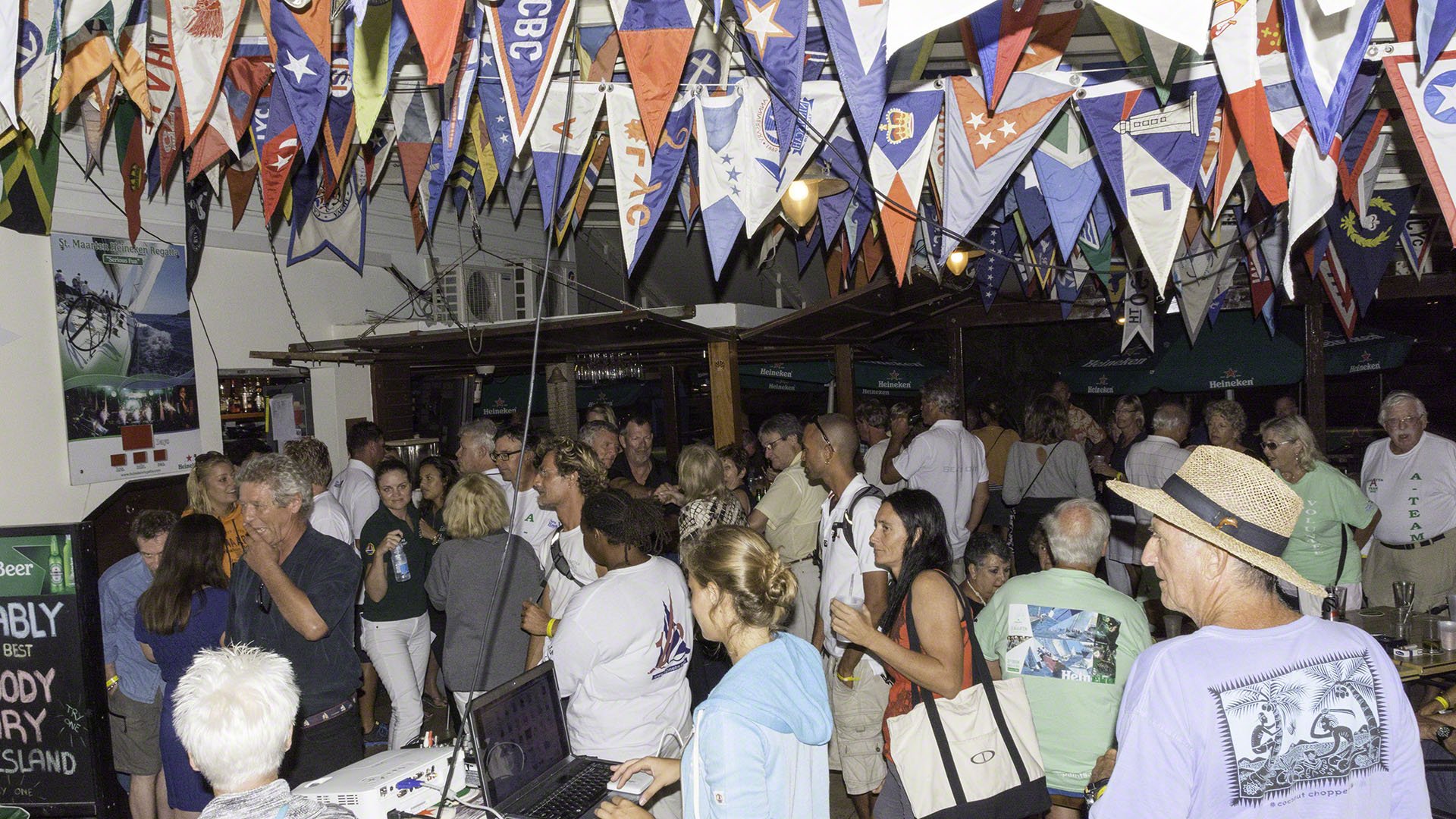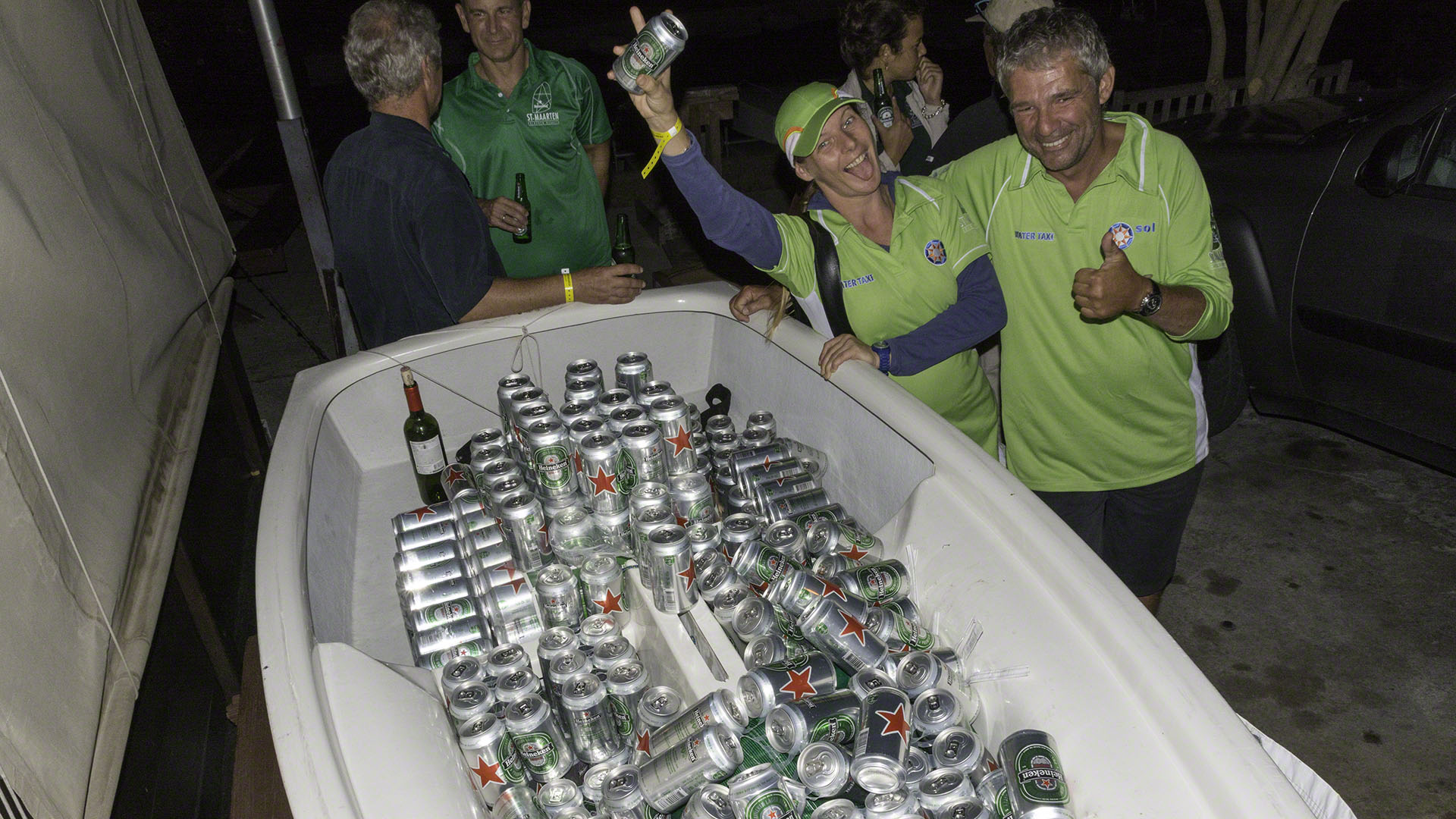 The 2015 Heineken Regatta Volunteer Party began at 19:00 at the Sint Maarten Yacht Club and I dinghied over early. I was met at the door to be recognized and receive a yellow band which entitled me to free drinks at the bar (limited to products made by the main sponsor). There was an Optimist outside filled with cans of beer and if one guessed the number of cans correctly one could take the beer home. I put in a wild guess with 325 but later learned that some of the display was bulked up with some empty cartons of beer underneath the thin veneer of Heineken. And soon after the door I met Neil, who was selling raffle tickets where the proceeds were going to the local SAR agency so I decided to splurge with a $5 ticket. I didn’t have the right note so ended up doing a 5 tickets for $20 deal and promptly forgot about it, since I’ve never won anything in a raffle or lottery in my life.