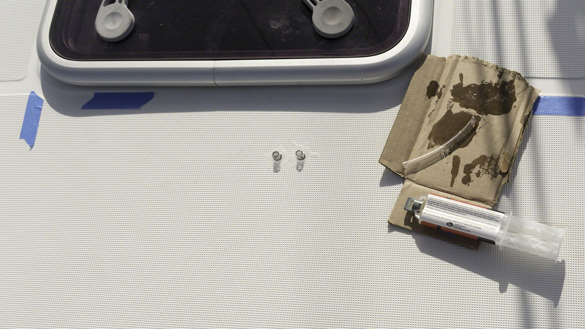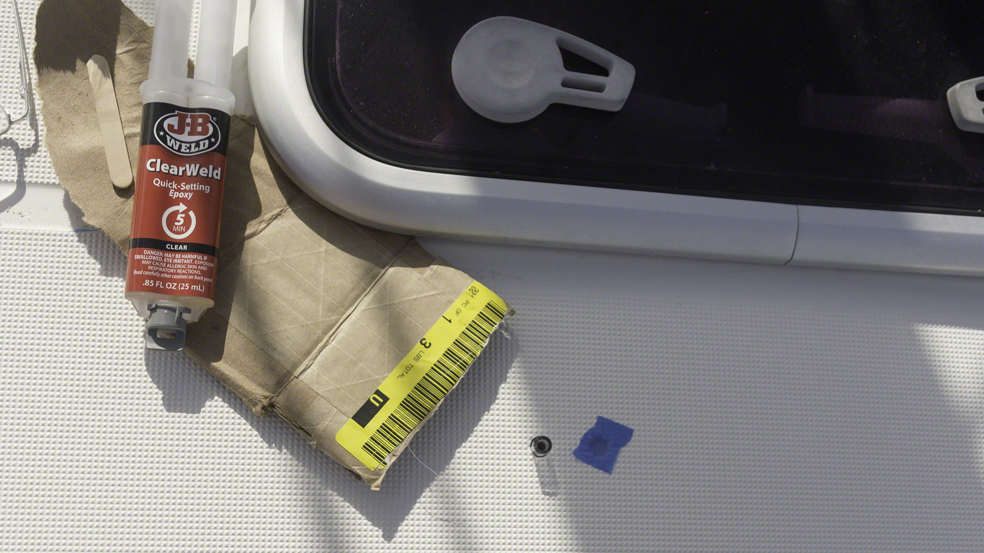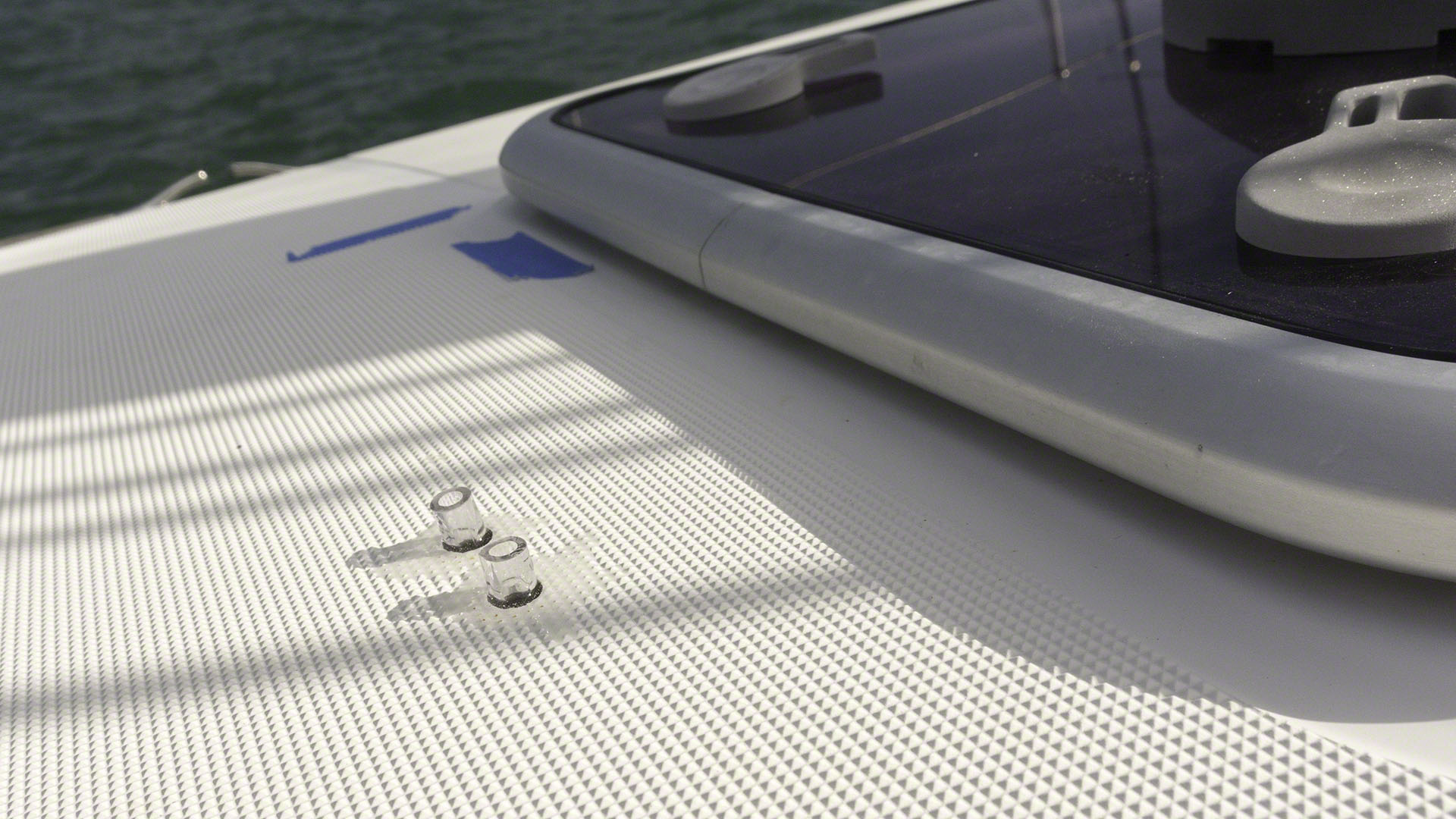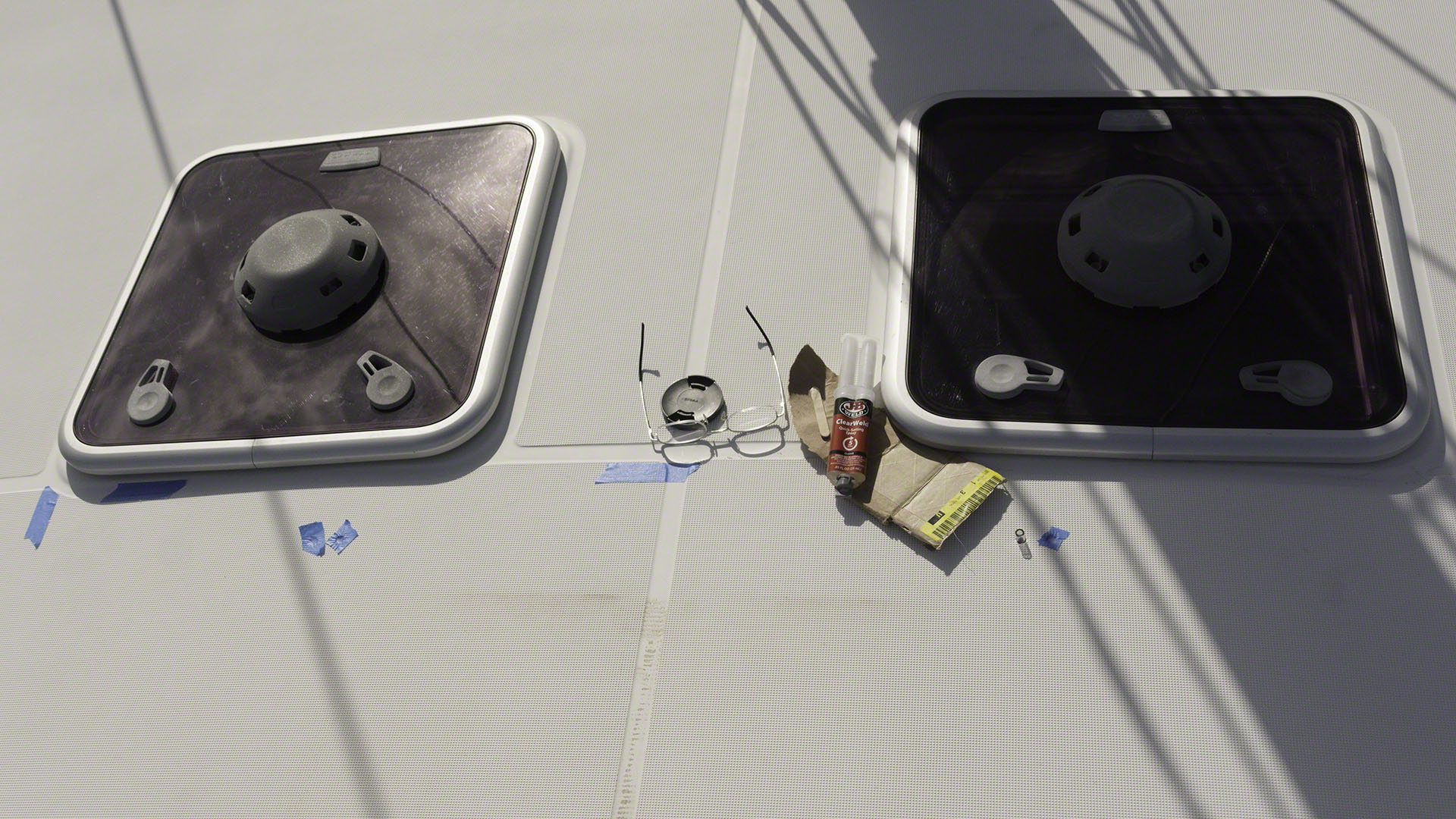 The holes are now epoxied! I’ve inserted plastic tubes into the holes and epoxied those into place as well and I’m fairly confident that they are going to be watertight and not leak water into my balsa core. I’ve cleaned the deck area where the panels are going to go tomorrow . I trust that the winds will soon die down sufficiently for me to use the real panels to check if I’ve drilled in the correct location. Although if I’ve messed that up I don’t have much choice about panel placement.
