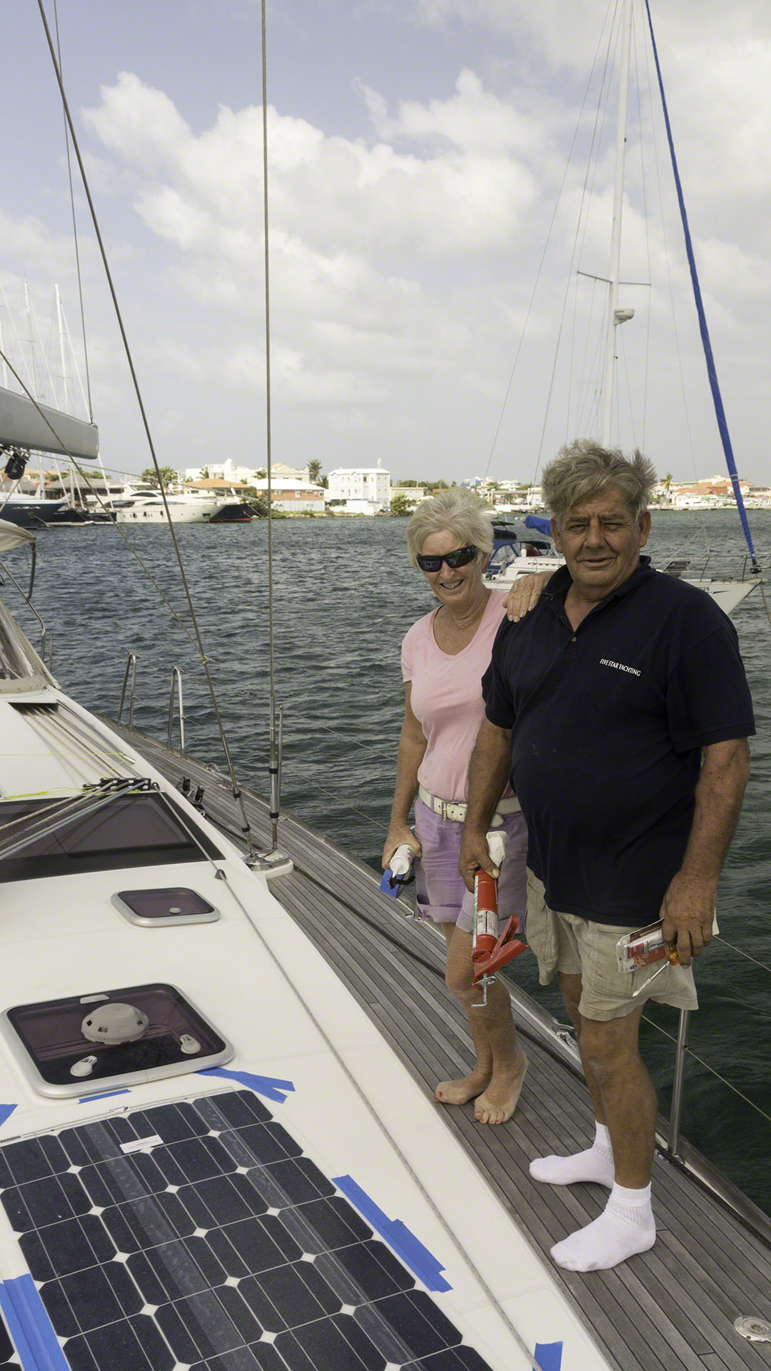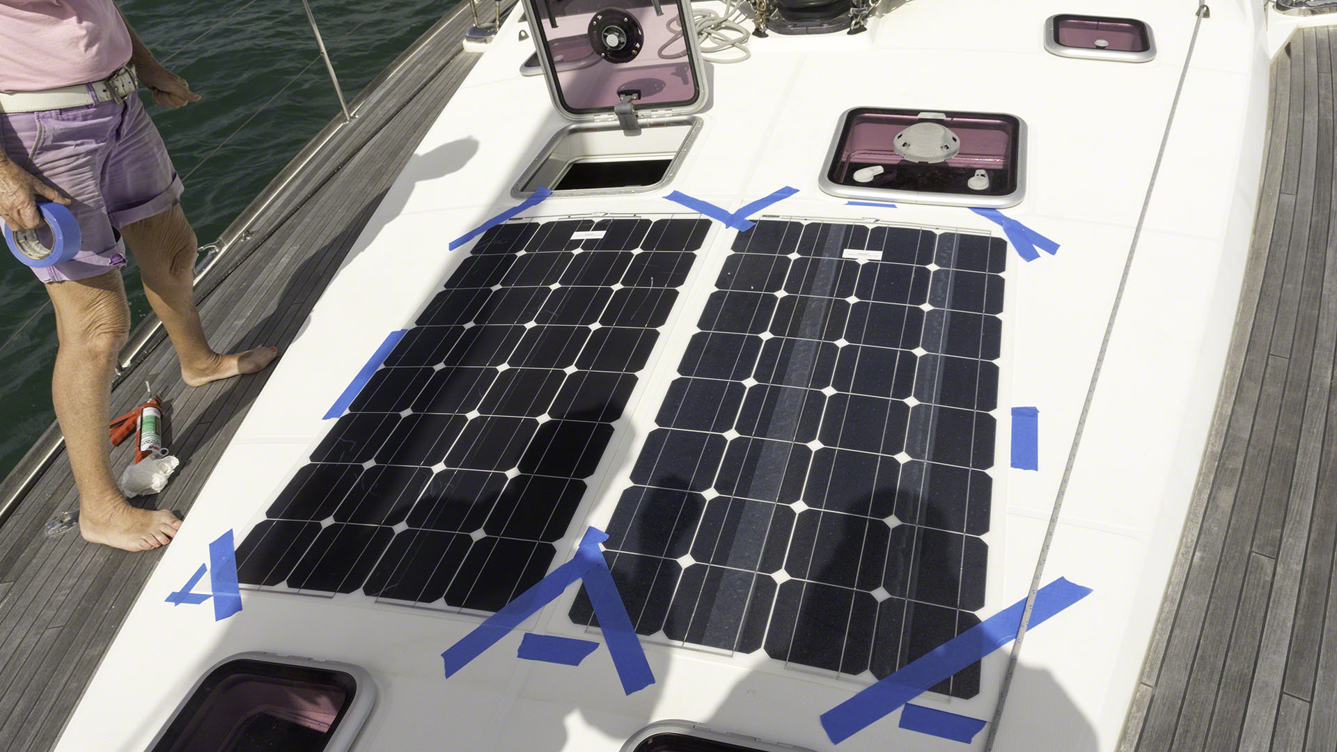 Today was solar panel day, at least for the most part. The epoxy in the holes I’d prepared on the previous day has hardened, so I cut the tubing flush on the decks and to a shorter length on the inside and also cleaned the installation area again in preparation for Andy’s arrival. The winds were still gusting a bit, and I was worried about the two of handling the flexible panels but Andy had brought his wife, Marie, and with their expertise we soon had the 3M 4200 sealant applied to the first panel and fed the wires through the tubing with hardly and problems at all. The second panel went in without a hitch and we taped the edges of the panels to ensure that nothing could move until the sealant had begun to cure. The next task was sealing the edges with a silicone sealant, Andy had brought his tools for that but wanted to wait for the sealant to set a bit before attempting that task, so both he and Marie departed. I suppose that they had other more pressing tasks the rest of the day, as they did not return – but there was no hurry (and no rain) and I’m sure that he’ll come by on Saturday to complete the work.