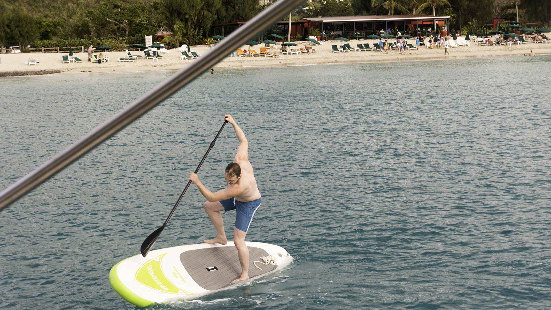 Conditions out in the channel between Anguilla and St. Martin looked just right, so when we all got aboard Zanshin today I set a couple of reefs in the mainsail and two reefs in the genoa and we set off on a sail to Anse des Pères via a detour to Anguilla. As soon as we’d passed Creole Rock the winds picked up and Nick, Sascha and Corinna took turns at the helm of Zanshin while we were zipping along at 7-9 knots with a bit of heel. After the exhilarating sail we cruised into the bay and joined a single solitary anchored boat and soon the paddle-board was inflated and seeing use. The waters in Friar’s Bay aren’t quite as clear as I expected, but it is still warm and clean water. We spent the whole day anchored out, eating a small lunch of baguettes and (very smelly ripe) Brie and consuming copious amounts of ginger ale and water between bouts of swimming and reading e-books.