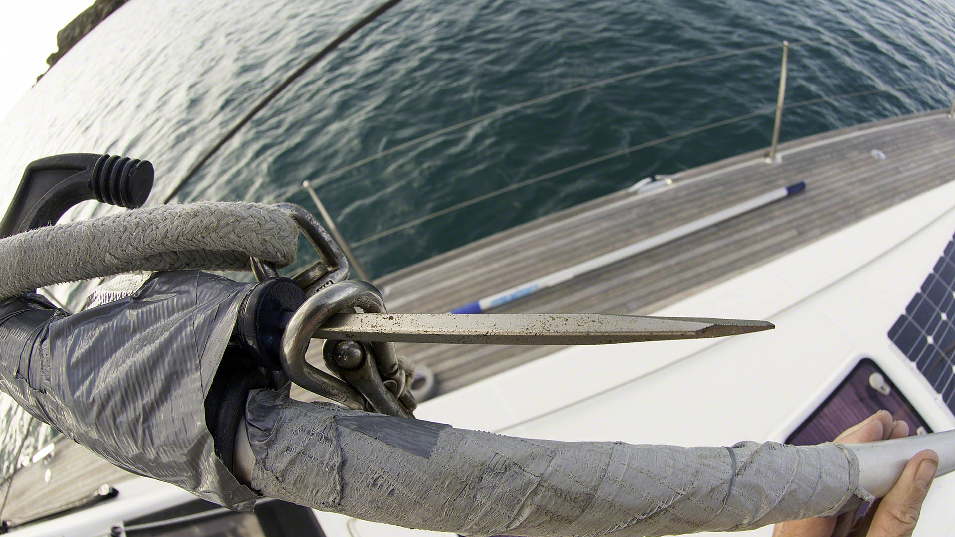 At least I finally managed to get the spinnaker line down today. It took a lot of time and effort, at first I tried duct tape with the sticky side out to catch the line and let me wrap it around the pole. Unfortunately Dyneema® is too slippery and the big line wouldn’t wrap. Then I attached a pair of pliers to the end, with the handle pointing out; this was supposed to catch the big line and slide to the metal pull ring, which would get a friction grasp at the narrow end of the pliers and let me pull it down. No luck there, either. In the end I used duct tape to attach a screwdriver pint obliquely down. This was supposed to go through the eye of the pull ring and let me pull the line down. I thought that this would be like trying to thread a needle, in the dark, while riding a roller coaster and after too many drinks. But, fortunately, it worked on the first try and took only seconds to let me get the line back down to deck level!