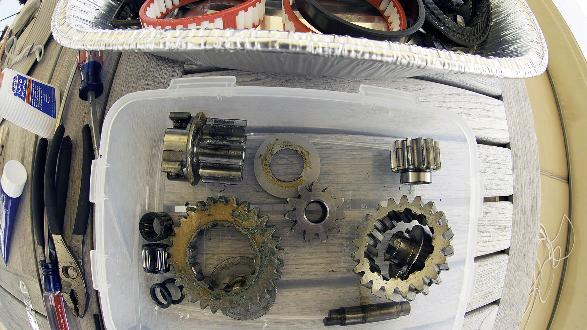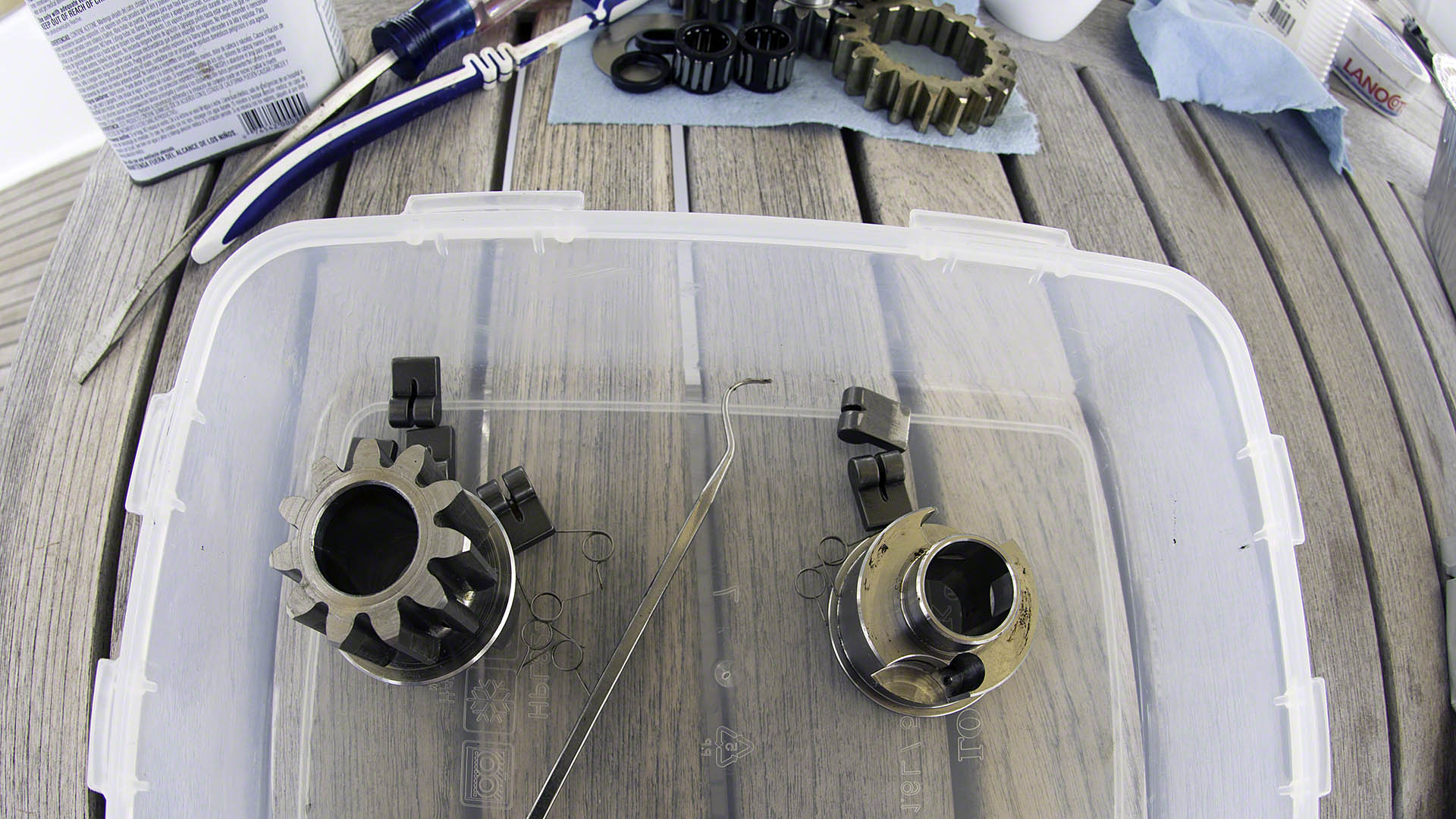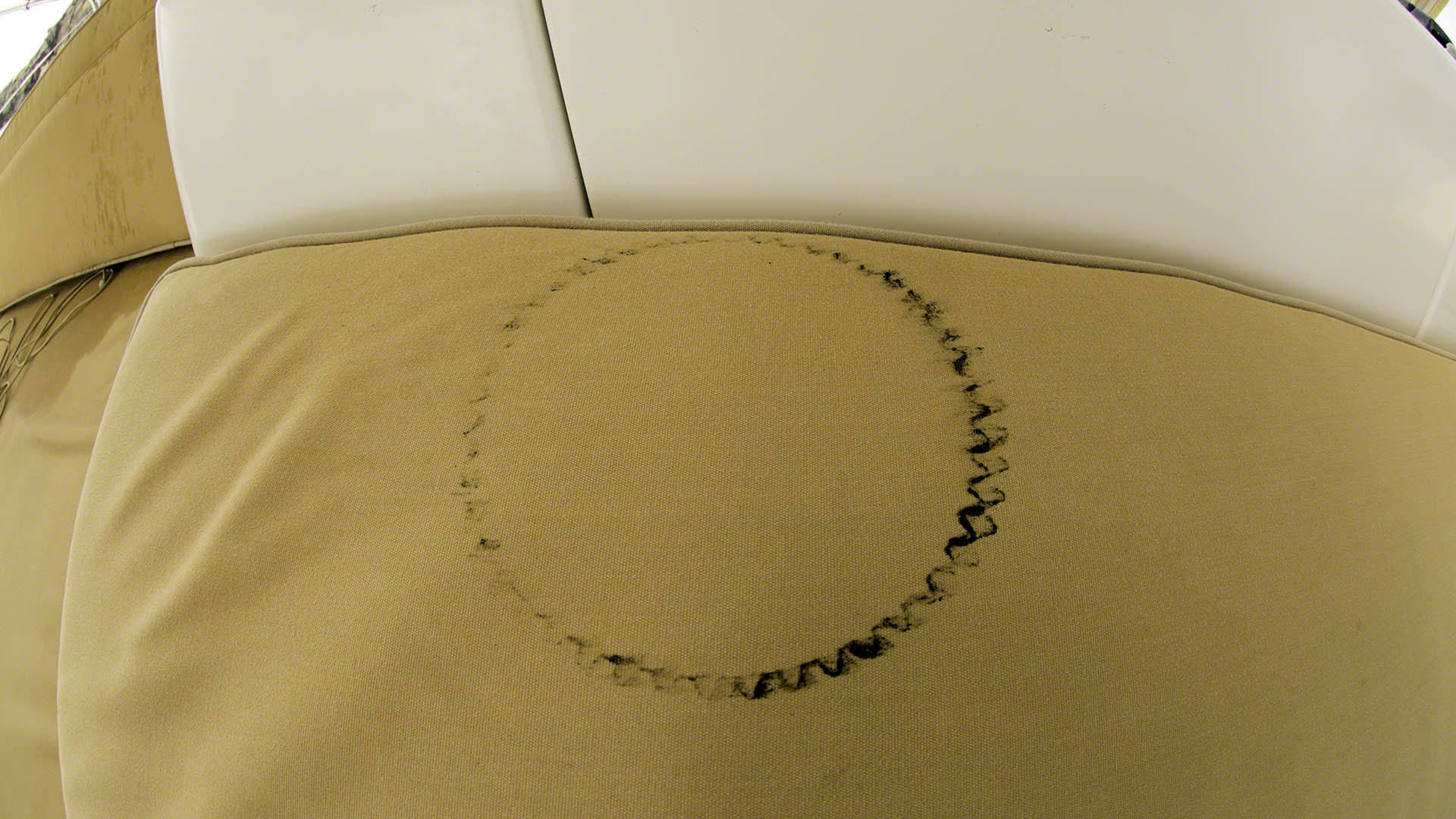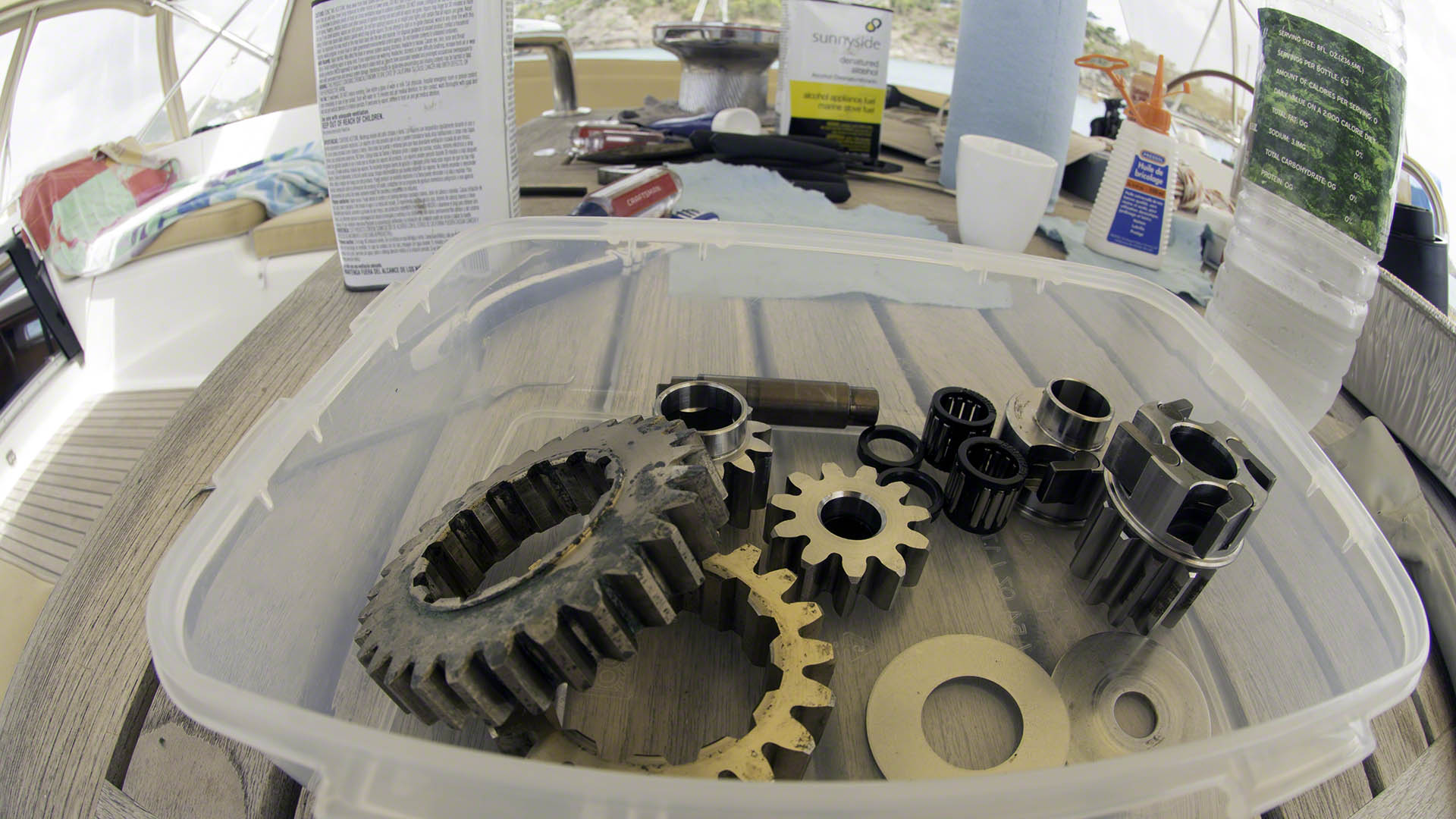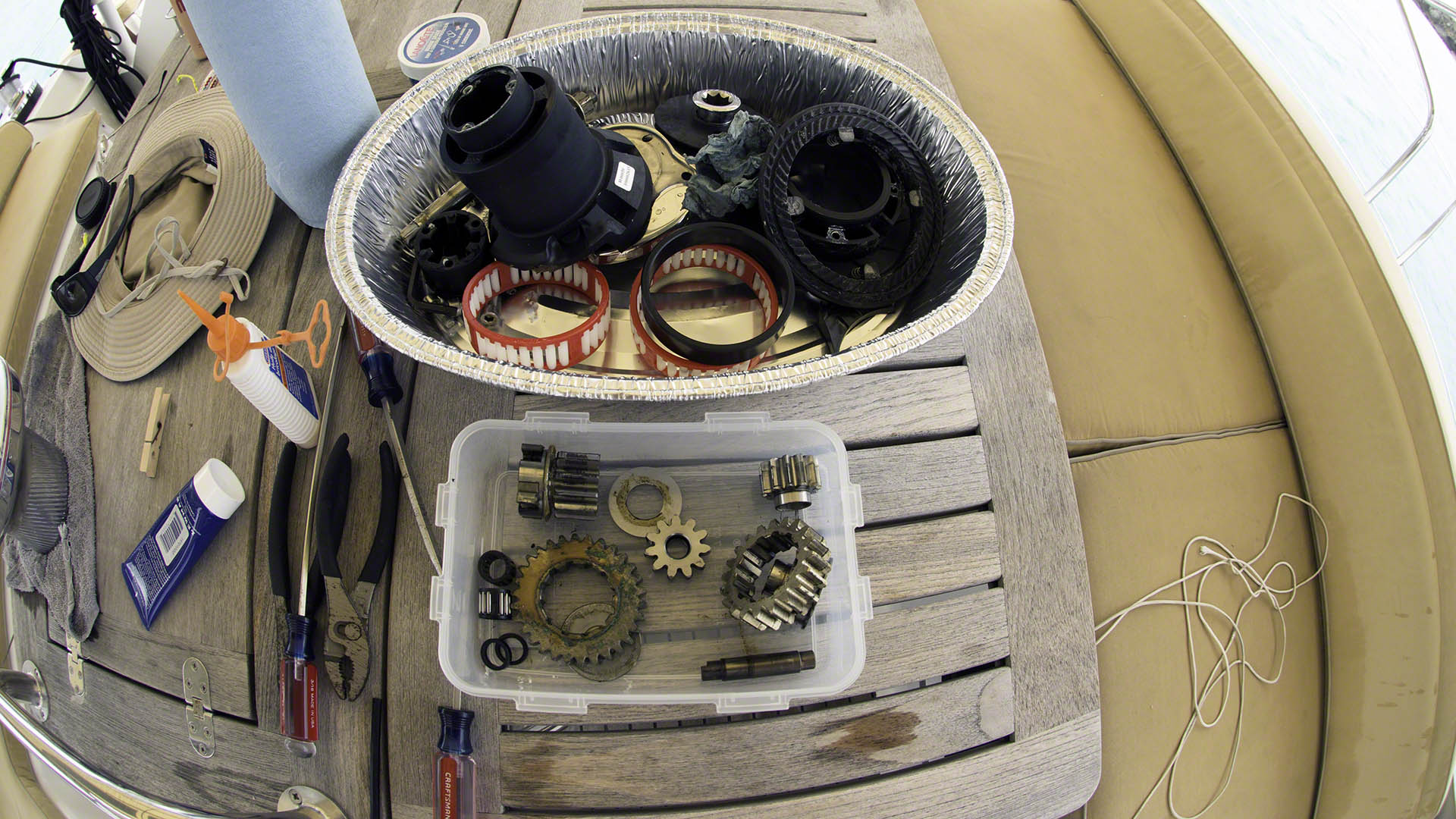 My main winch, the port forward one which I use for most tasks, had the jaws come apart a bit last season and I’ve been using extra turns on the winch drum since then. I have a spare part and hadn’t gotten around to replacing the winch but decided to do that today. I combined cleaning and servicing the winch with jaw replacement and everything went brilliantly until I put the winch back together. One small slip and now I have a permanent stain on my Sunbrella cushions.