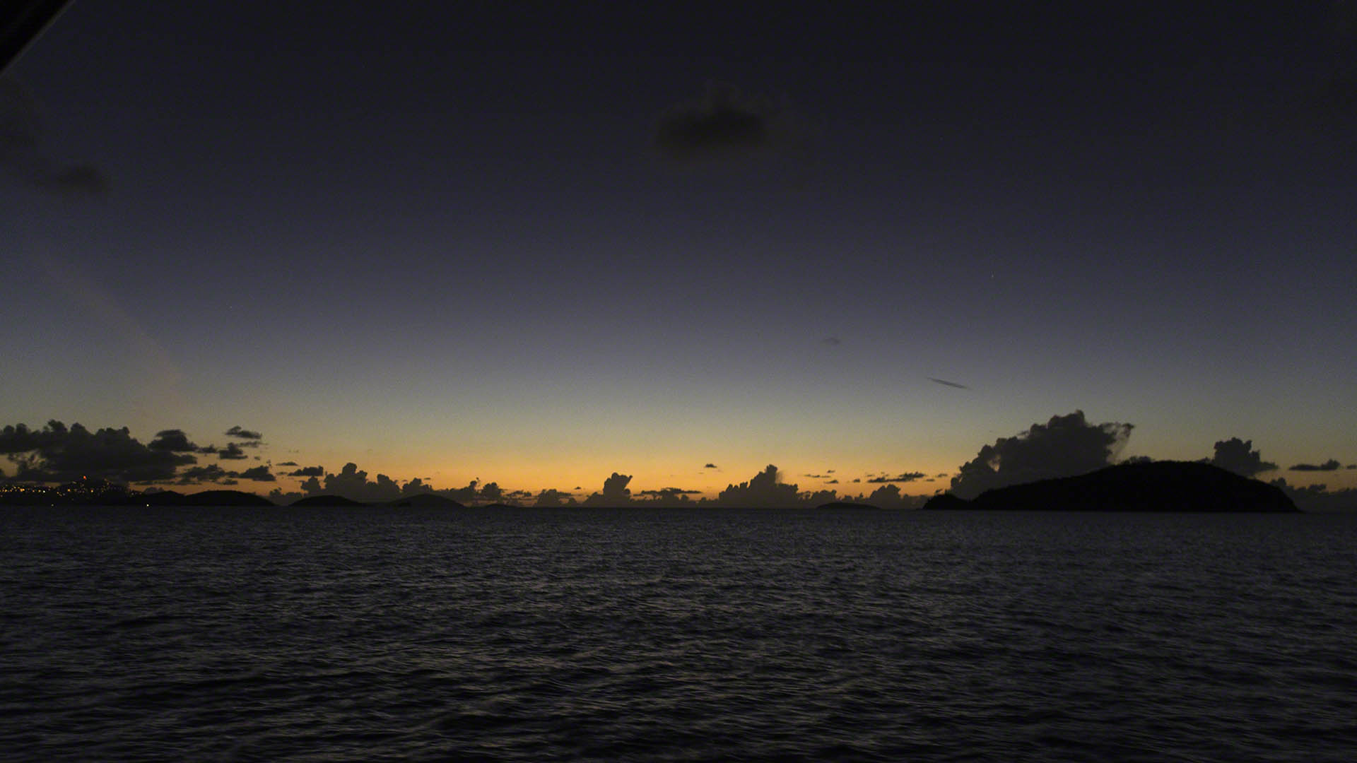 After a good night’s rest in wind still conditions in the lee of Prickly Pear, I woke up at dawn and soon thereafter I was underway. The main sail, with it’s new outhaul, was soon out and with full Genoa and the light wind behind me I was out of the channel and heading towards the Sir Francis Drake channel for the 20 NM downwind run to the USVI. The seas were dead still and at first it was a pleasure to glide along at 5 knots with hardly a sensation of movement. I had the two sails out on opposite sides, wing-on-wing, to make the most of the light wind. Then the winds slowed down even more and when I was doing less than 3 knots I opted to turn on the engine and furl the Genoa, keeping the mainsail up. After about 40 minutes of this the winds seemed to freshen again and I reverted back to being a sailboat, but my speed remained slow at 4 knots or so averaged. For a while I had a pleasant stretch doing 6 knots but then the winds died down again and I turned on the engine for the last stretch down to Cruz Bay in the USVI.