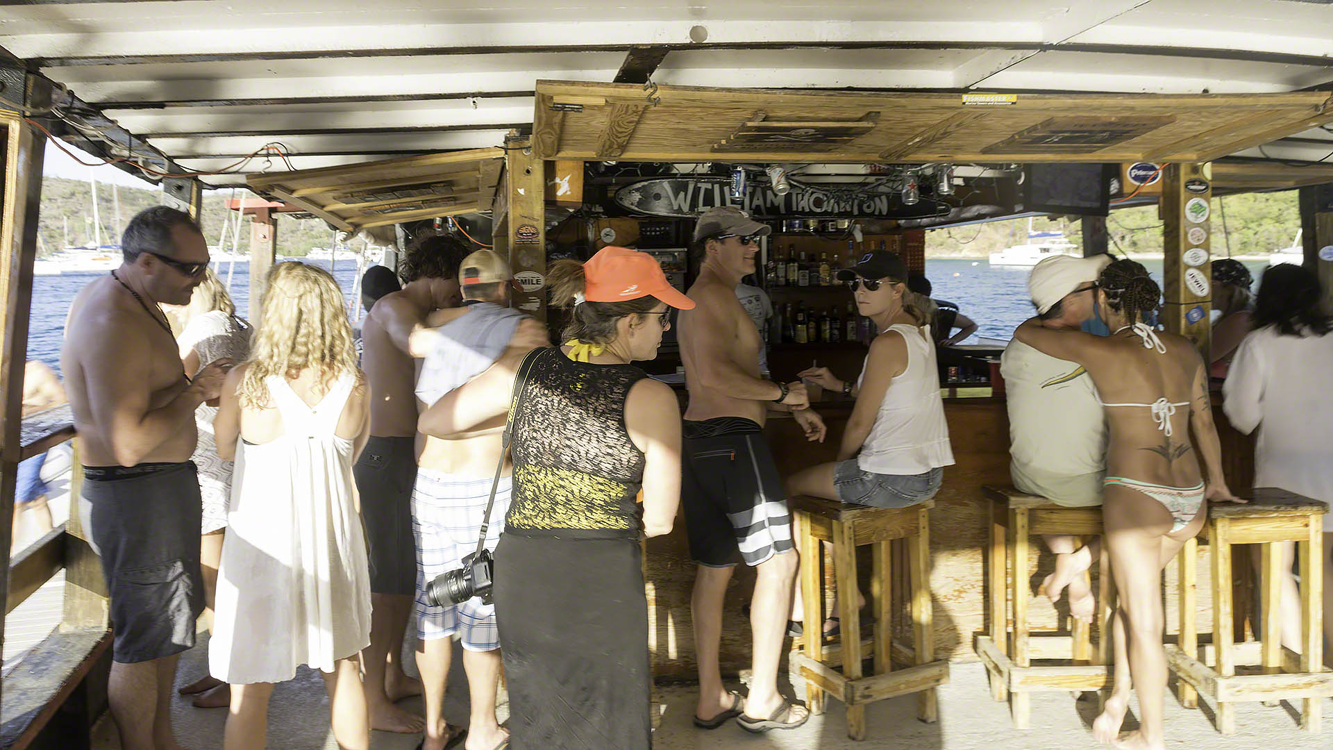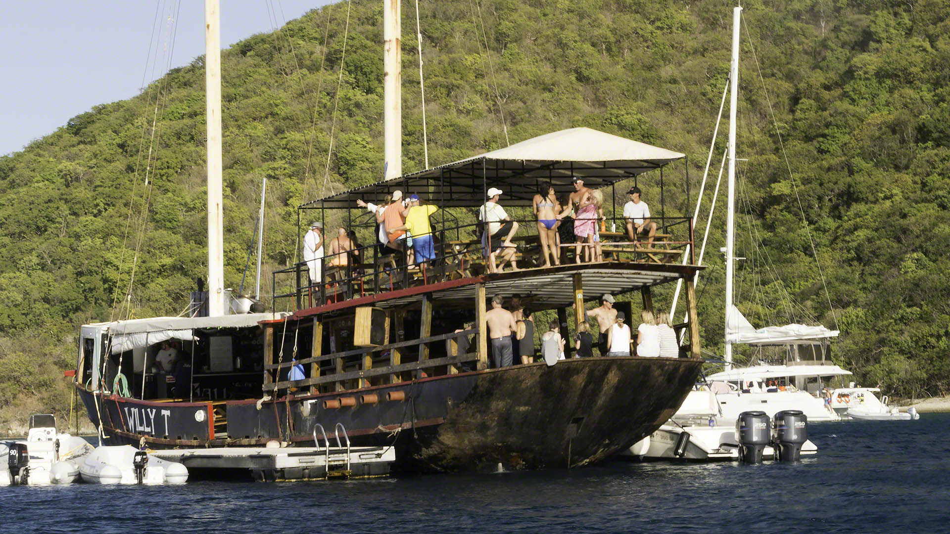 I took a short break and then decided to head ashore to see the new bar/restaurant at Pirate’s but the darned dinghy engine wouldn’t start at all. I’d test-run it while at the dock in Nanny Cay and it had fired up immediately and run for a couple of minutes; but now it wouldn’t. I tried removing and cleaning the spark plugs to no avail and ended up spending some time taking the carburetor completely apart and cleaning each piece. While nothing looked obviously wrong or gummed up, after putting the system back together I got it to fire up after just a few pulls and the engine seems to be running better than last season now that it has been serviced. I did a quick run ashore and stopped by the Willie T’s to see the antics before returning to Zanshin.