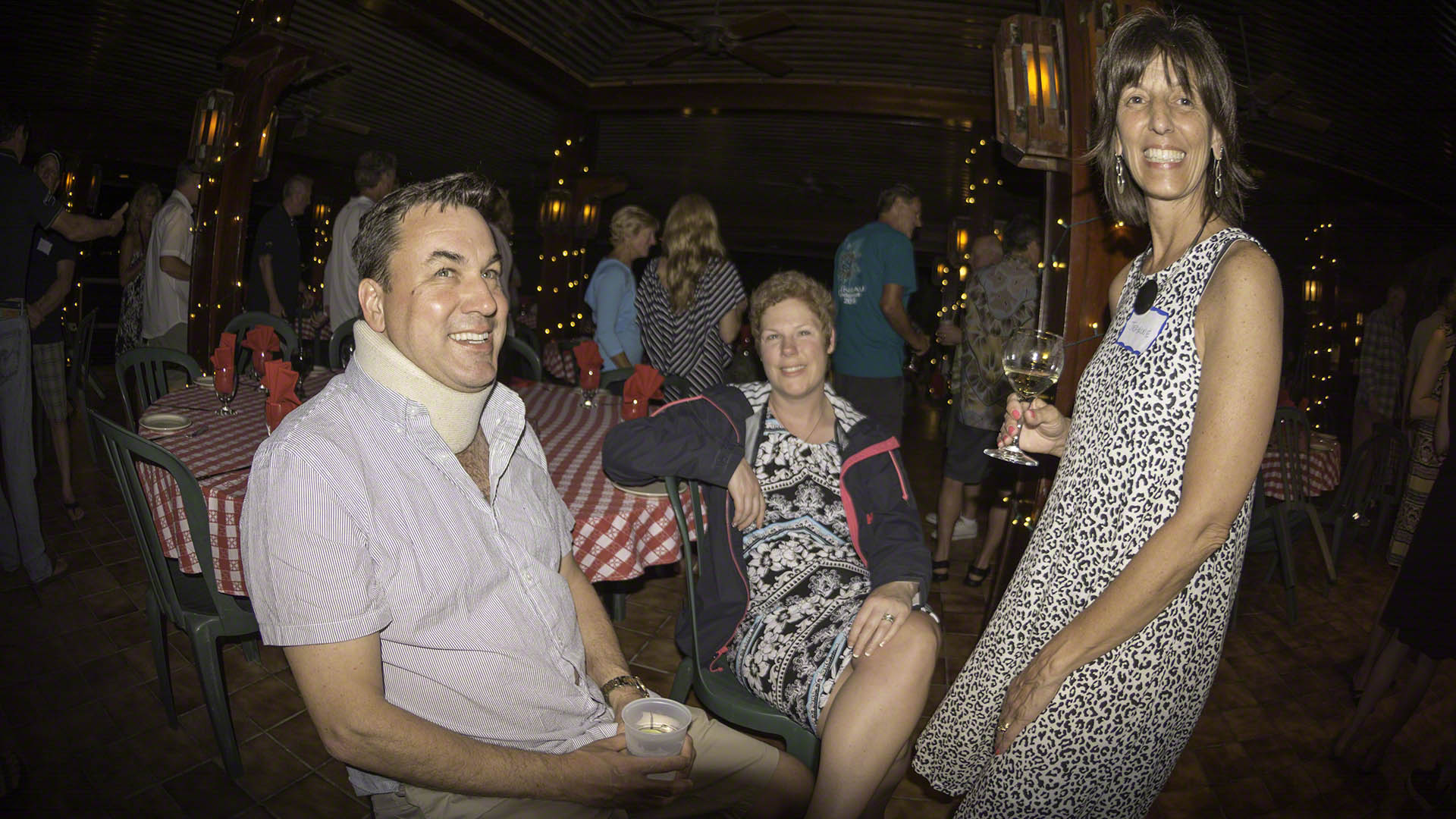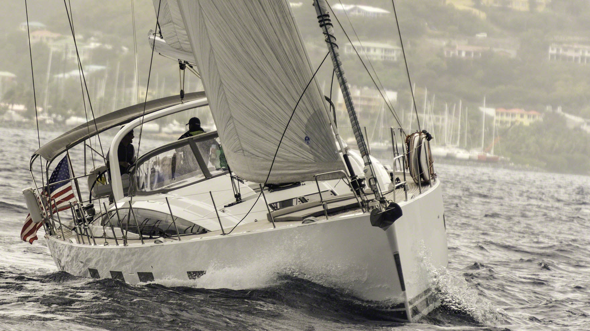 On the agenda for today was a sail up the Sir Francis Drake Channel all the way to the Bitter End Yacht Club in the North Sound. The weather was, for the BVI, pretty miserable – numerous rain showers came through and the sun rarely made any appearance at all. Malcolm took the helm for the long sail and we had a reef in both sails as we preceded Serenity out of the sheltered waters in the Bight. We did 2-3 long tacks and Serenity didn’t seem to be catching us by much but then we made a tactical mistake. In a rain squall which was so strong that Malcolm’s watch fogged up and I resorted to using my dive mask to see ahead we didn’t notice the wind shift in the rain and ended up losing all of the distance that we’d fought so hard to make upwind and after that we lost Serenity ahead of us. As it later turned out, she was being helmed by Gary Jobson which took the edge off our disappointment. We didn’t join the other boats at the Bitter End docks because Malcolm and I were going to have dinner upstairs at Leverick Bay and because I don’t like to dock in any case. We ended up dinghying from Leverick to the Bitter End because the shuttle only goes to Saba Rock. We had a couple of libations and were looking forward to hearing Gary Jobson give his presentation but were disappointed in that the buffet dinner was first on the agenda and we had to leave. Dinner at Leverick was fantastic, I had their lamb creation and think that the food at Leverick Bay was consistently the best I’d had in the BVI.