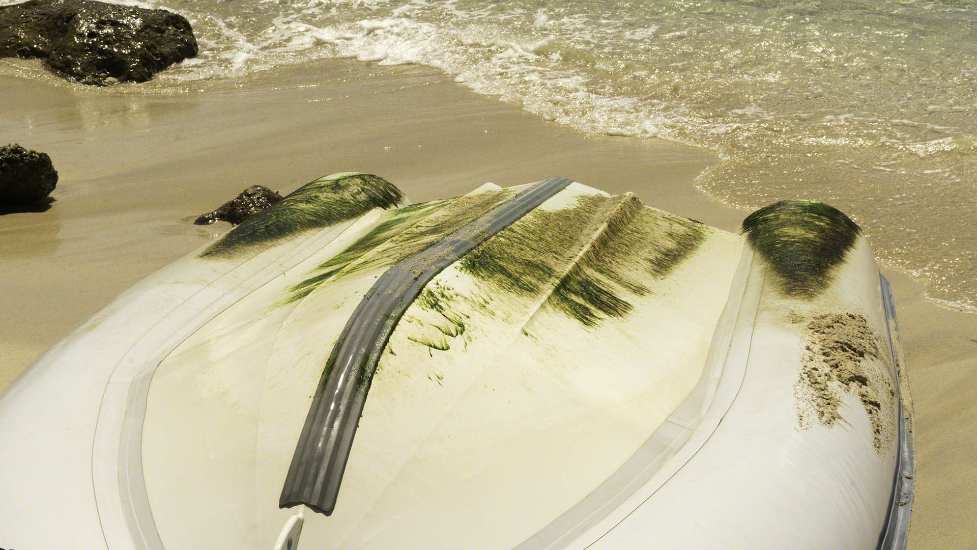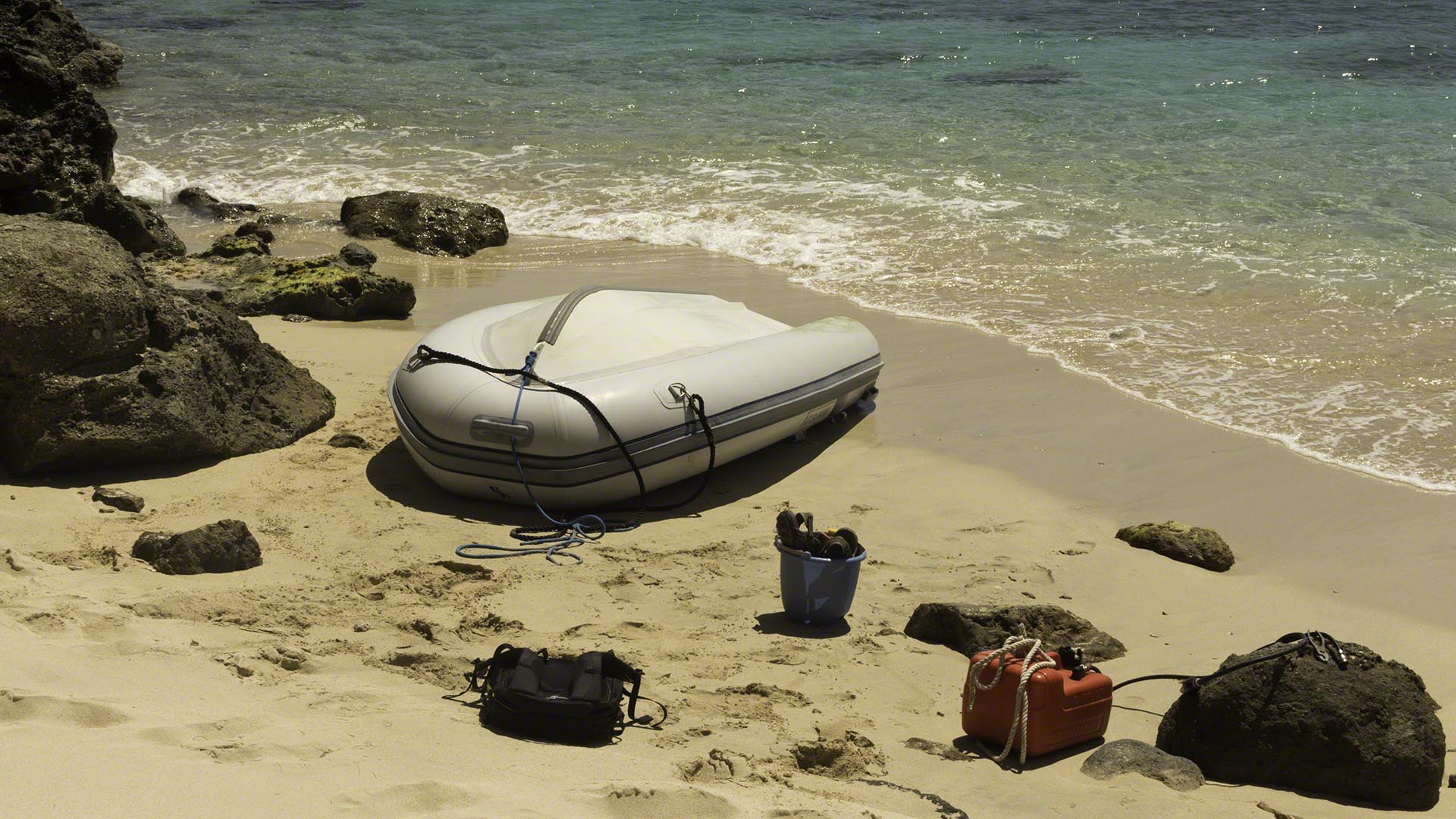 In a fit of energy, I took my implements of destruction (a bucket, Scotch Pad, Pine-Sol, paint scraper and a pair of pliers) on the dinghy and headed to a small sandy beach on Prickly Pear named “Honeymoon Beach” and put it to use as a cleaning station for the bottom of my dinghy. Much of the growth had been removed by the long passages and frequent sailing, but enough remained to form what biologists might term a biotope and I wanted a pristine landscape down there without any features and no place for flora or fauna to call home. First the inside of the dinghy was cleaned with some water and Pine-Sol, then the dinghy was flipped over to let me scrape off the hard stuff with the paint scraper and then I used wet sand and the Scotch pad repeatedly to get rid of the green stuff.