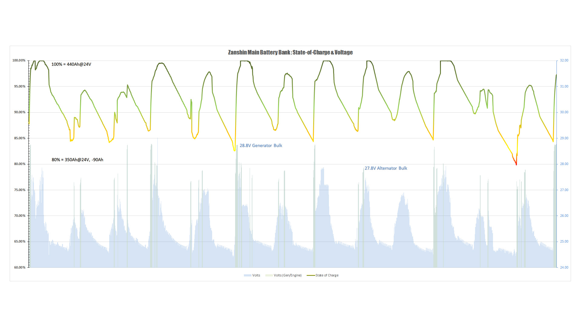 The last picture is from an Excel sheet that I have which shows Zanshin’s energy use curves. The upper part is the SOC (State-Of-Charge) of the main battery bank over time while the lower portion shows the corresponding voltage, with green portions marking when either the generator or the main engine is running. This was over a period of 13 days and it is easy to see the typical daily power profile. On average my consumption is around 3.5A which comes mostly from the fridge and freezer and from the anchor light at night. But with the solar panels during the day and my average engine/generator runtime of 45 minutes per day I rarely go below 80% capacity and this means that the batteries will last a long time. The engine runtimes aren’t that bad considering I sail almost every day and need 10-15 minutes at the beginning and end of each journey to leave and enter an anchorage.