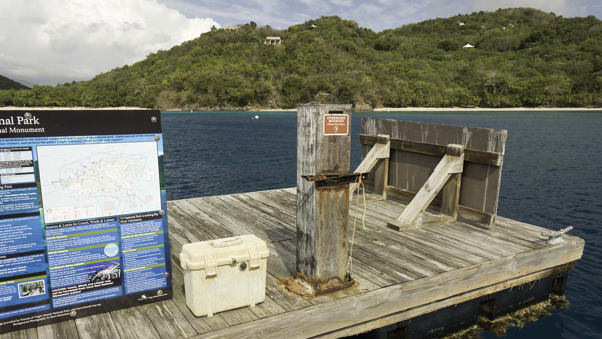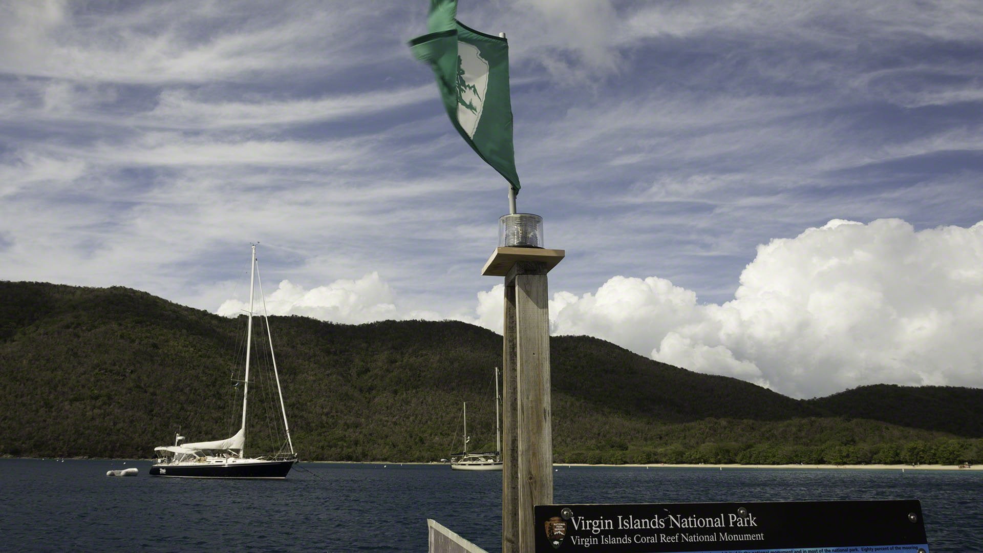I didn’t sleep well at all this past night, I had a very light sleep due to my subconscious worries about dragging should a strong wind arise. Despite the odd gust during dark the boat didn’t move and even when the wind picked up significantly at about 09:00 after I’d had my morning coffee and breakfast the boat remained solidly in place. It wasn’t until I had about half of my chain raised that I felt the anchor’s hold on the ground loosen and it started hopping across the rocky bottom. I put up only a triple-reefed Genoa for the downwind run to Great Harbour and still made a good 7 knot most of the way as the wind was once again above 20 knots. At Great Harbour I took a mooring ball then showered and shaved and put on a collared shirt so that I could greet the customs officials in both the BVI and USVI looking semi-presentable. At the customs office I took out my papers but didn’t have the big yellow clearance form – I’d inadvertently filed it away with the new papers that I’d received when clearing in. The officer was kind enough to let me fill in a new form rather than return to the boat and after my payment of $2 to clear out I was on my way. The sail to Cruz Bay was very fast, I had double reefed both sails but was still flying along at 8 knots minimum and with 10 knots measured on the GPS for extended periods. I took a mooring just around the corner and departed via dinghy to the customs office, then remembered that dinghy theft is not unknown at that dock, so returned to Zanshin to get a padlock. I was applying some WD-40 to loosen the padlock’s mechanism when I glimpsed my dinghy drifting off downwind – my quickly tied knot hadn’t been a bowline and hadn’t held. I quickly stripped to my swim trunks and jumped into the water to retrieve it. By the time I’d reached it I was out of breath as the wind was pushing it away just a bit slower than I could swim to reach it. Nevertheless I made it, got aboard, zipped back to Zanshin and took a quick shower to wash the salt off before once again heading to the U.S. customs and immigration office in St. John.
