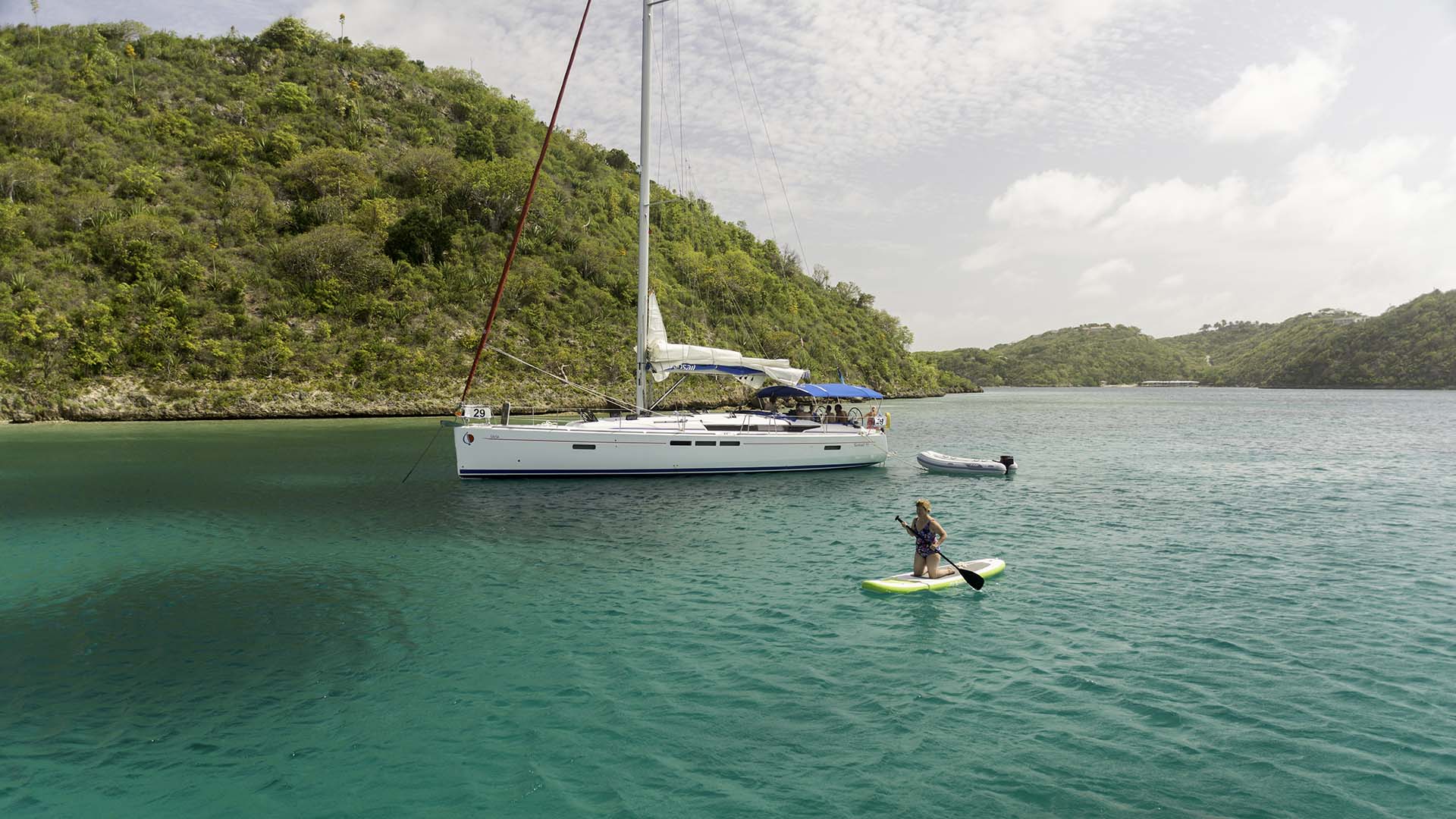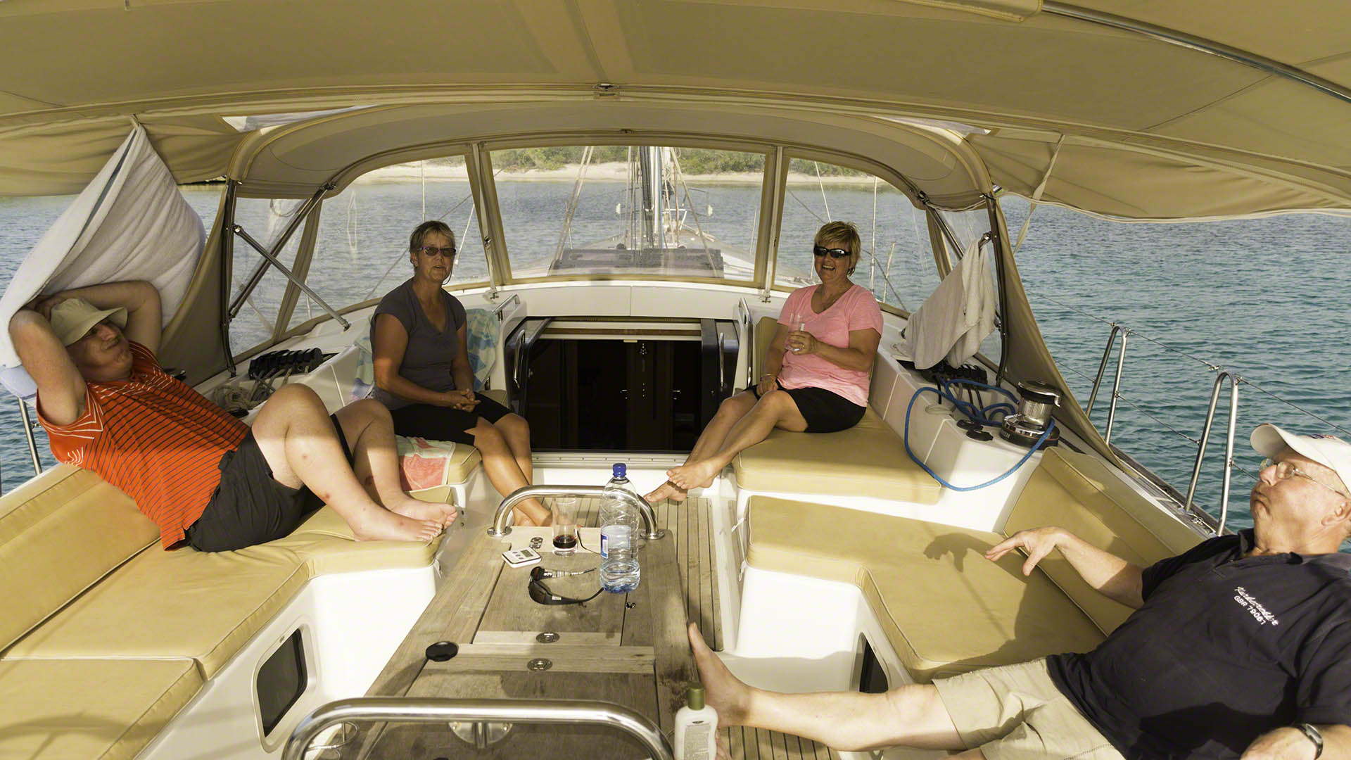 Ahhh, “Lay Day” – a day of sailing and culinary debauchery at Green Island! Angela, Stephen, David, Linda and myself took off from Falmouth on a spirited upwind sail to the anchorage at Green Island with Stephen at the helm for the majority of the trip and we only had to tack twice to make it there and got to see a number of our course marks on the way. Once there I was surprised to see that all of the moorings were taken but we snuck past two boats and anchored close to the shoreline in just a couple of feet of water (under the keel, of course) and proceeded to deplete our stocks of bubbly, wine and beer. The paddle board got a workout as we all tested our balance, I had the unfair advantage of having had practice. A number of the competitors in our class were in the anchorage as well, but they departed earlier than we expected and by the time we’d eaten our steaks, salad, sausages and had our frozen grape dessert all of the racers had already departed.
