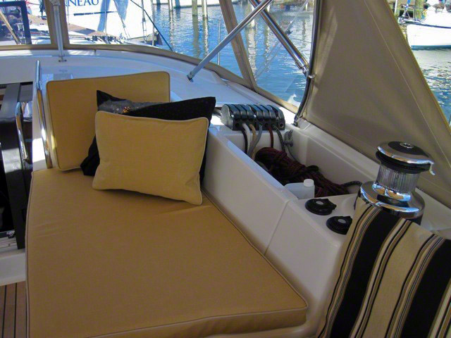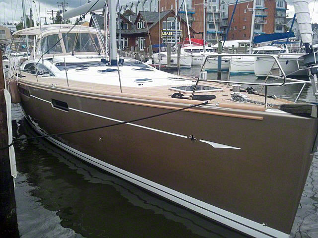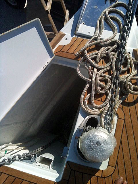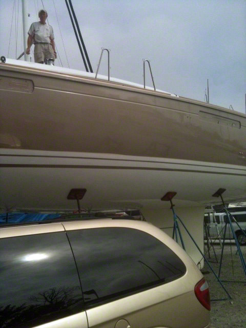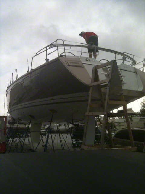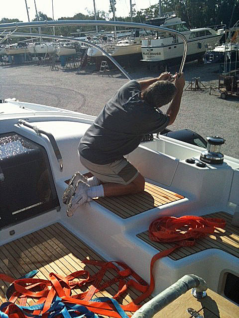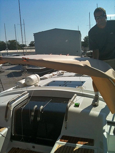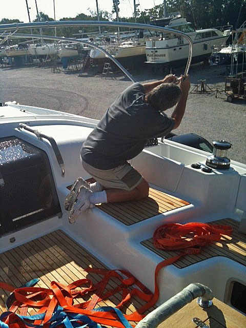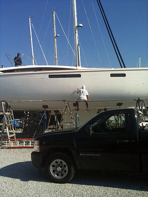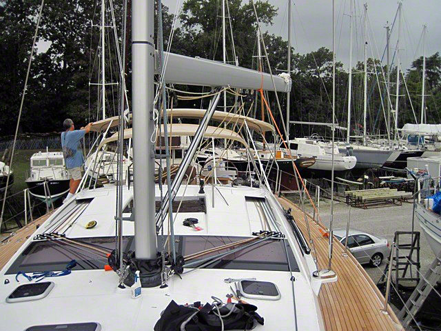 September 29, 2011Mark sent these pictures from the commissioning process showing the nice āChampagneā Awlgrip colour and the mast stepped as well as the bimini and dodger being mounted / fitted.
