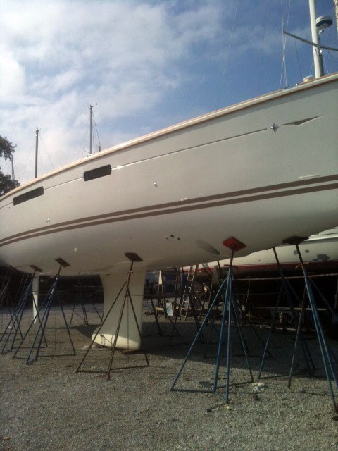 The factory tour in July was my first glimpse of Zanshin and the subsequent wait for her to be completed and shipped to the USA for commissioning and delivery was a long one, but she has finally arrived and has been placed into the yard on the hard. A lot of work lies ahead for the commissioning crew since she has to be partially ready and presentable for the Annapolis Boat Show in early October.