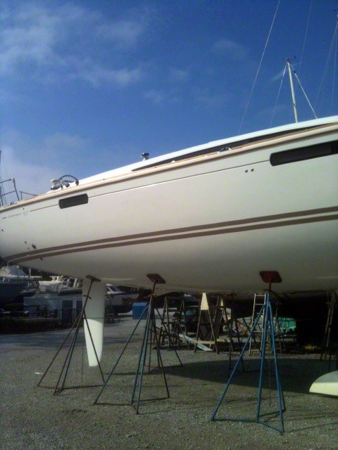 Two pictures taken just after the Awlgrip work on Zanshin was completed and the covers removed. | ||||||||