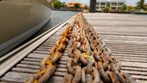 There are several tasks here, the chain needs to be removed from the boat and mechanically cleaned to remove the big rust spots. Then treated with Ospho and otherwise passivated. Perhaps the chain needs to be end-for-ended and finally the chain needs to get painted markings so that I can visually see how much has been let out. I’ve been using plastic inserts, but they are difficult to see and tend to fall out. This is a major job which I will contract out to the same people doing my neighbor’s chain. I removed the chain from the locker and put it onto the dock; that revealed some major issues with the sections of chain that were at the bottom of the locker. The chain locker has two drain holes that are very close to the waterline and at sea they will occasionally take on small amounts of seawater. The chain locker has a slope so that there is always a small puddle of water at one end, and this has caused some major rust on the chain. Some of the links are corroded so badly as to cause a potential break danger in moderate conditions and would surely break under anything approaching the original working load of the chain.